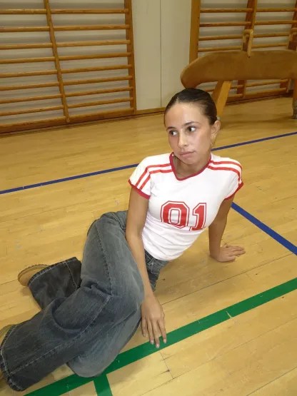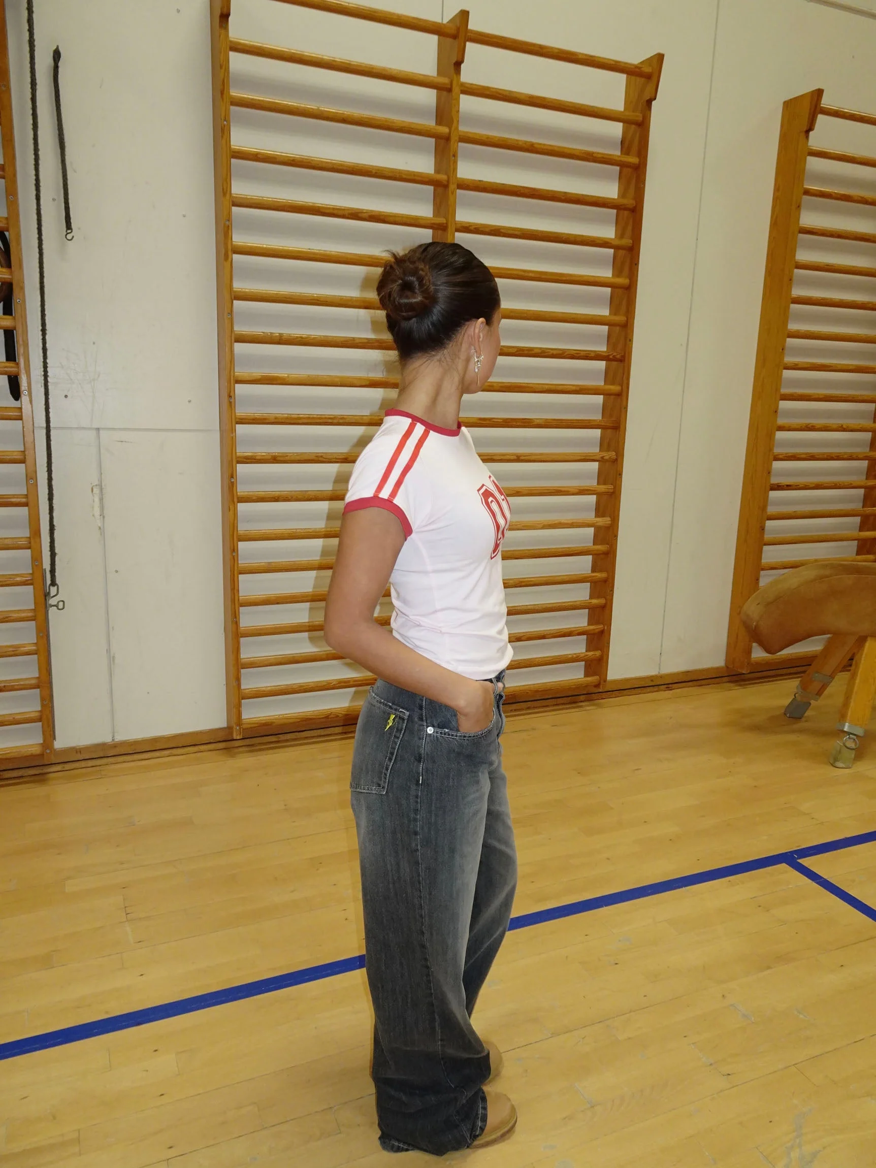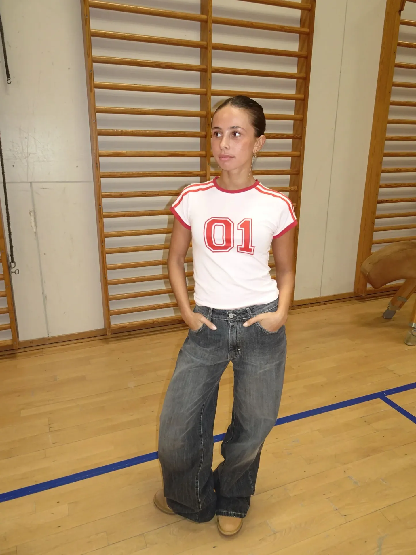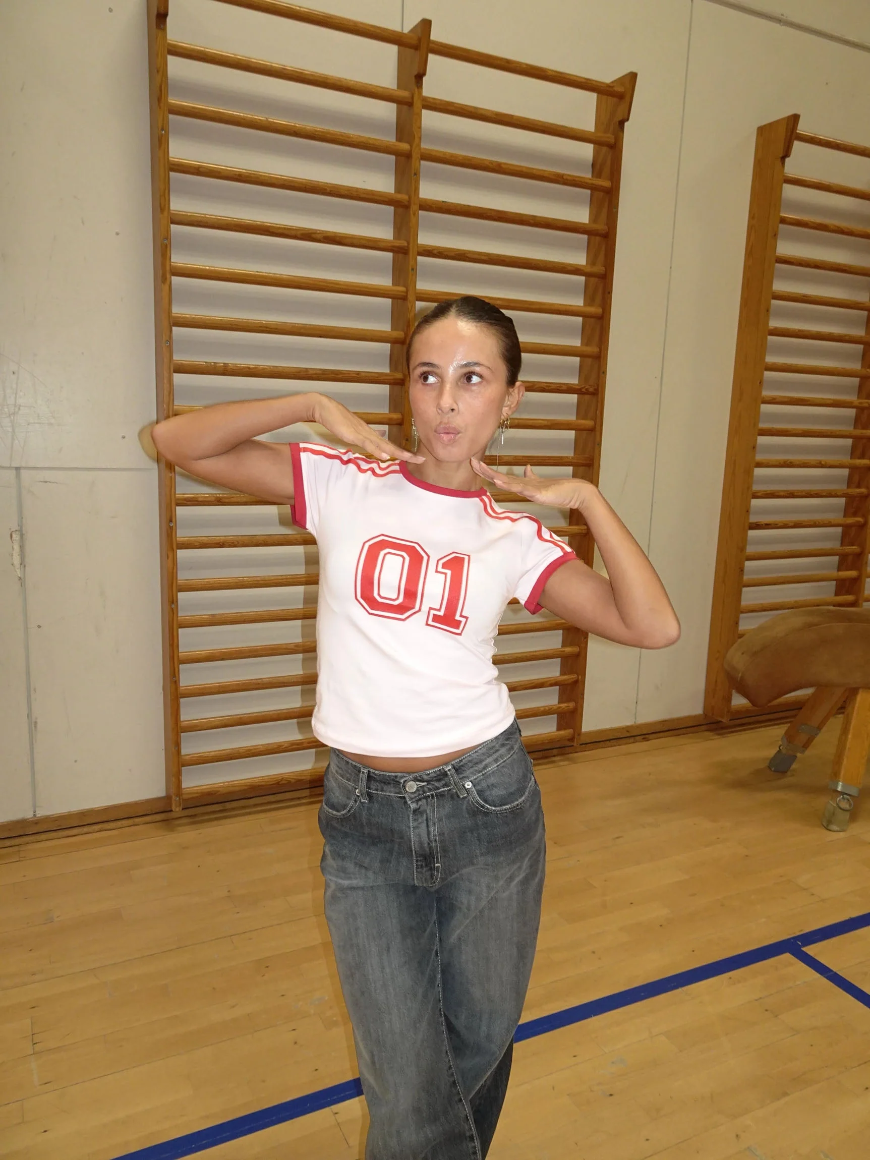 This fitted, short t-shirt combines sporty style with modern details. The pink color is elegant, while the red elements on the number "01," the sleeve stripes, and the edges of the sleeves and neckline give it a fresh and energetic look. The slim fit and sporty details make it a perfect choice for both casual days and stylish outfits. A must-have for a wardrobe with a sporty twist.