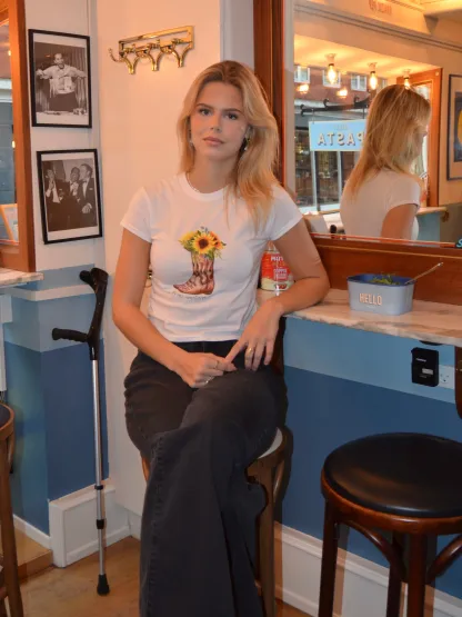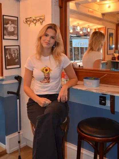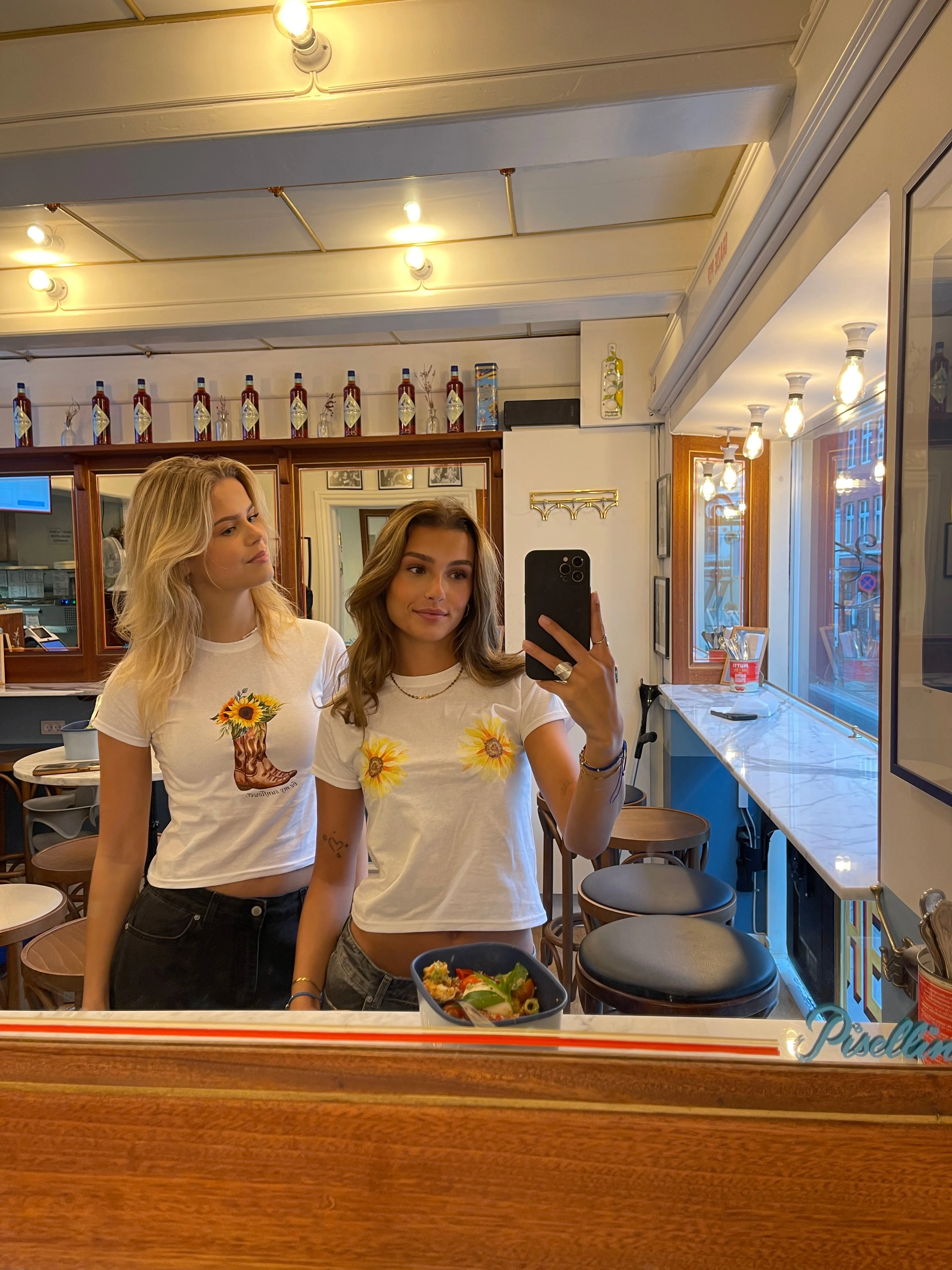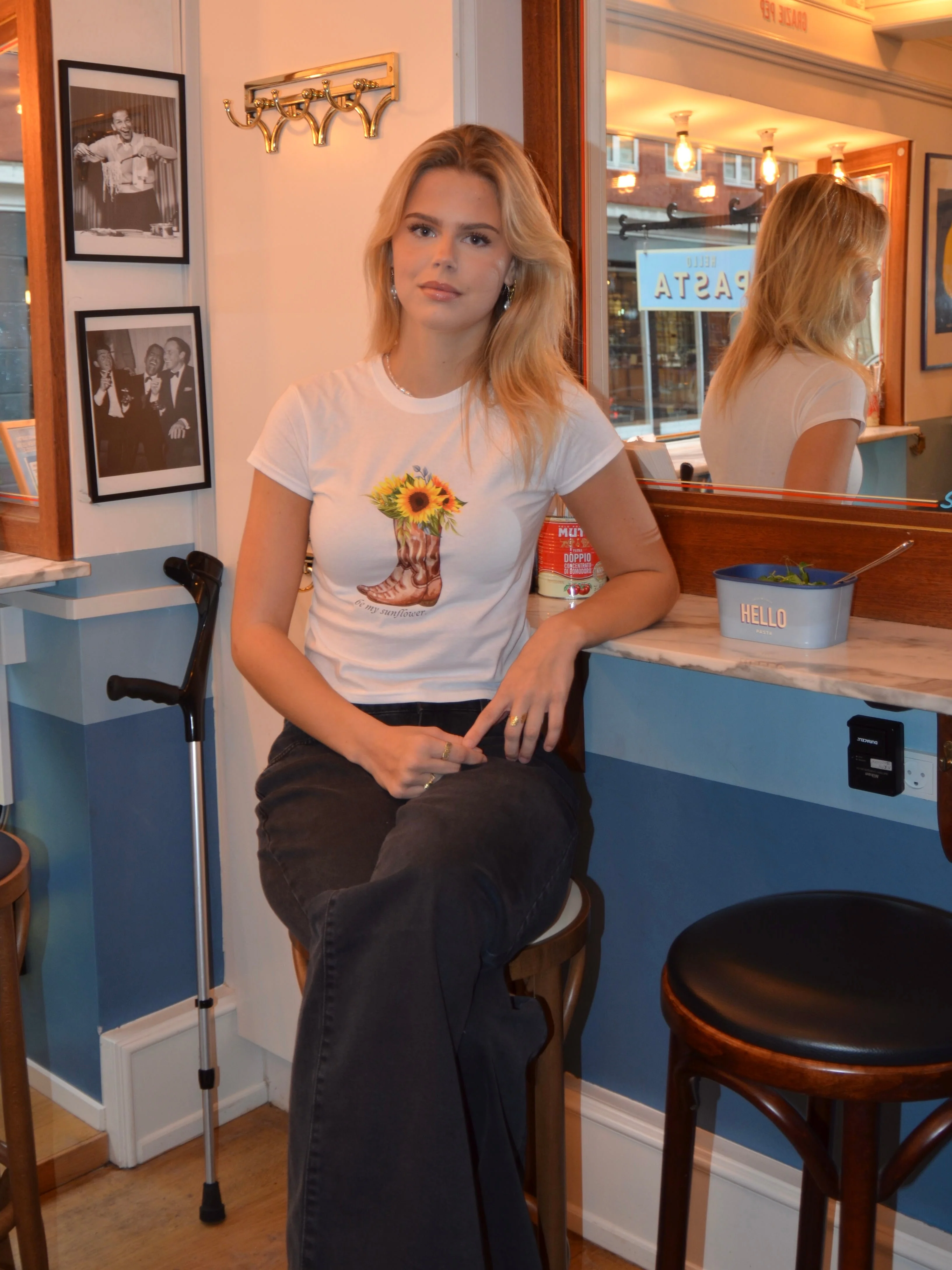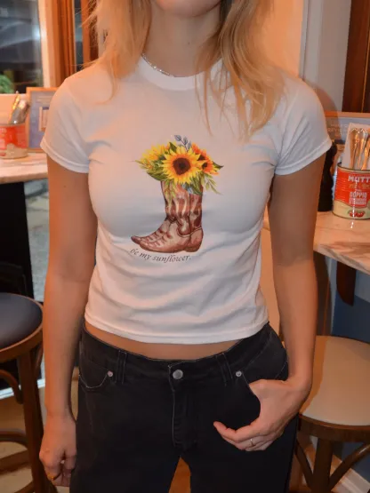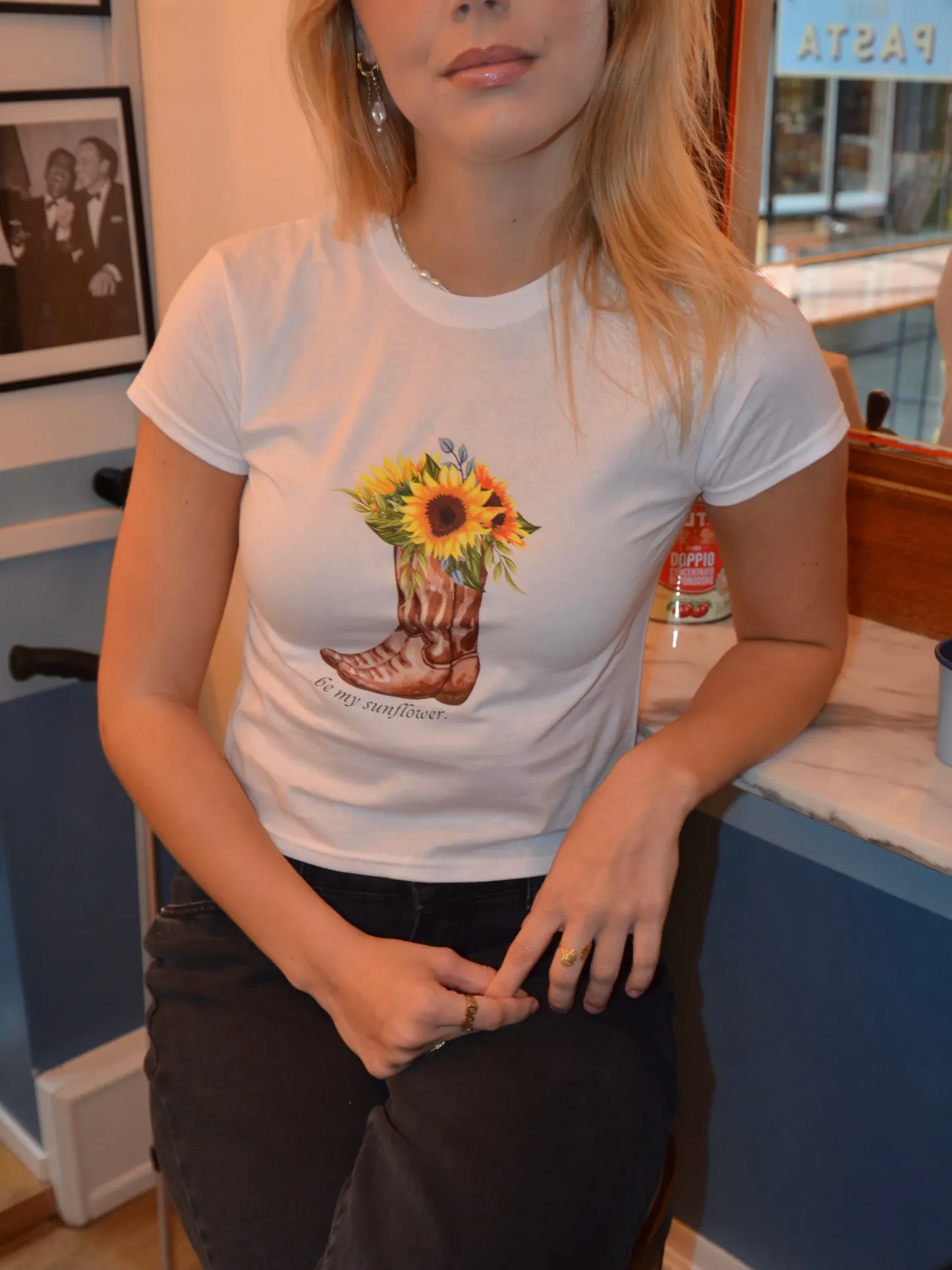 Baby tee with the text "be my sunflower" and a sunflower and cowboy-boot on it. Our tees are from Fruit of the Loom and made from super soft and comfortable quality.