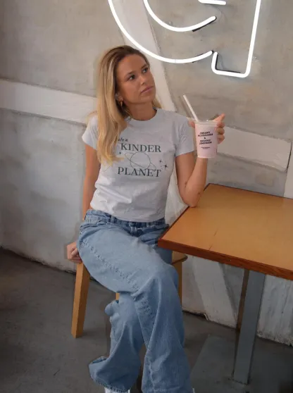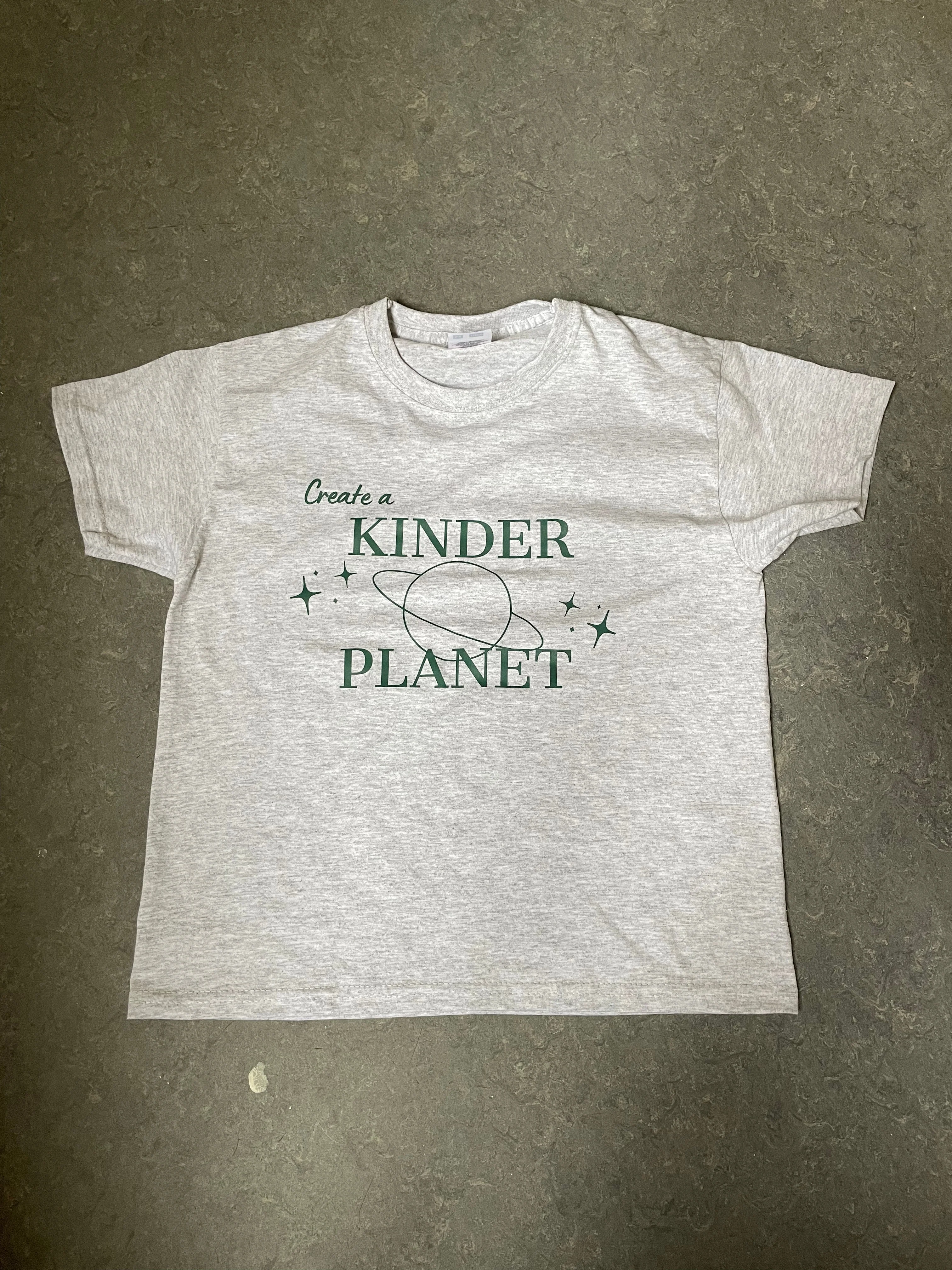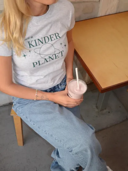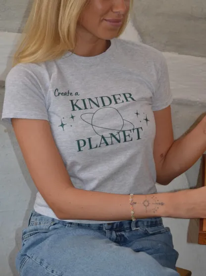 Baby tee with a planet and the words "create a kinder planet". Our tees are from fruit of the loom and in a super soft and comfortable quality.