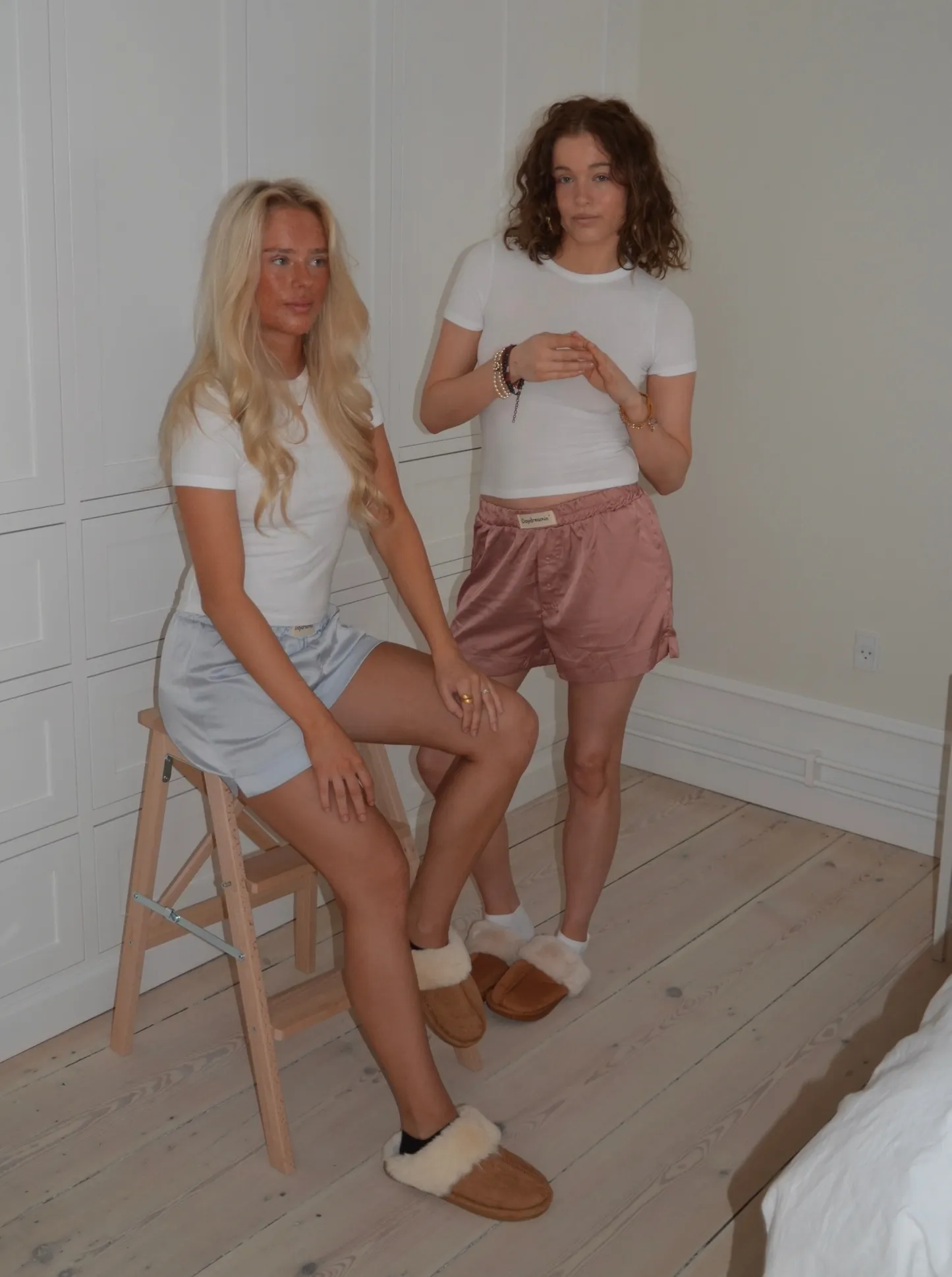 These satin shorts are short and loose fitted. They have elastic at the waist which makes them extra comfortable and a label with the text "Daydreamin'". As an extra detail, they have 2 decorative buttons at the front and a small slit at the sides.