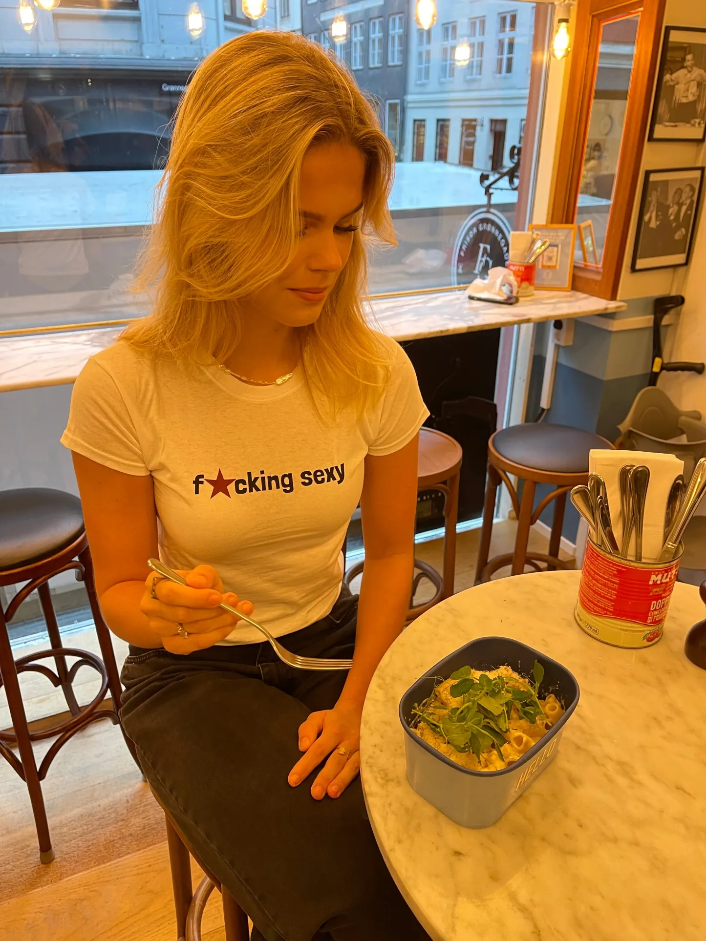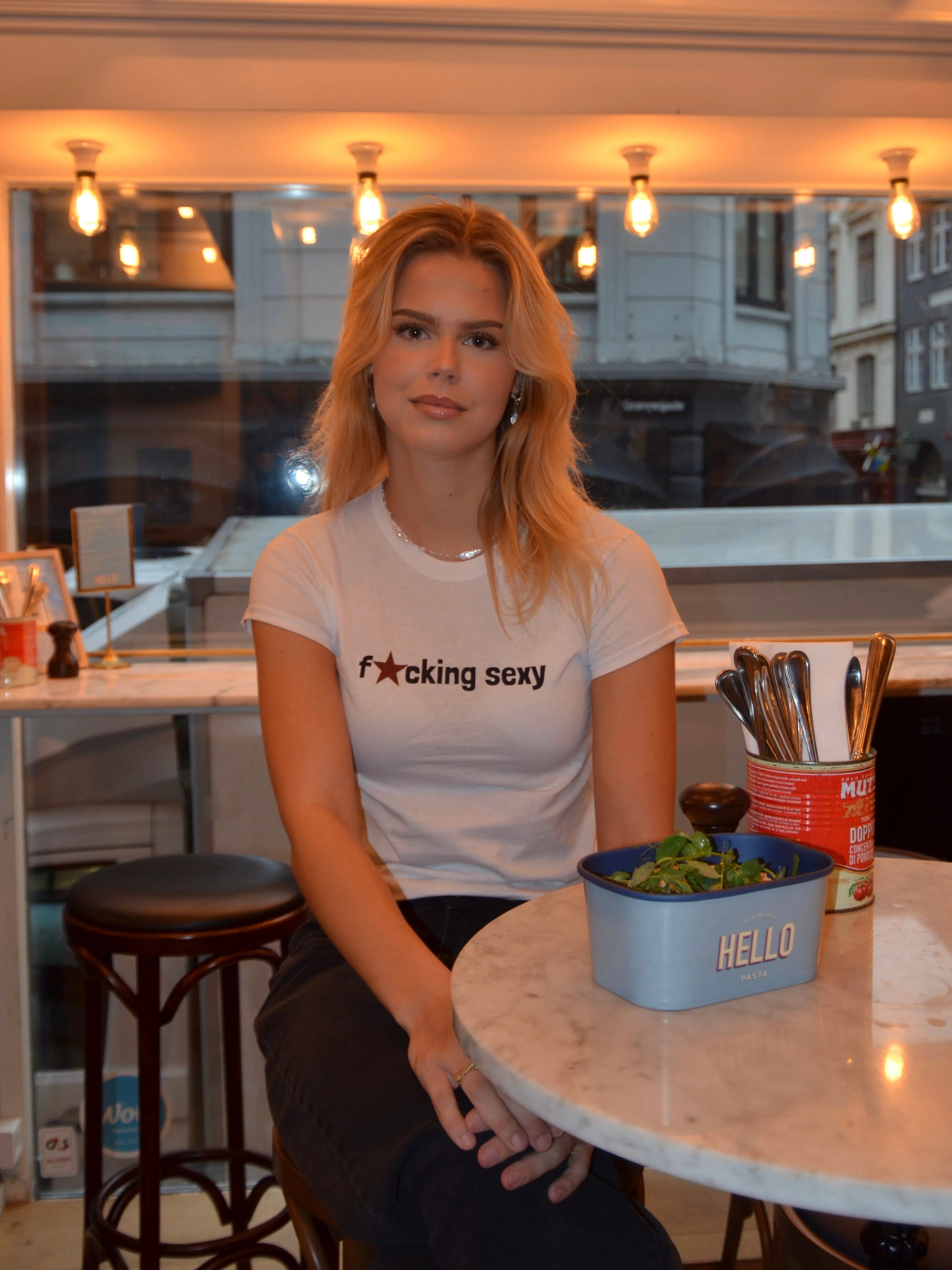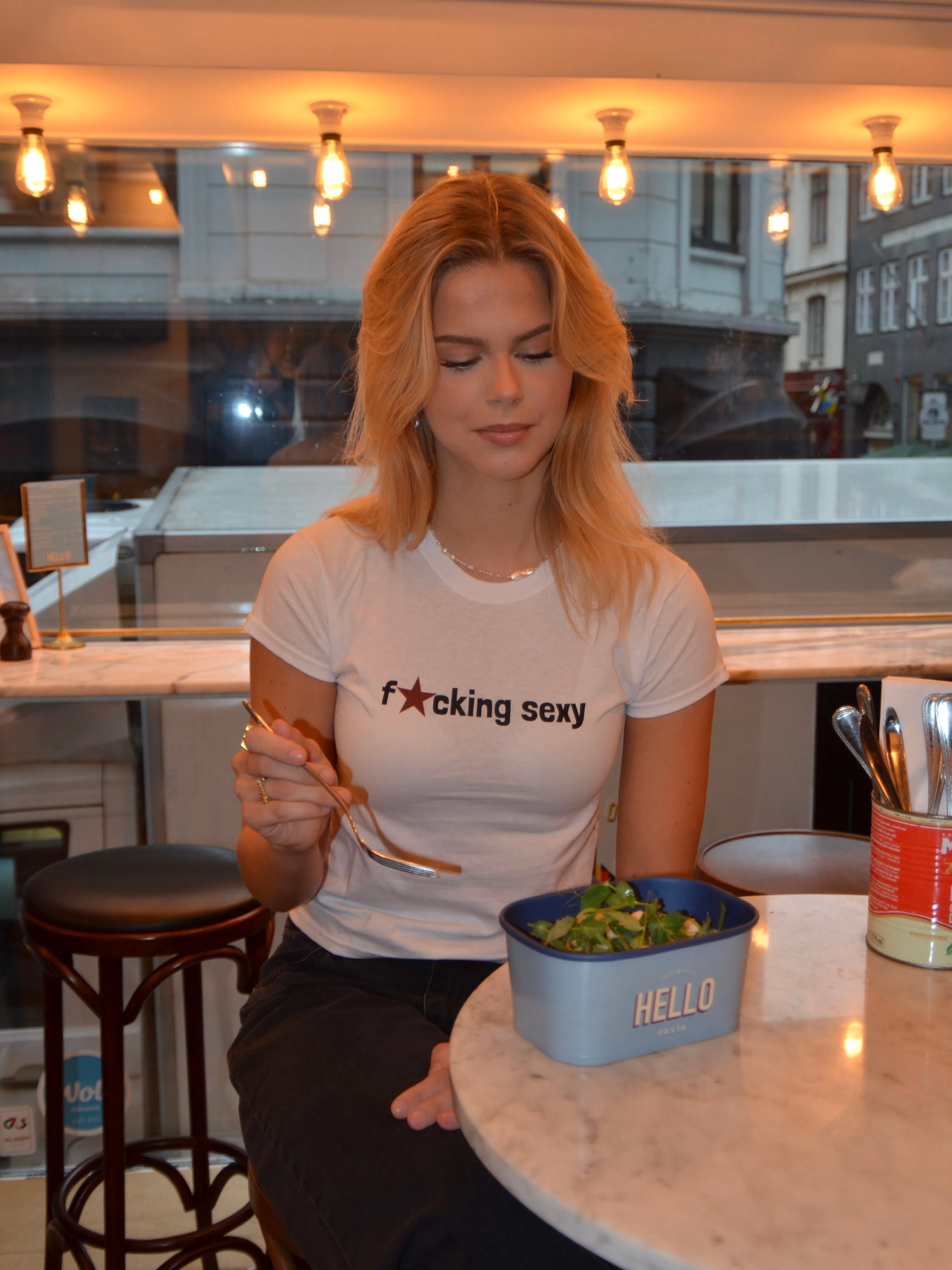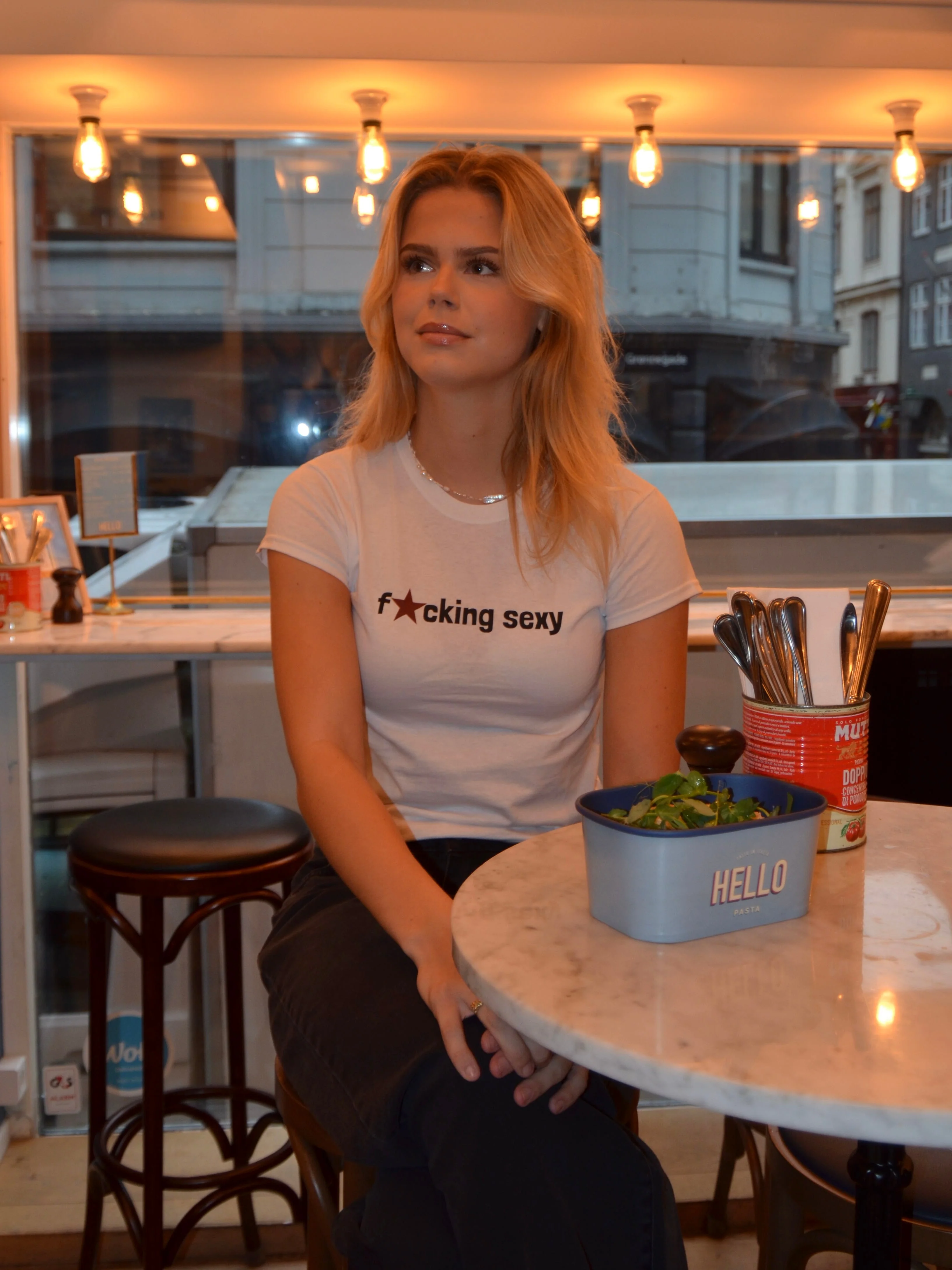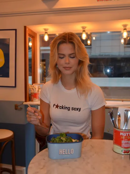 Baby tee with the text "fucking sexy" on it. Our tees are from Fruit of the Loom and made from super soft and comfortable quality.
