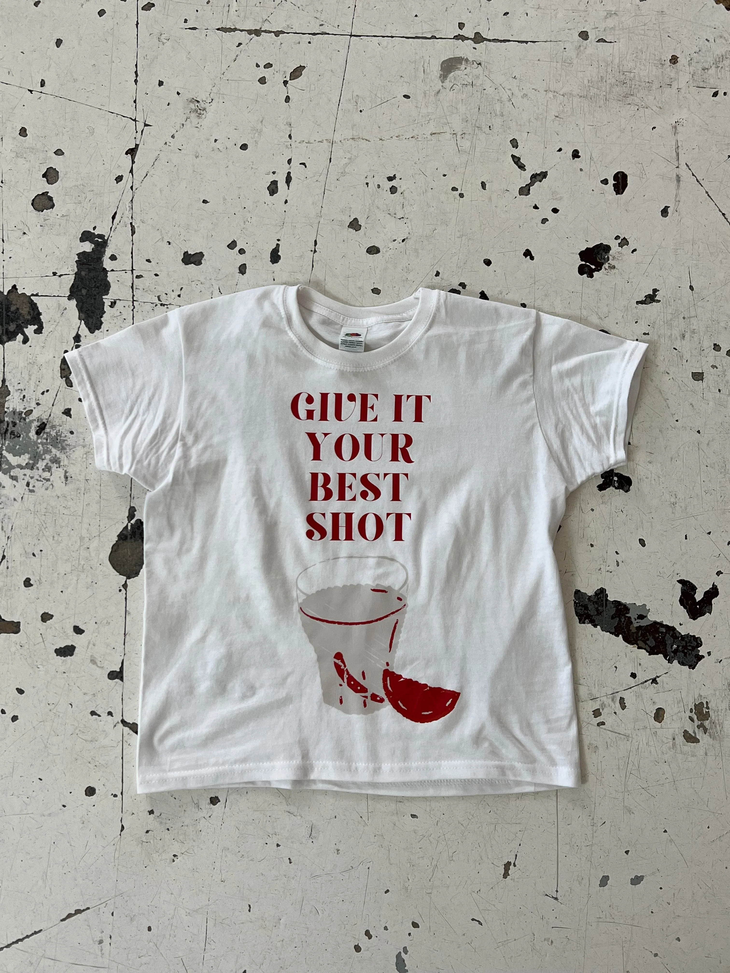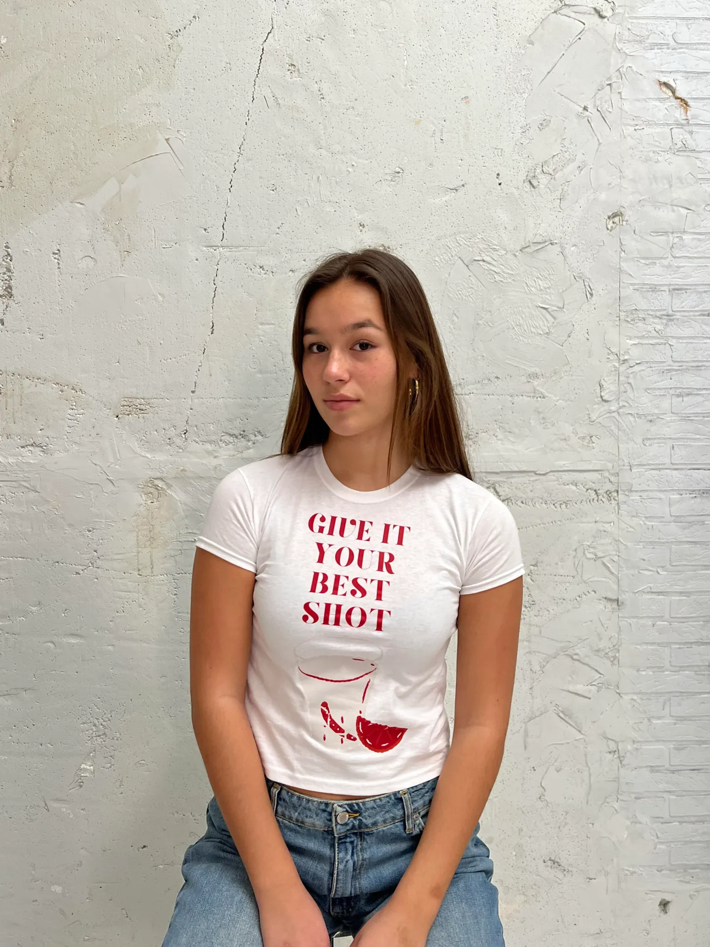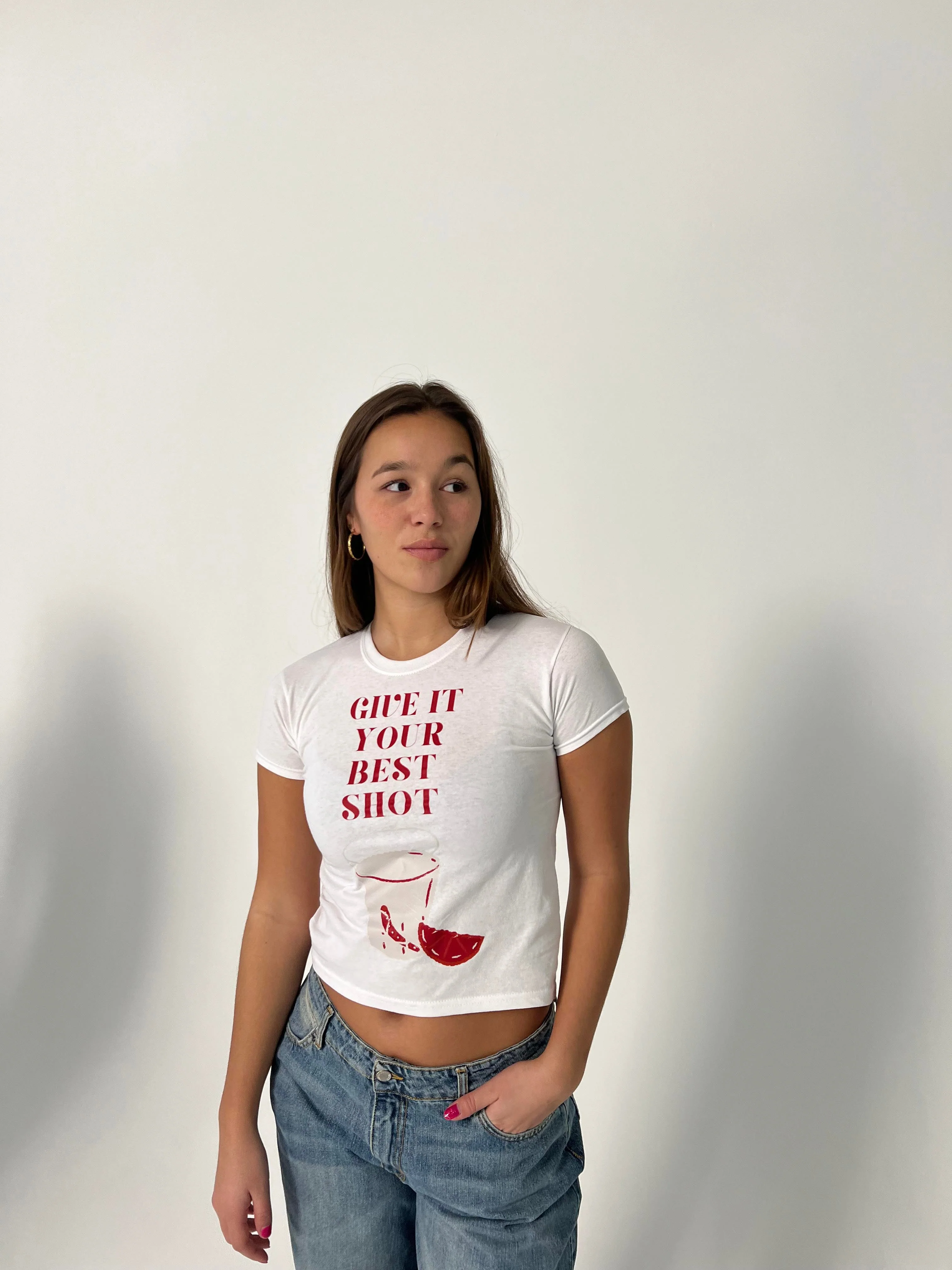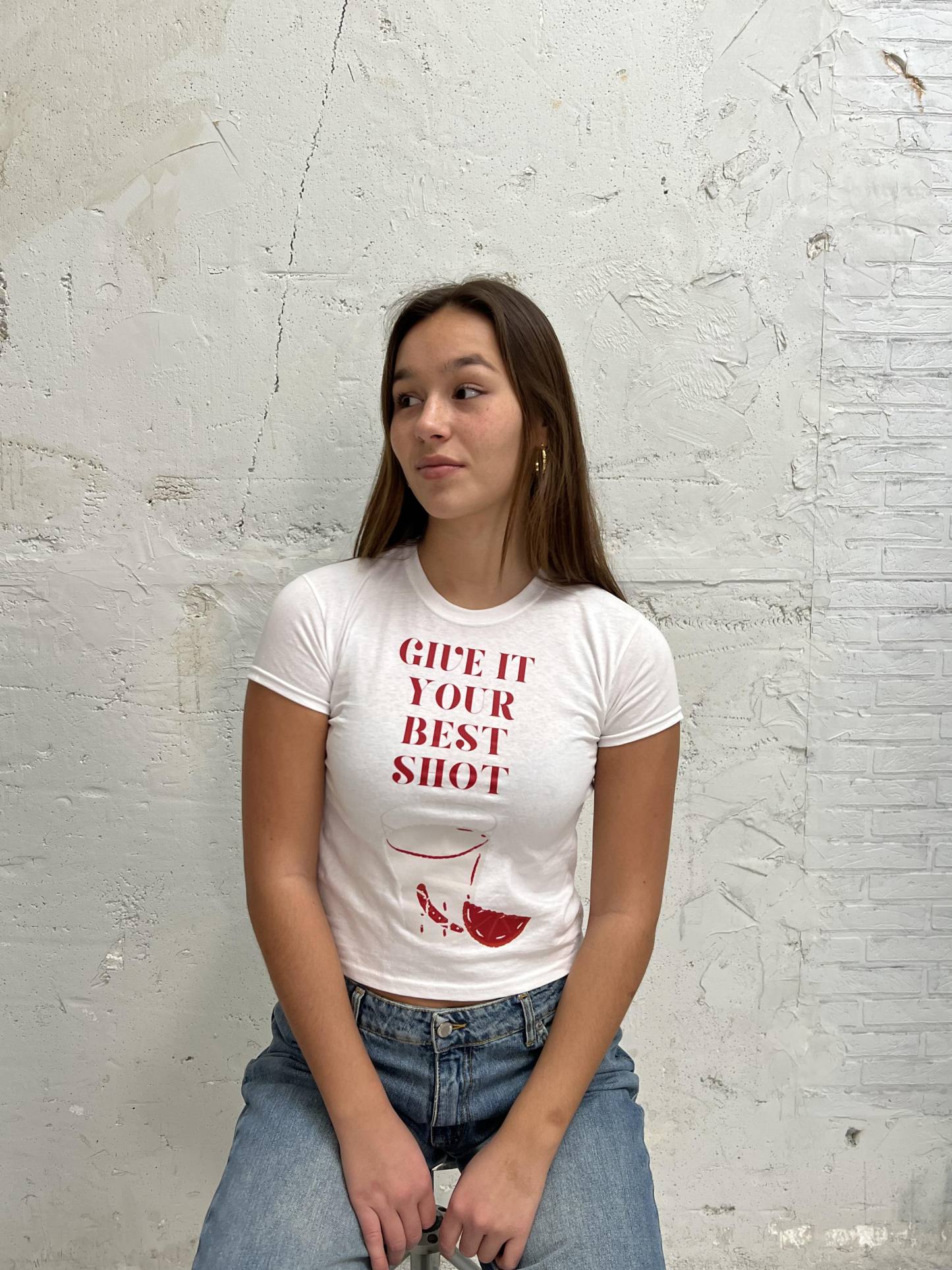 Baby tee with red "give it your best shot" writing and shot glass and lemon. Our tees are from fruit of the loom and in a super soft and comfortable quality.