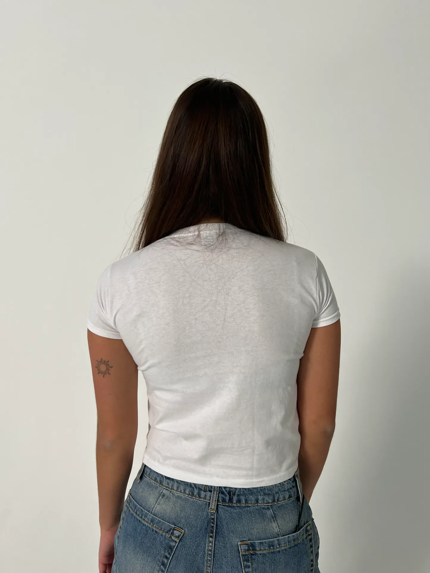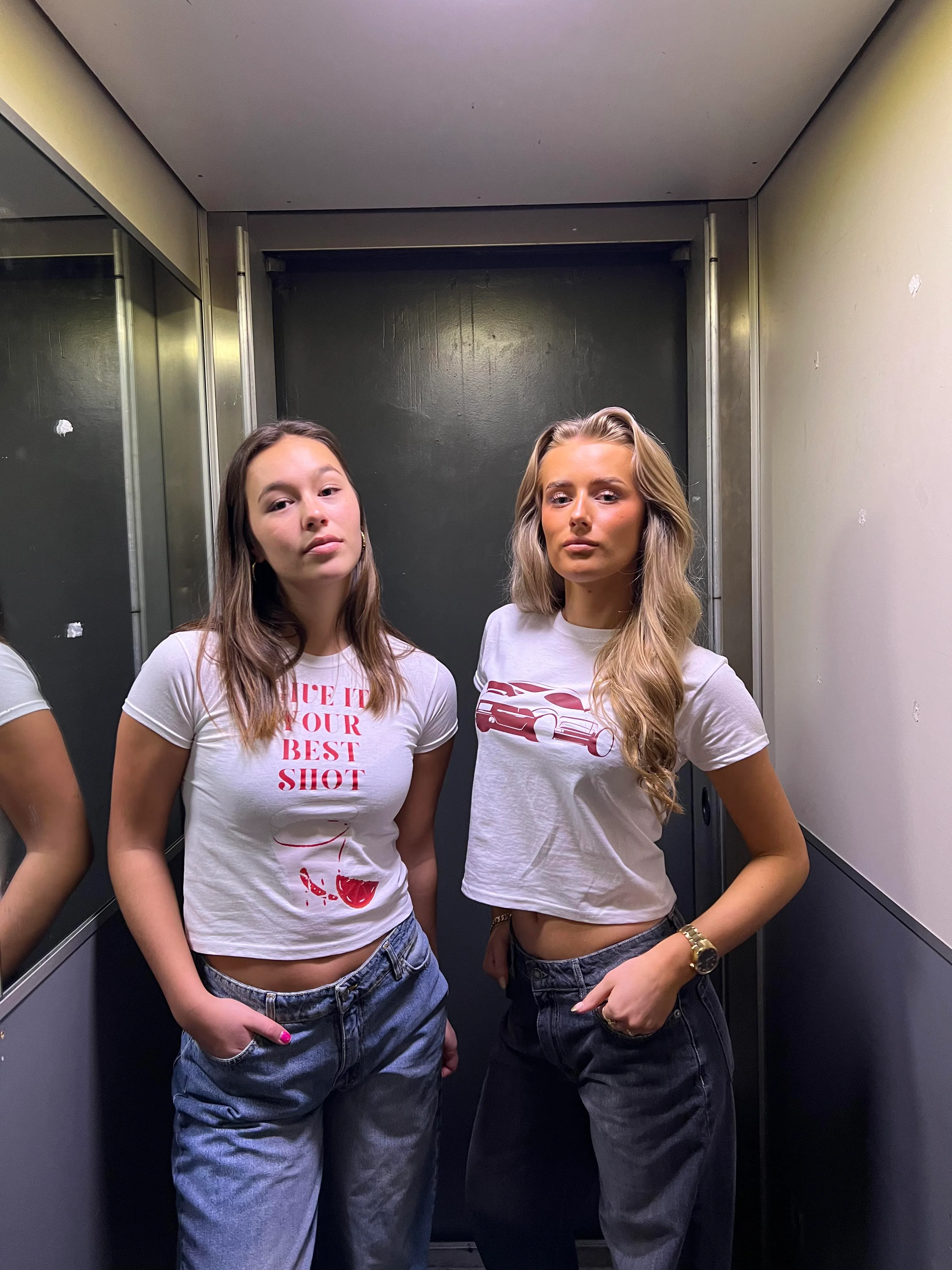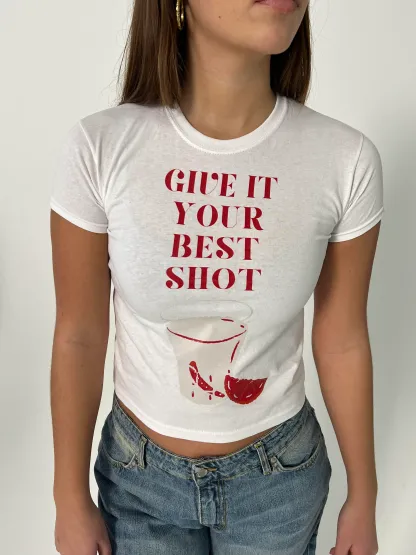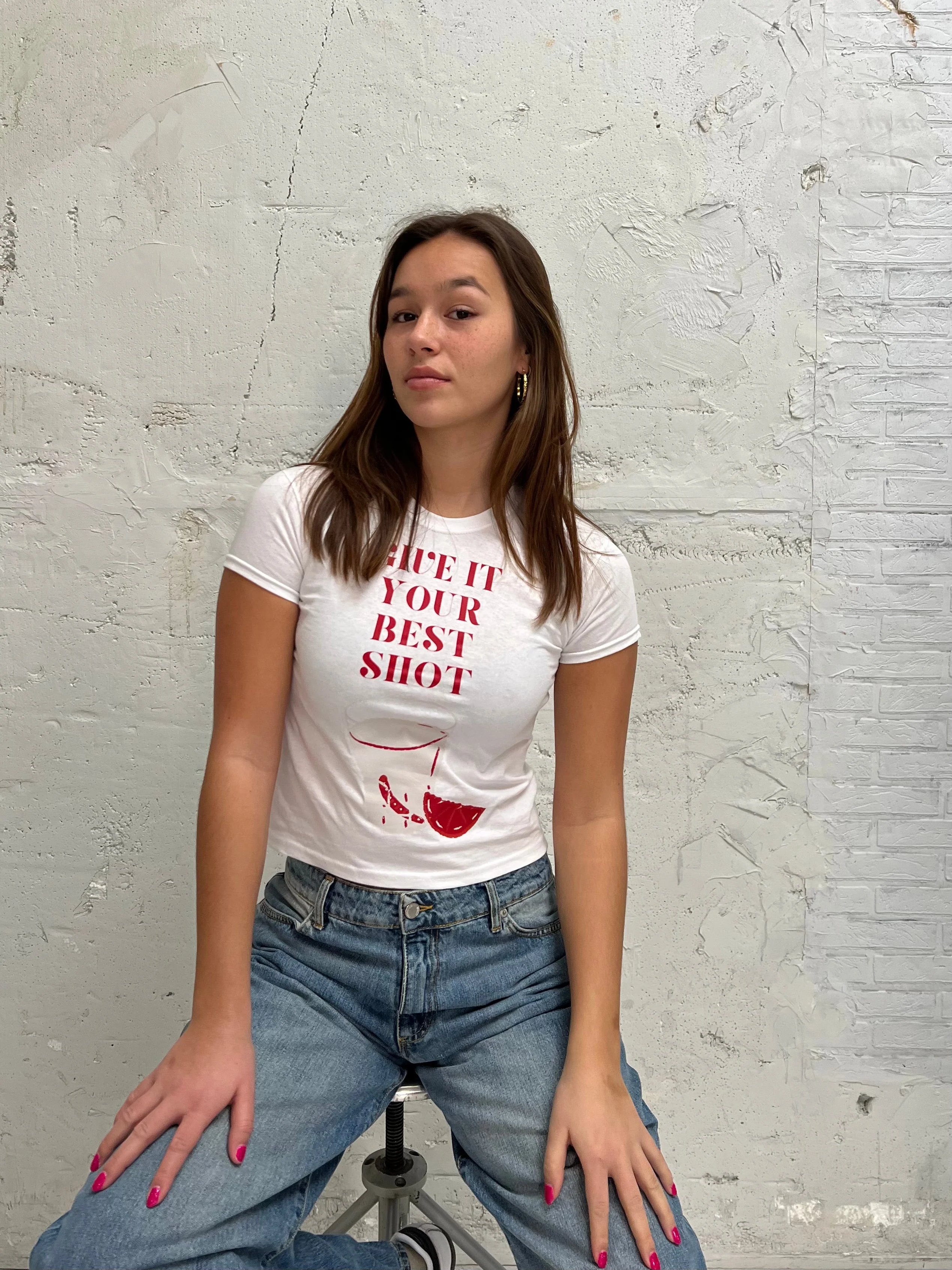 Baby tee with red "give it your best shot" writing and shot glass and lemon. Our tees are from fruit of the loom and in a super soft and comfortable quality.