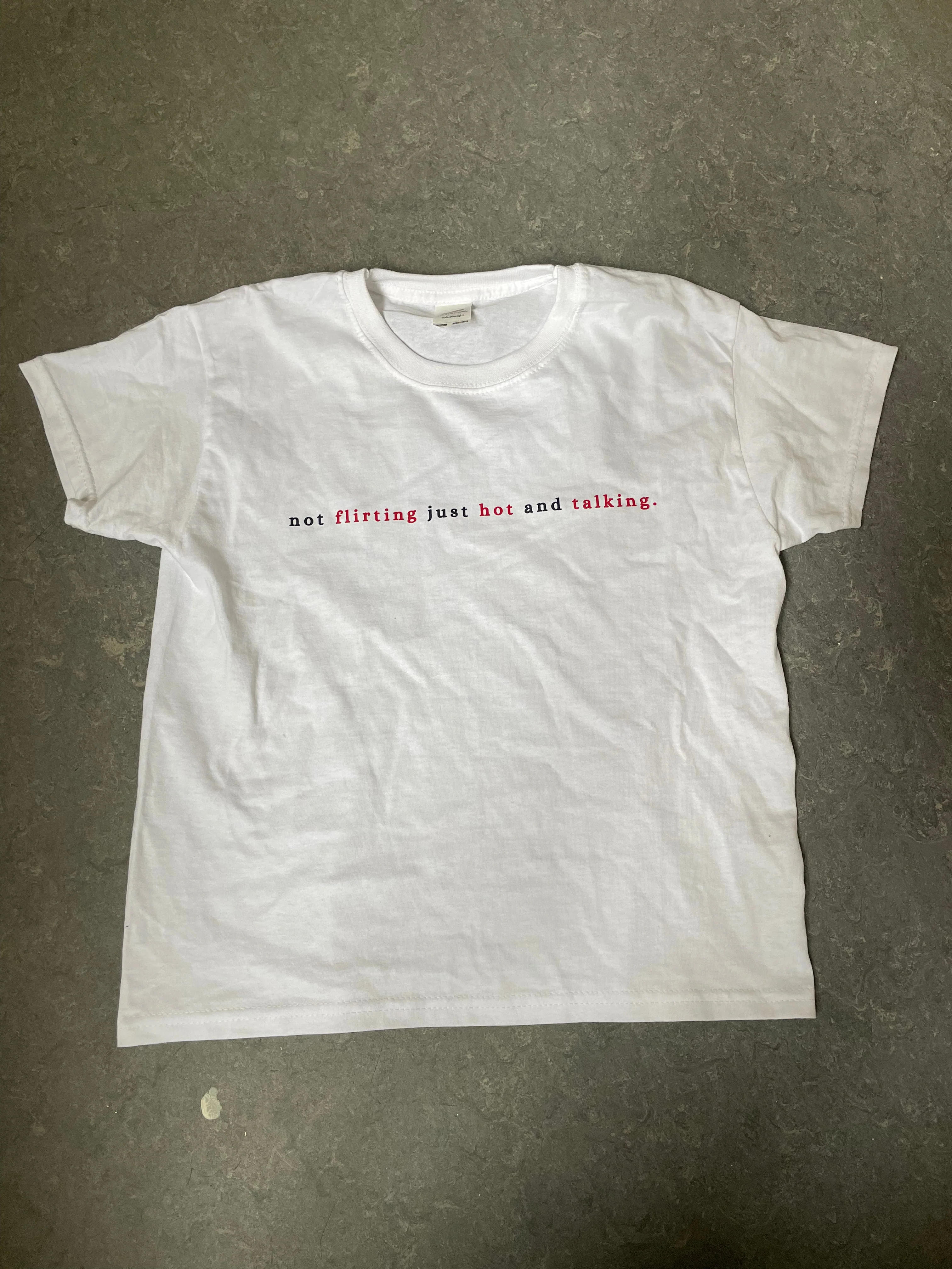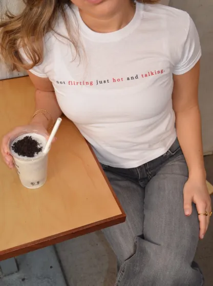 Baby tee with the words "not flirting just hot and talking". Our tees are from fruit of the loom in a super soft and comfortable quality.