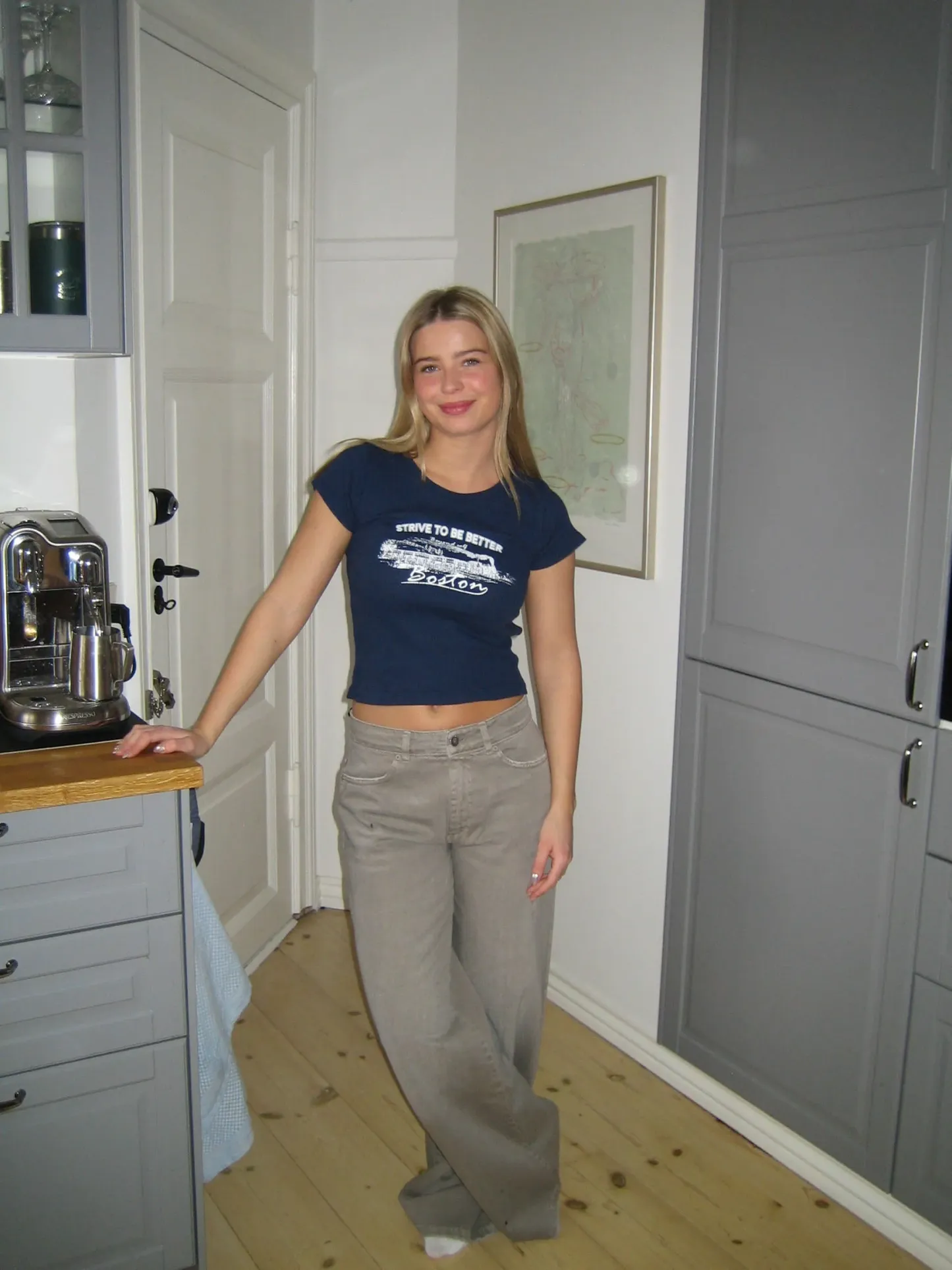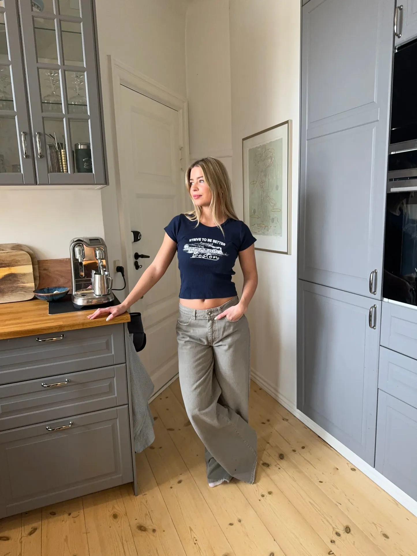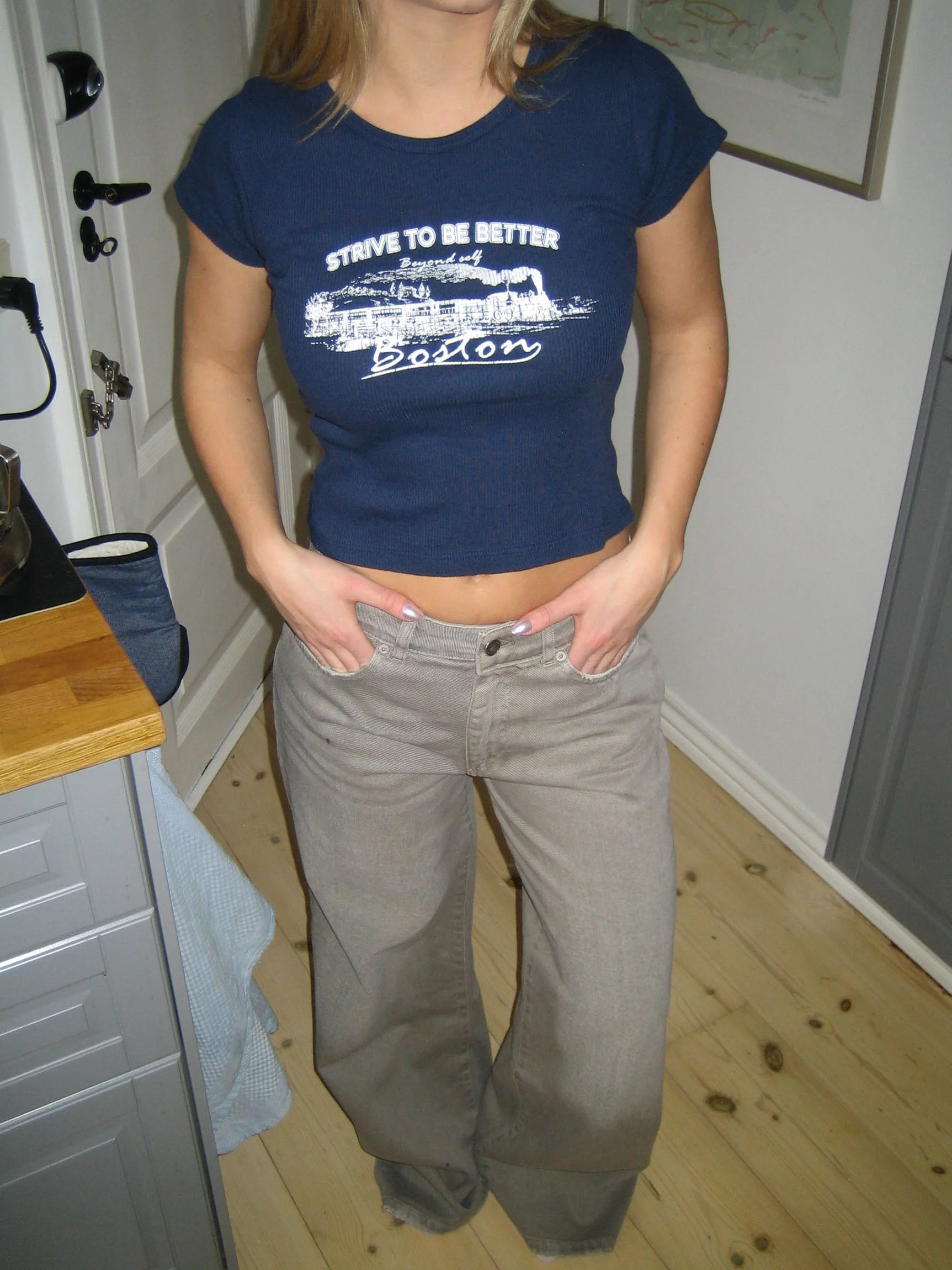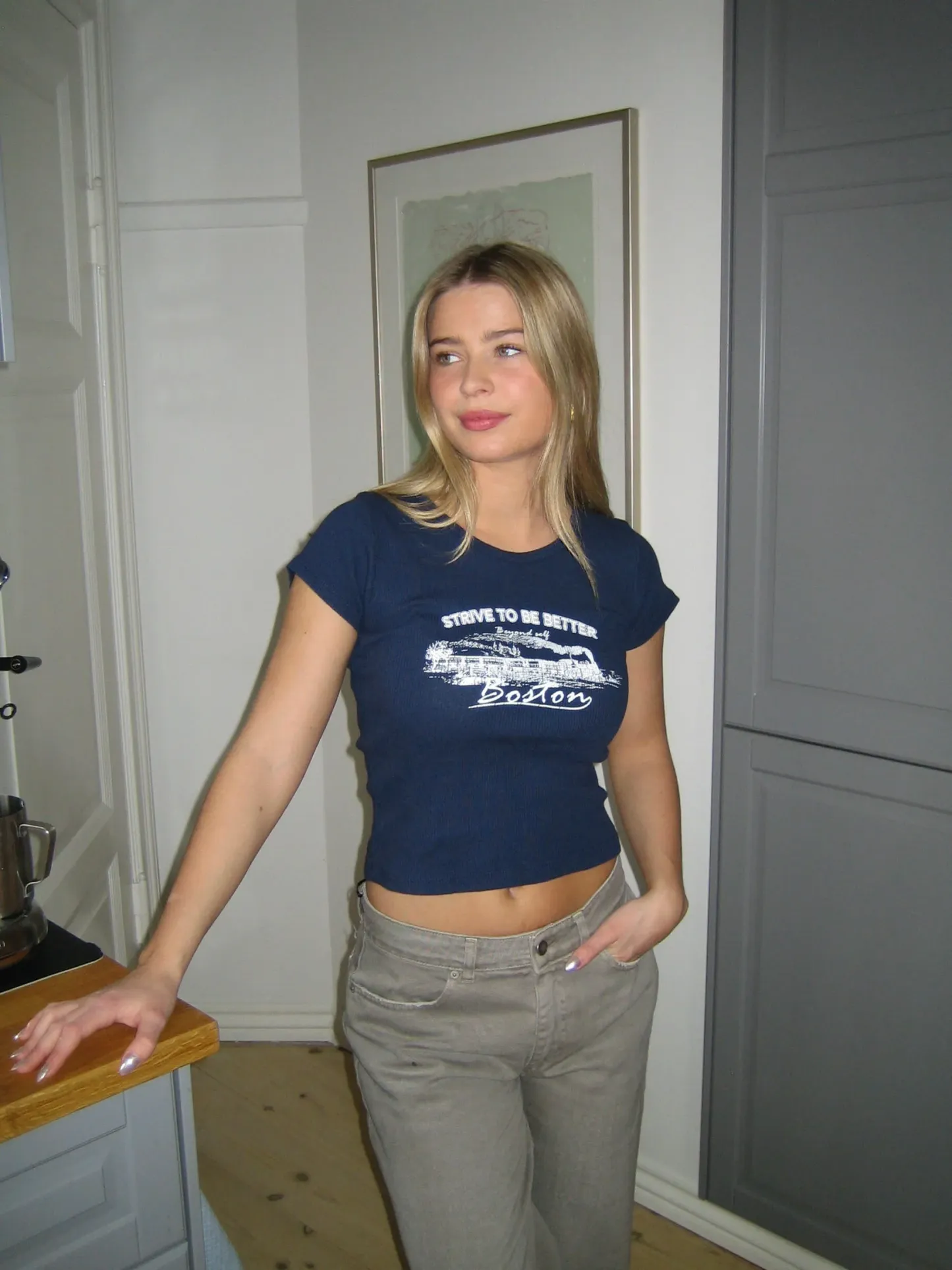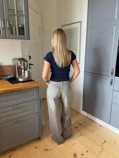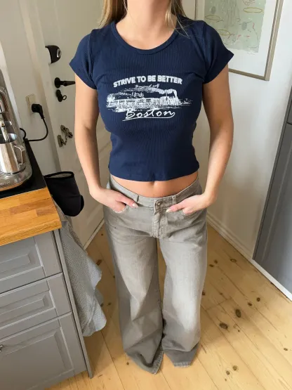 This fitted cropped T-shirt blends sporty style with modern details. The navy color exudes elegance, while the white lettering adds a fresh and energetic touch. With its snug fit and statement details, it's the perfect choice for both casual days and stylish outfits.