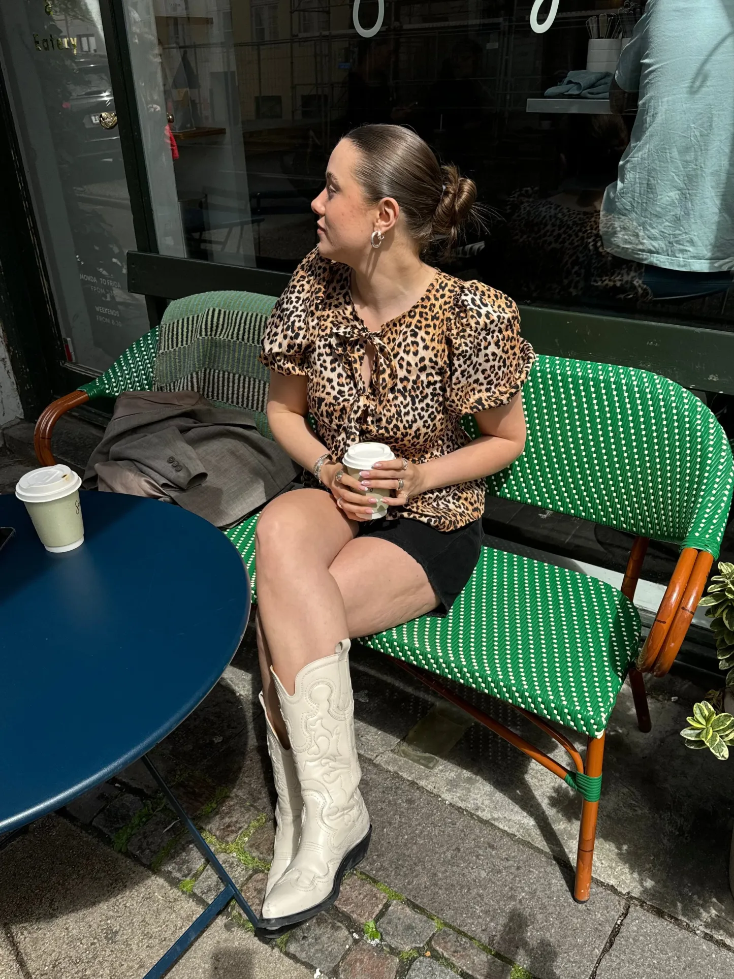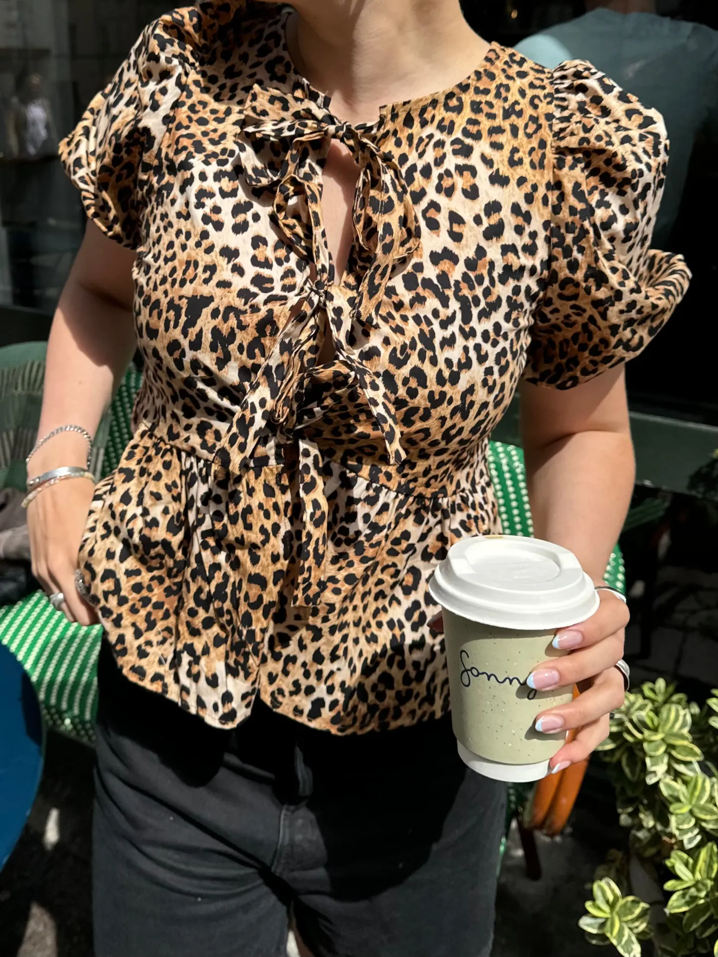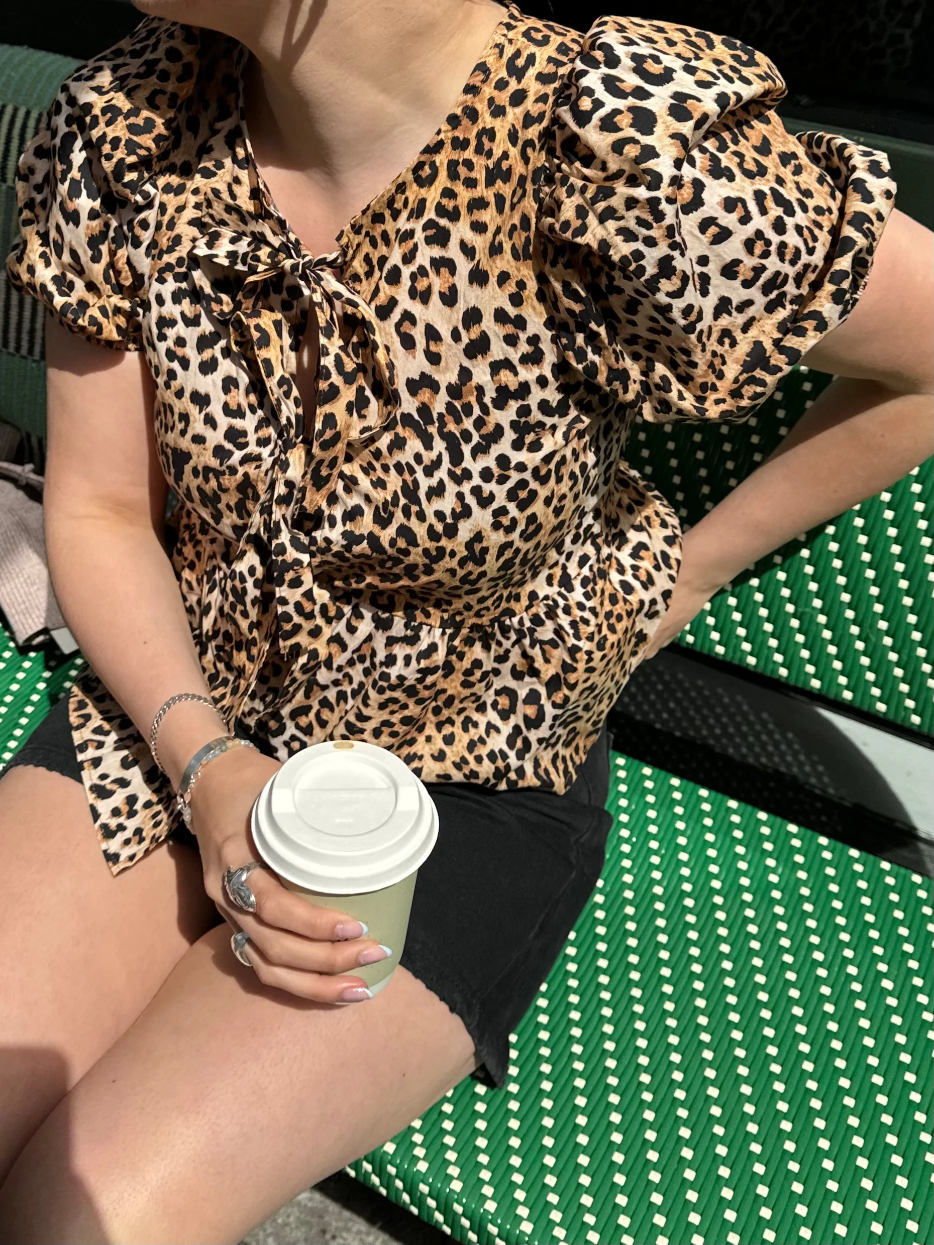 The cutest blouse with leopard print. The blouse has short voluminous sleeves and is tied at the front. It has a normal and comfortable fit.