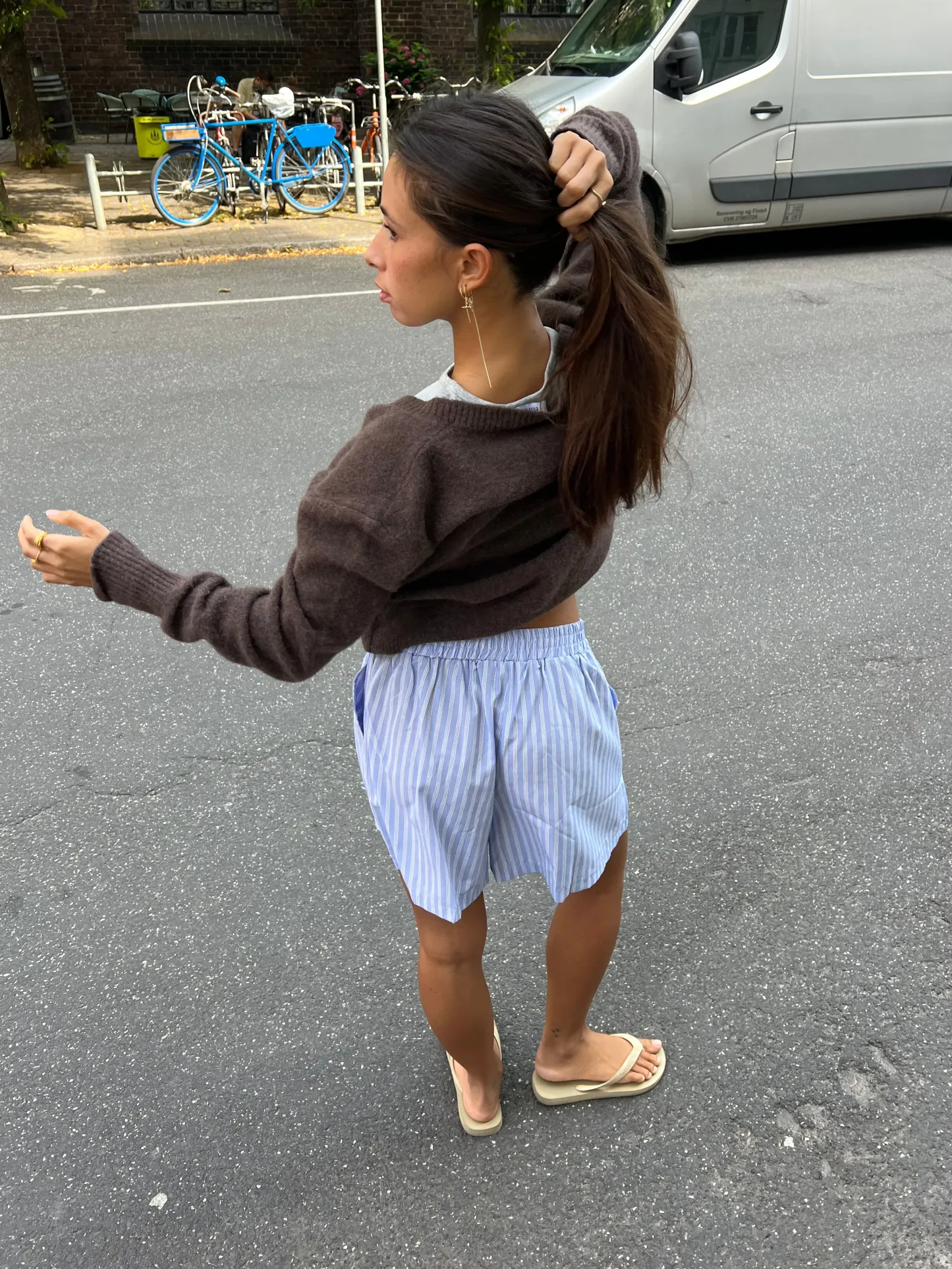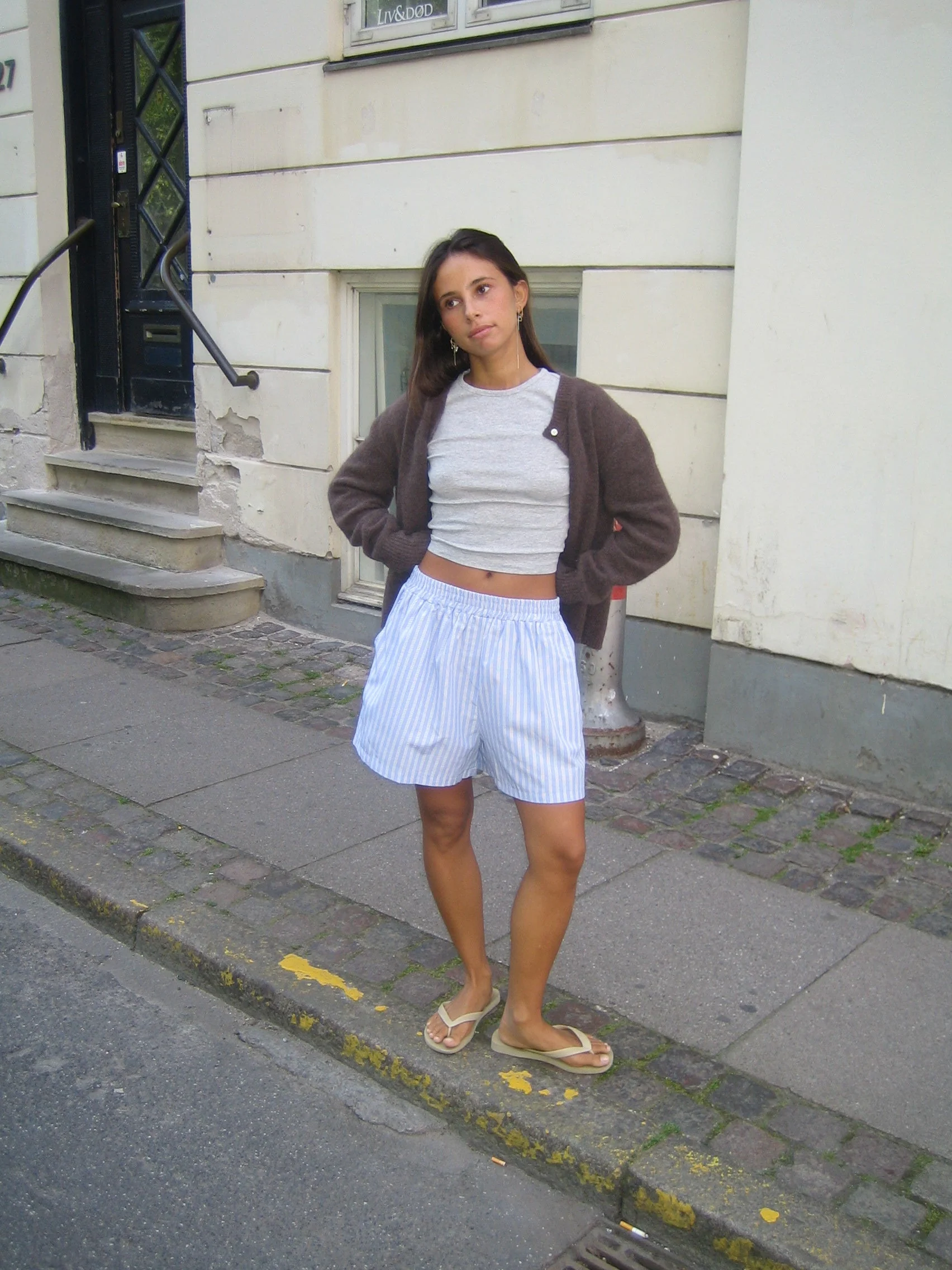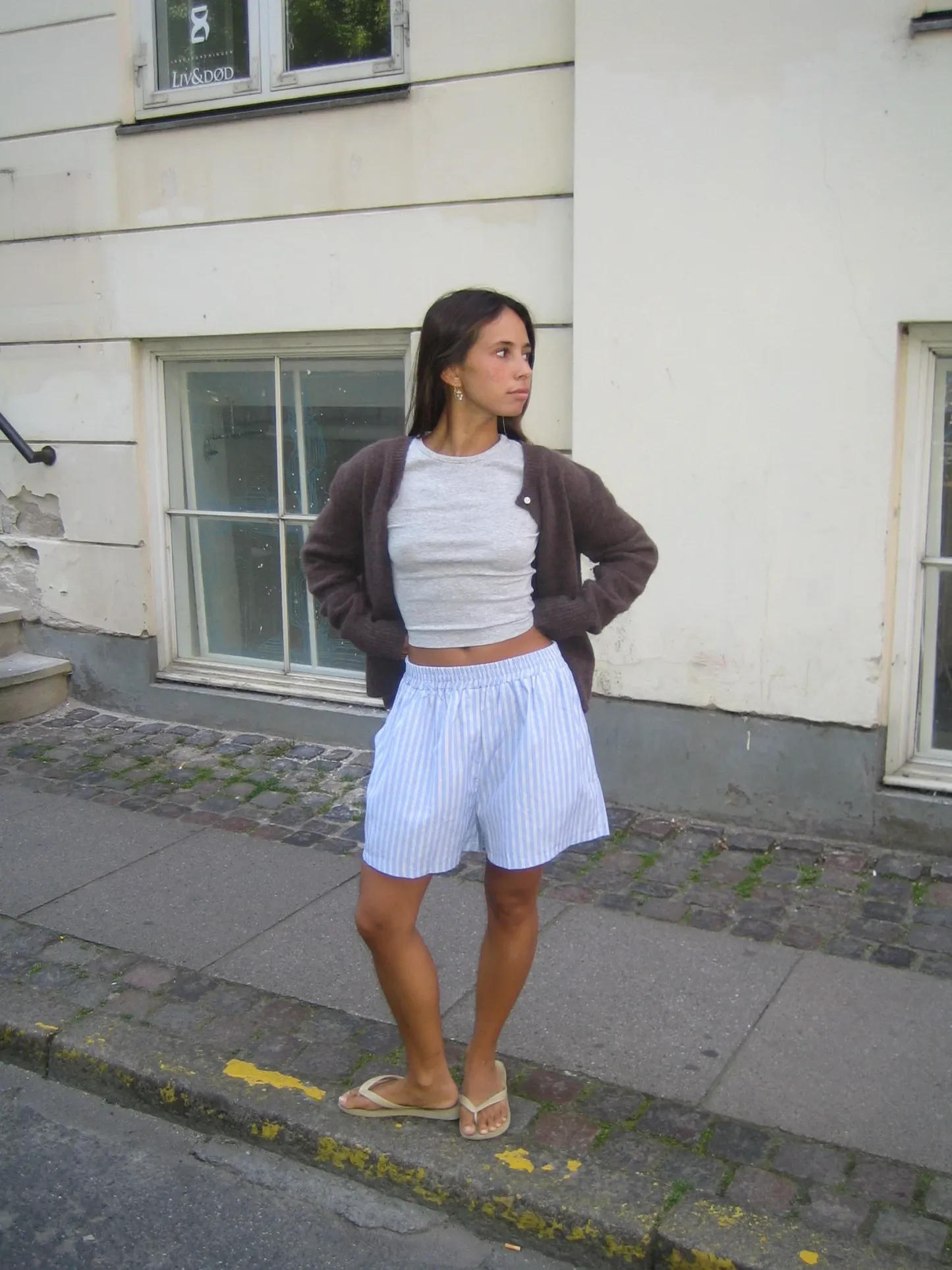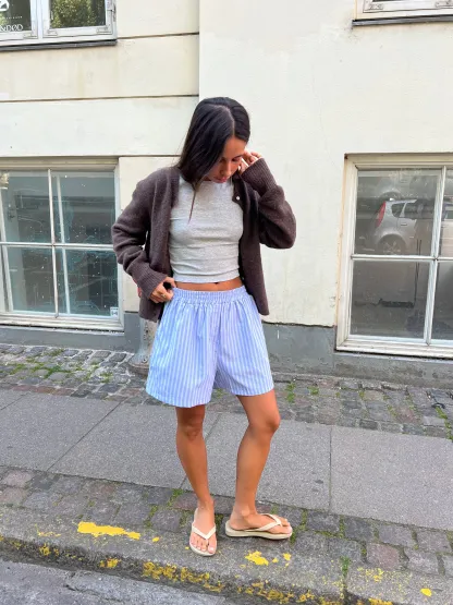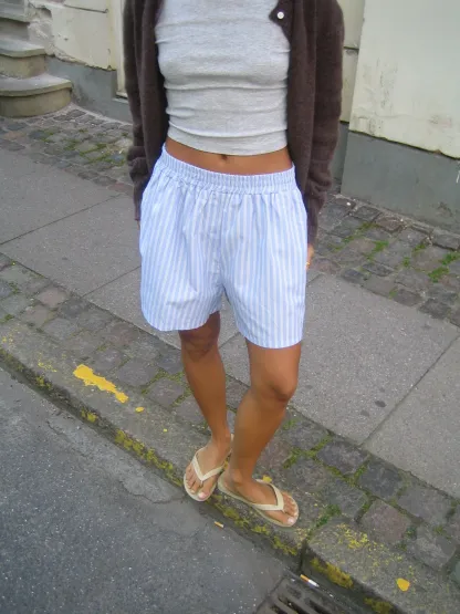 These shorts have a loose and comfortable fit. The perfect shorts for a relaxing everyday outfit, or a day at home. They have an elastic waistband and slanted side pockets.