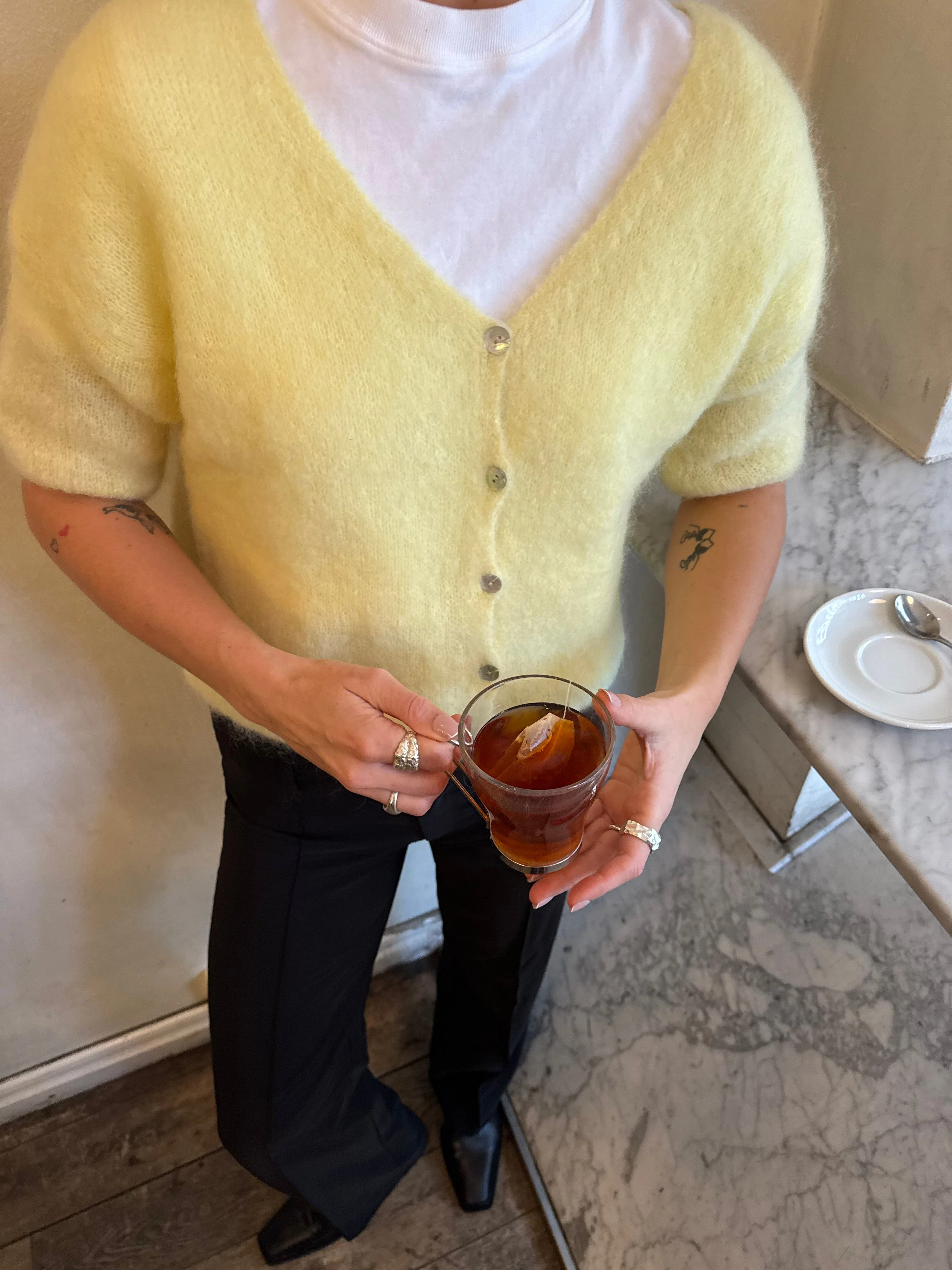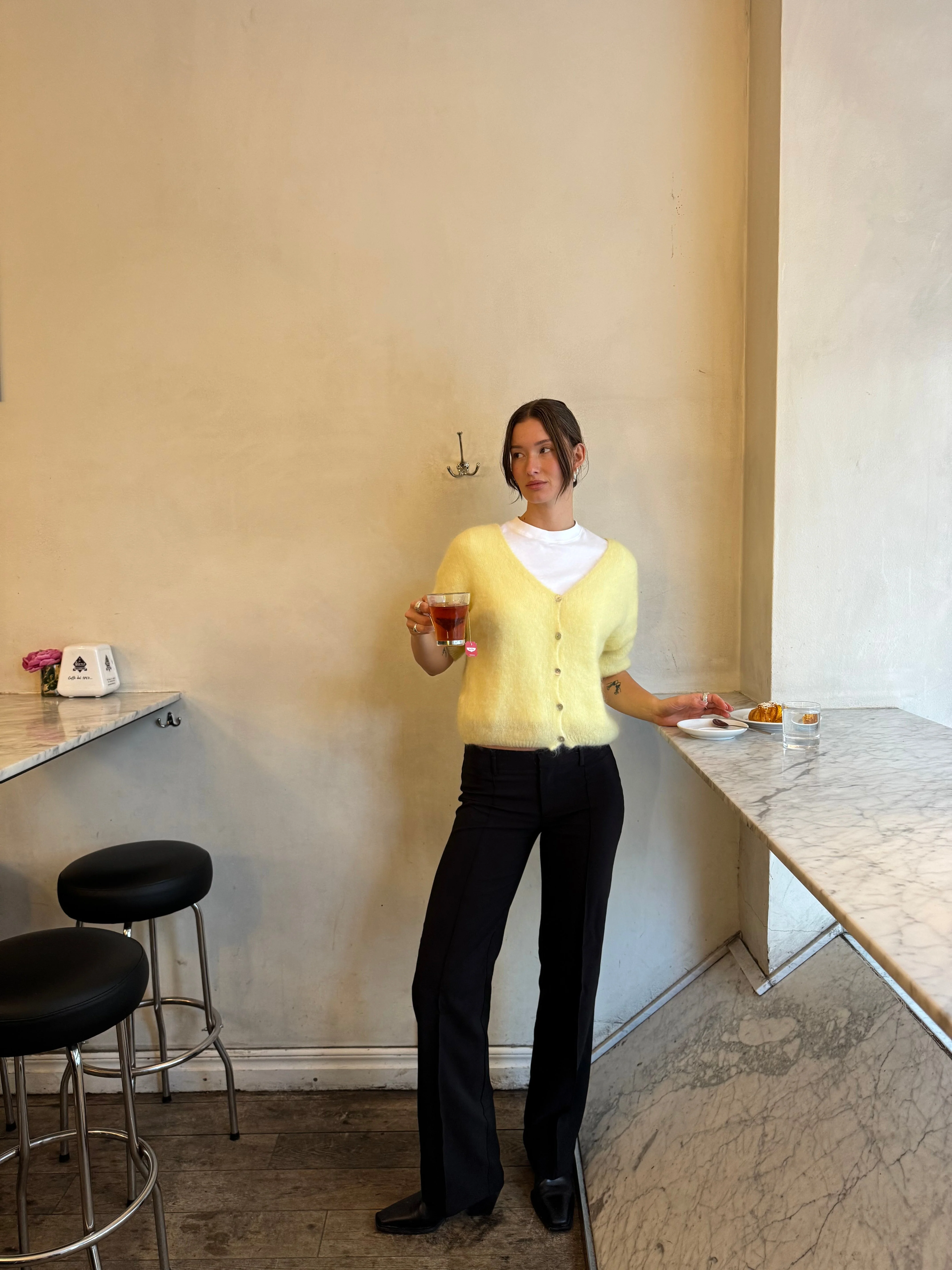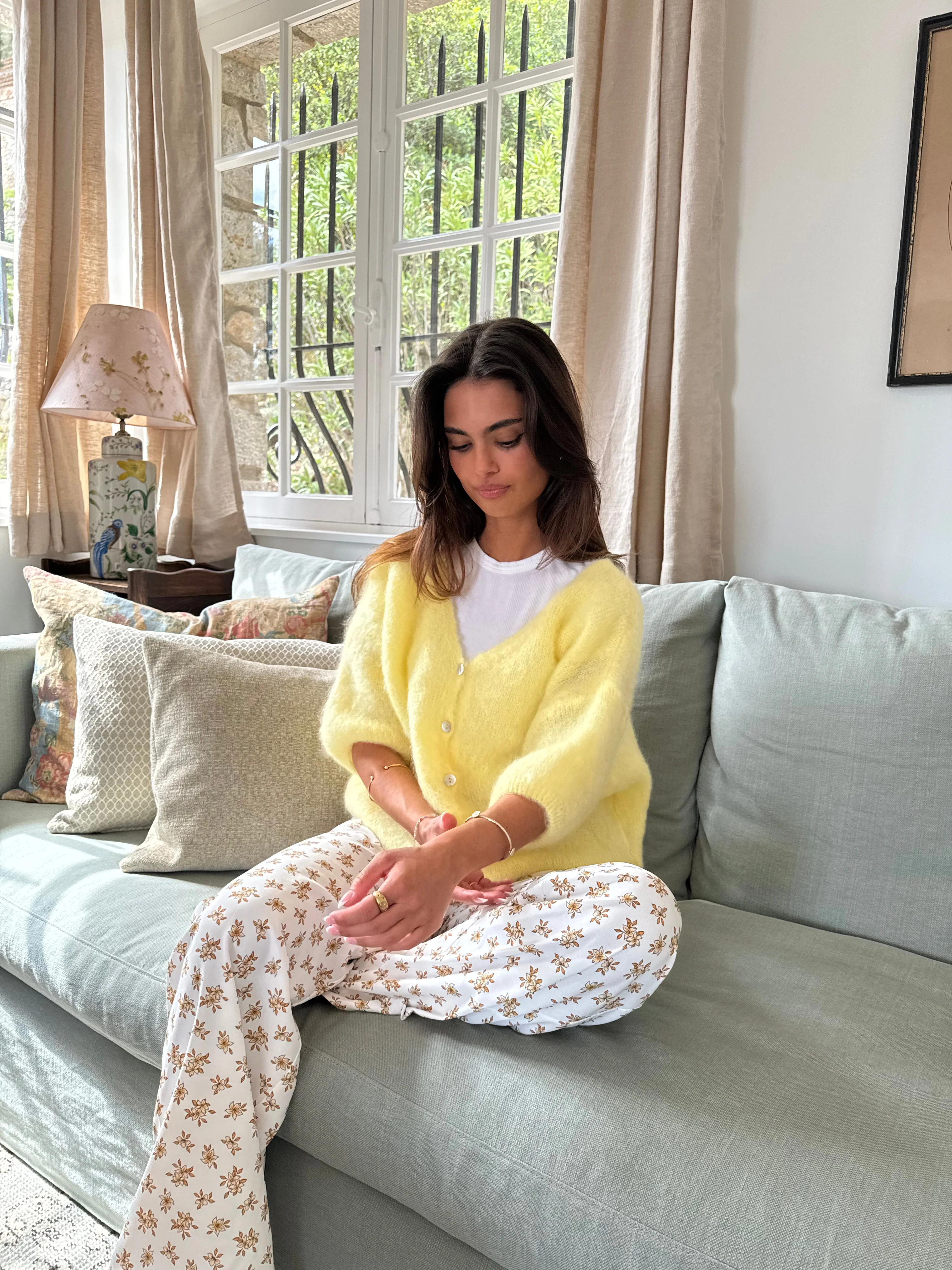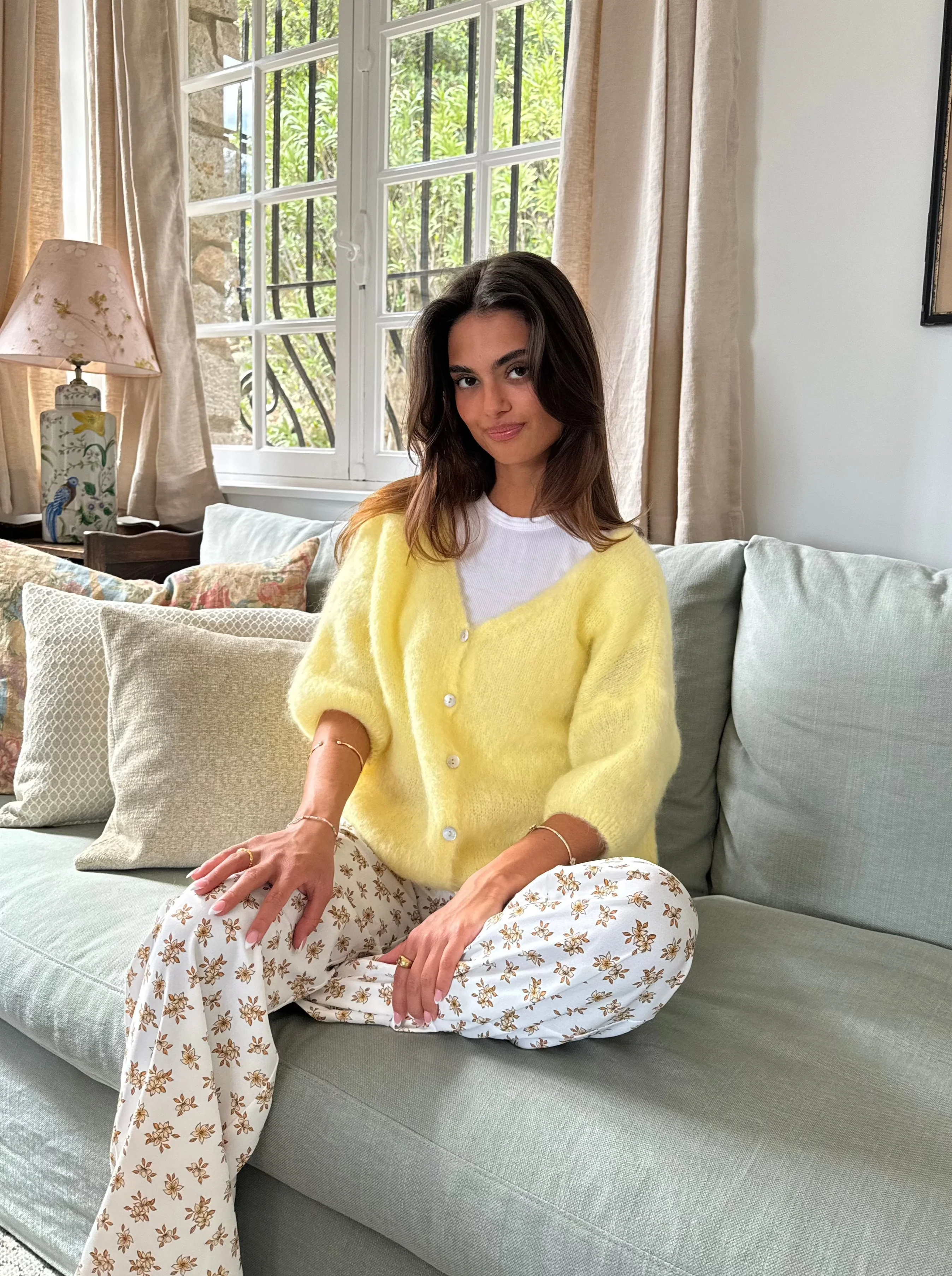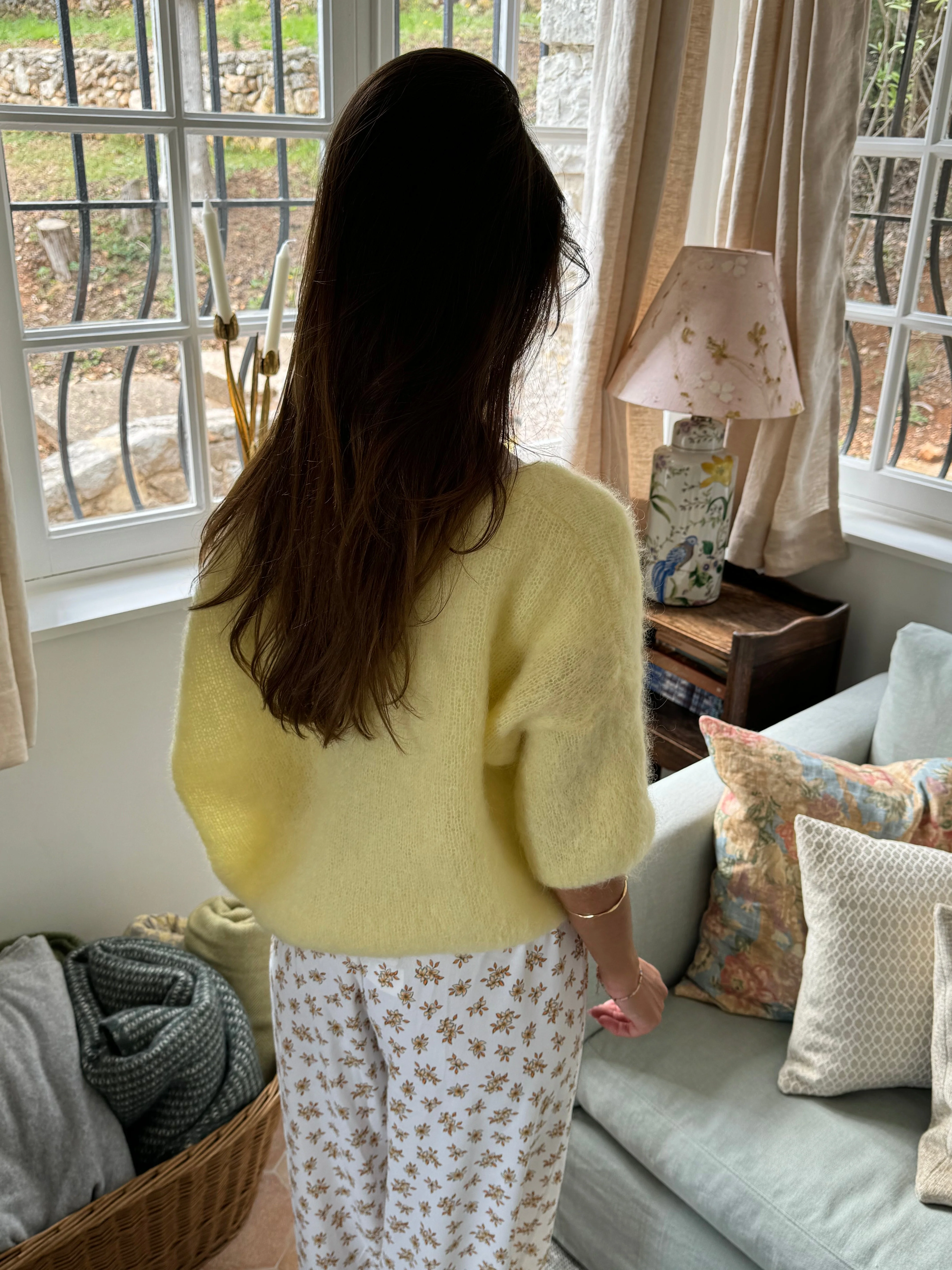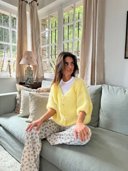Our yellow Annaly cardigan is in a comfortable and knitted mohair material. The cardigan has three-quarter sleeves and closes with buttons. In addition, it has the prettiest v-cut.