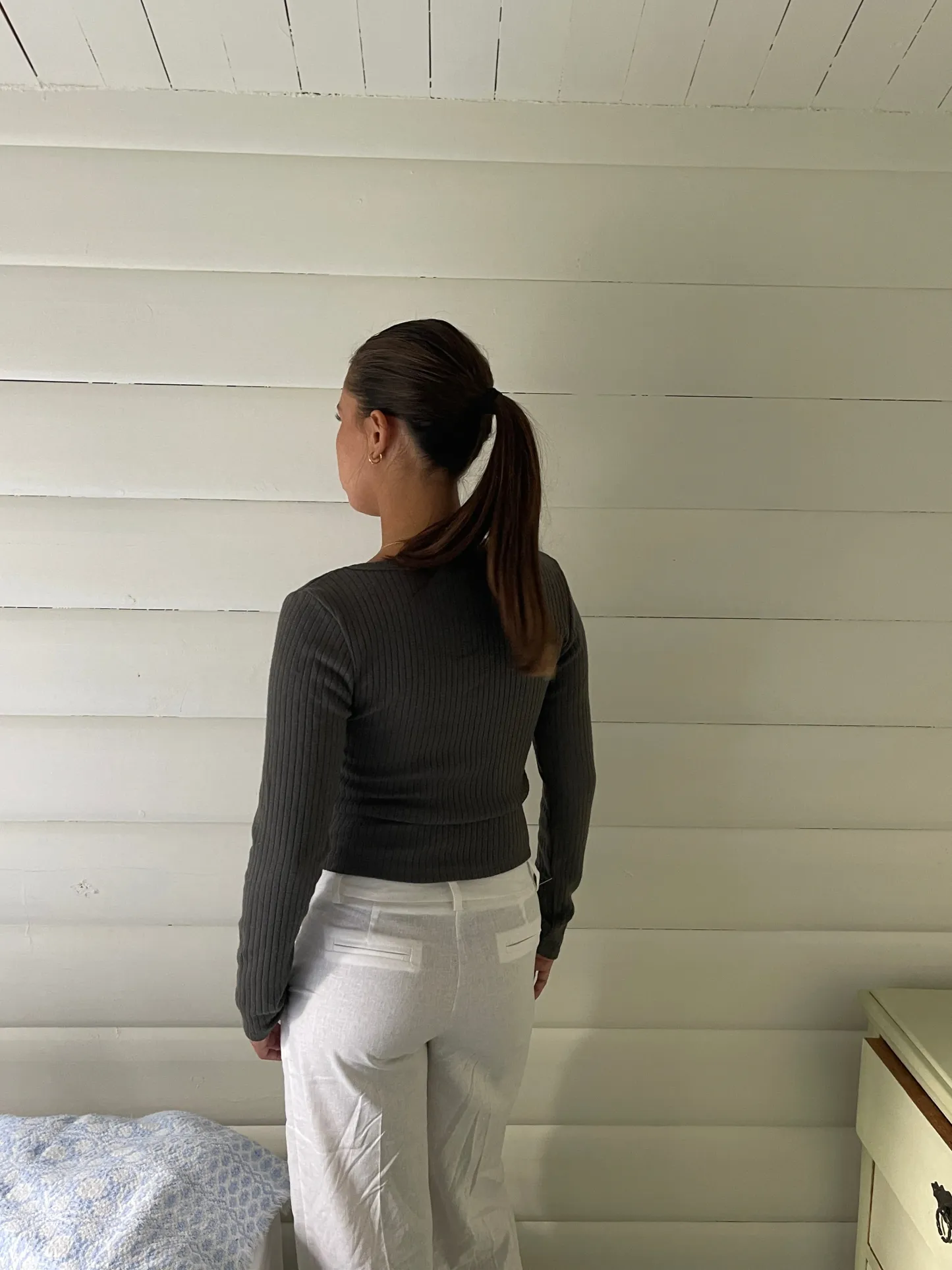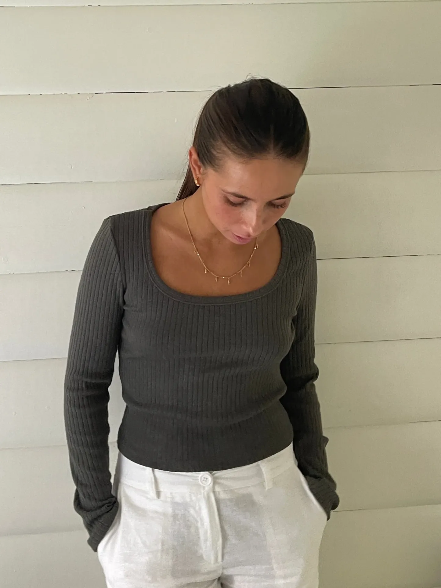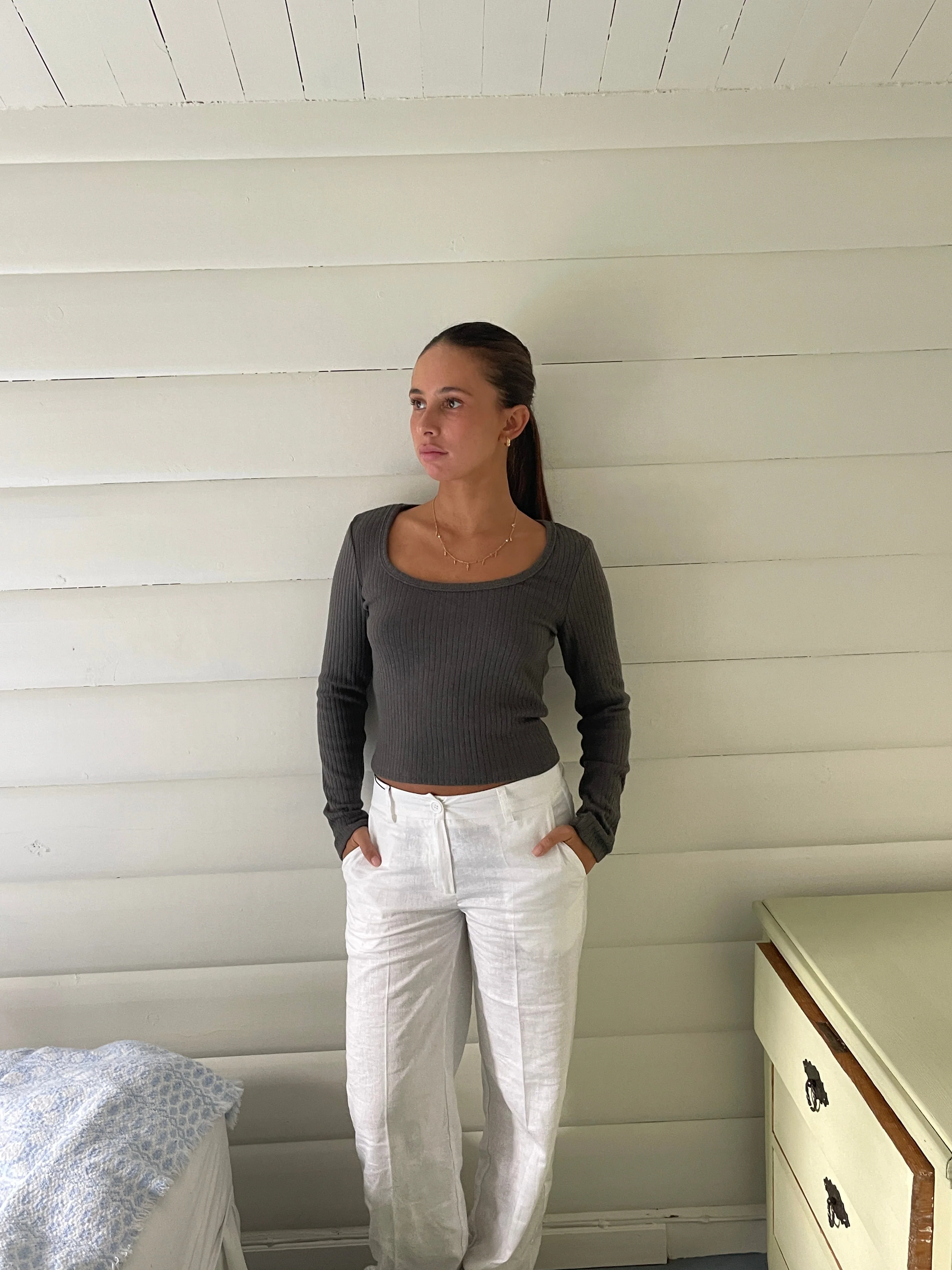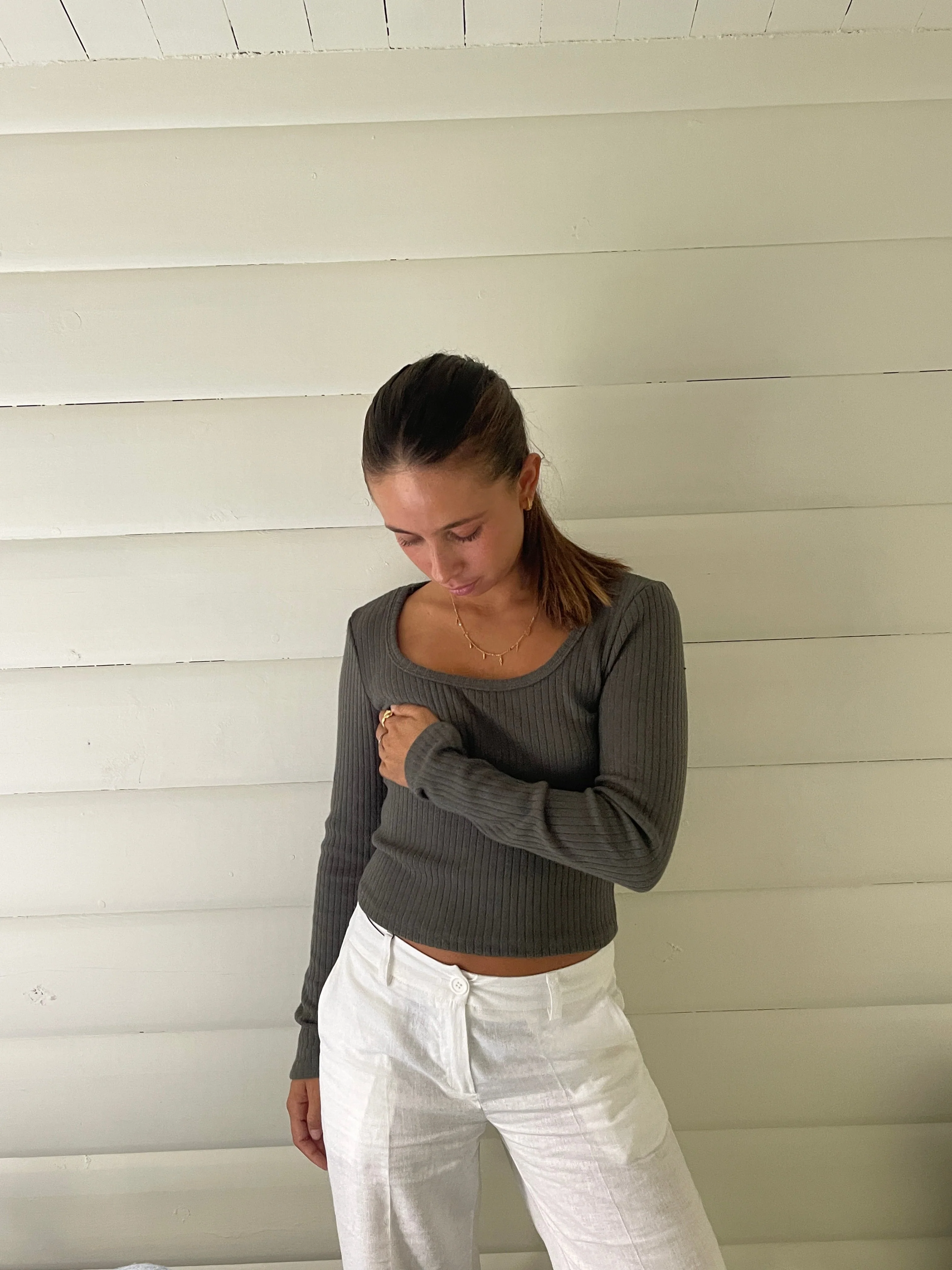 Blouse with long sleeves. The blouse is made of the softest and most comfortable ribbed material. It has a square cutout in the front.