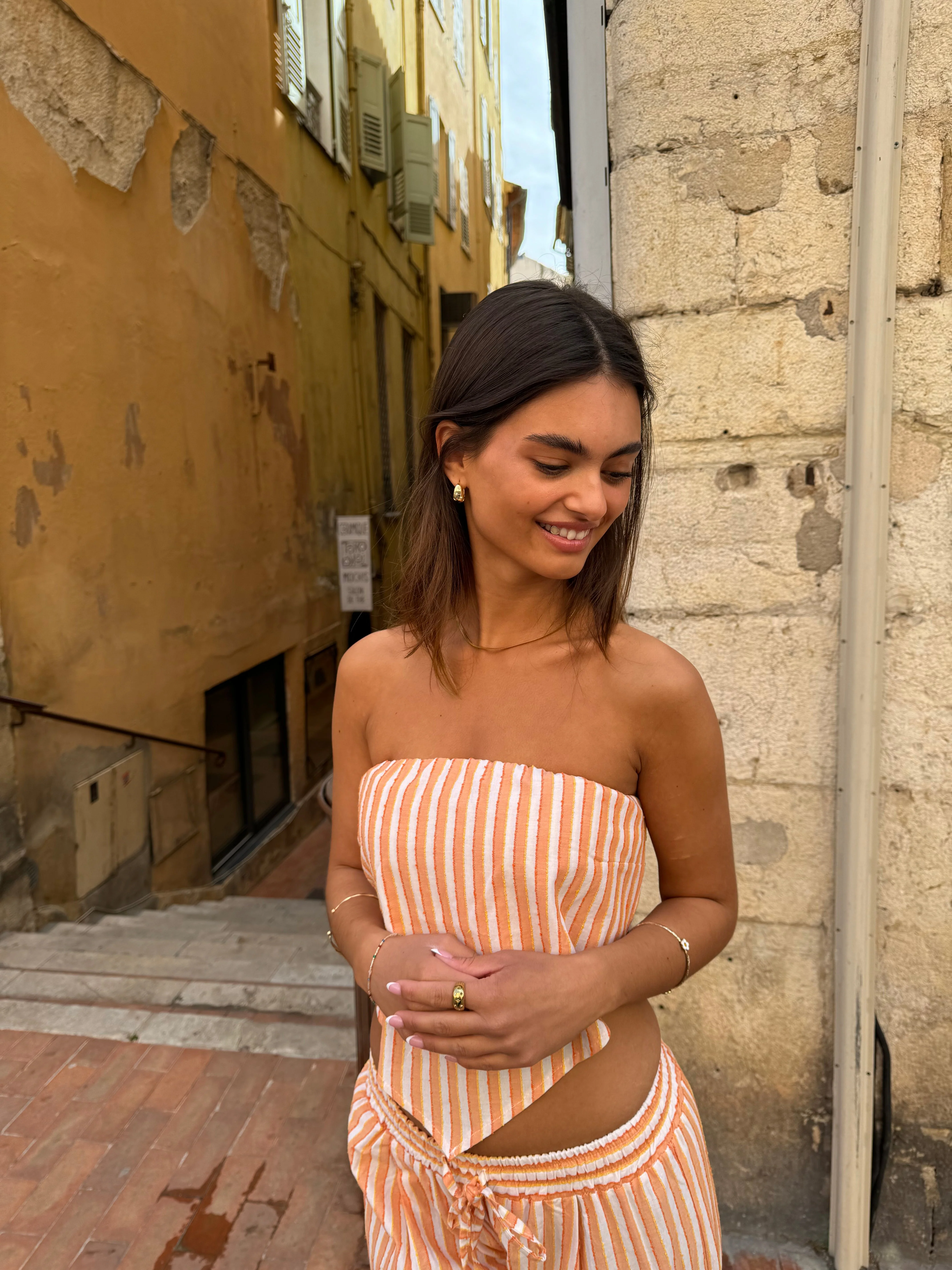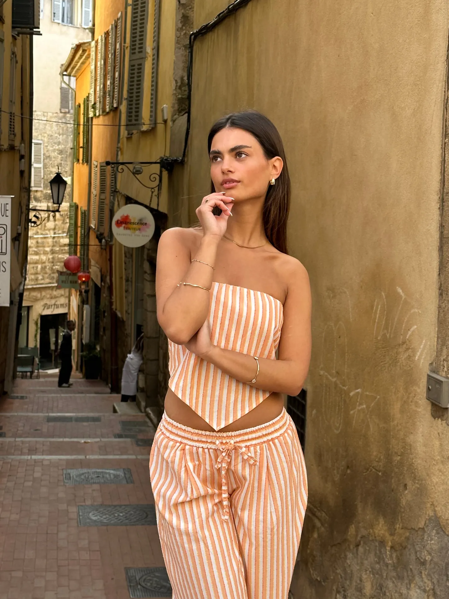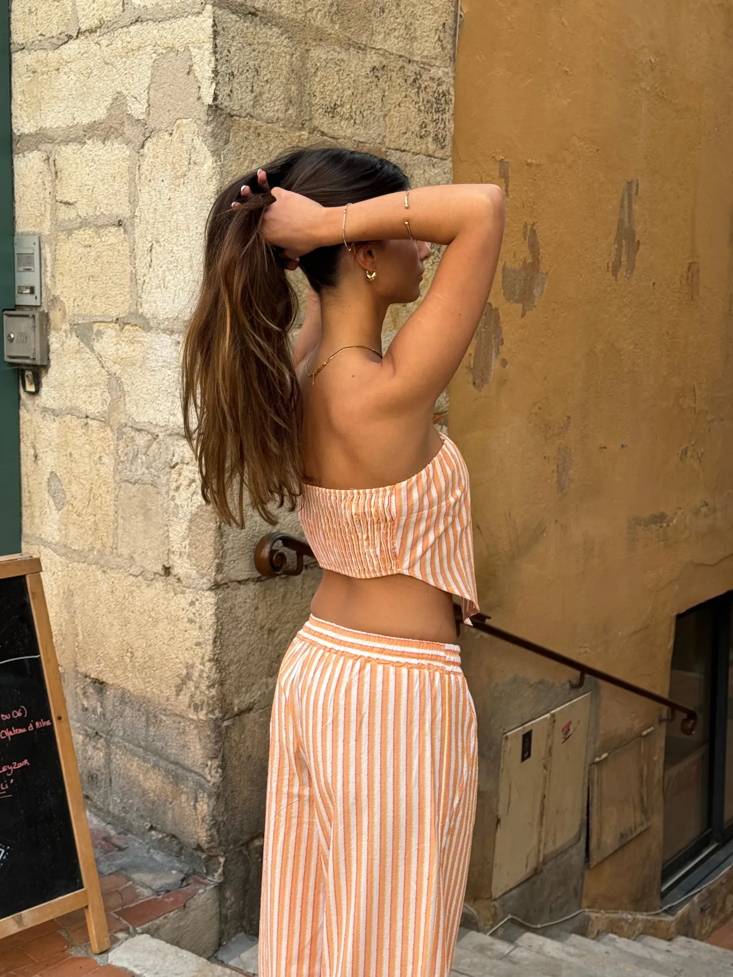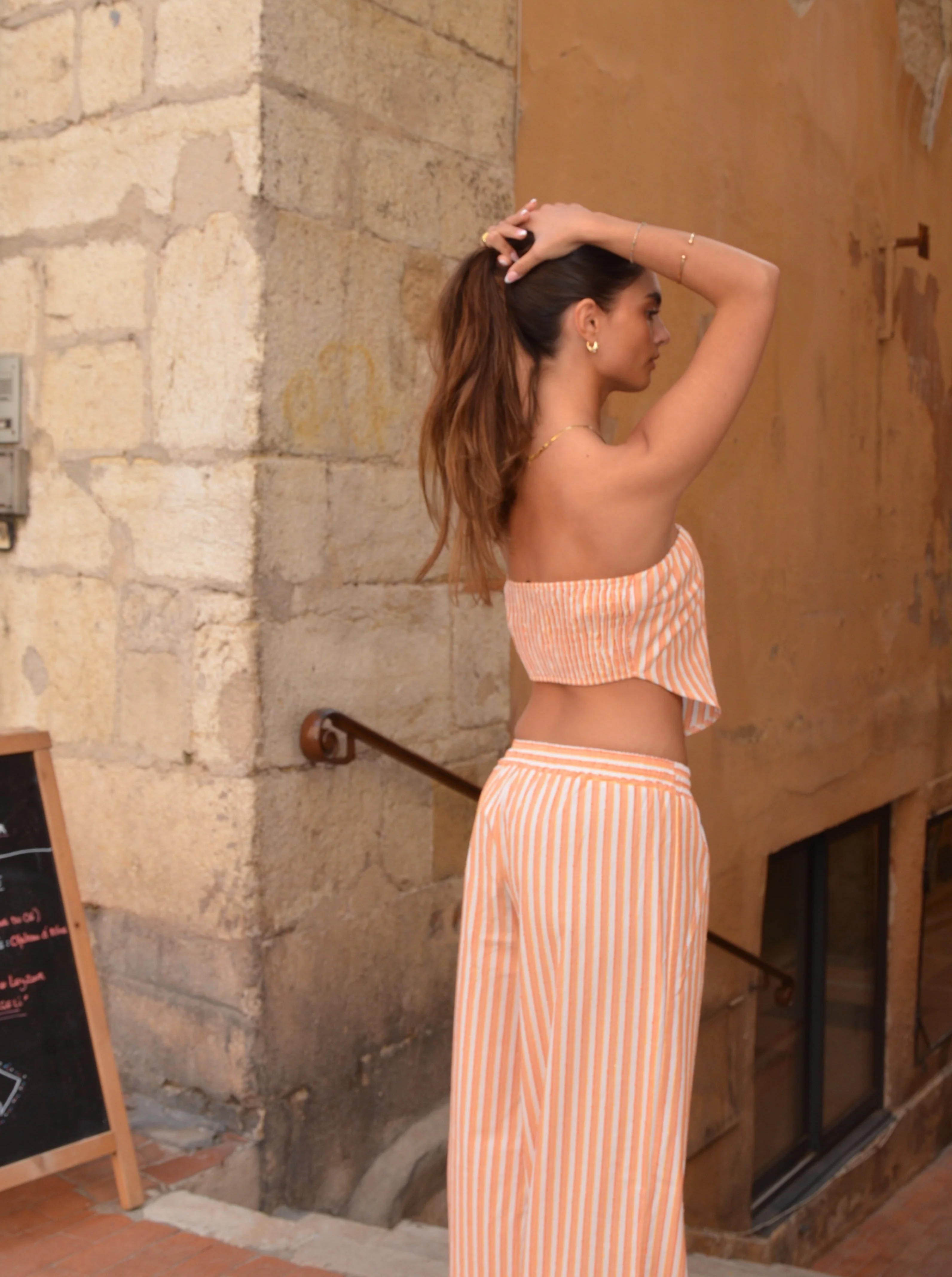 Our Aura top is in a nice and light material perfect for summer evenings! The top has white and orange stripes and is strapless. To complete the look, you can match this top with our Aura striped pants!