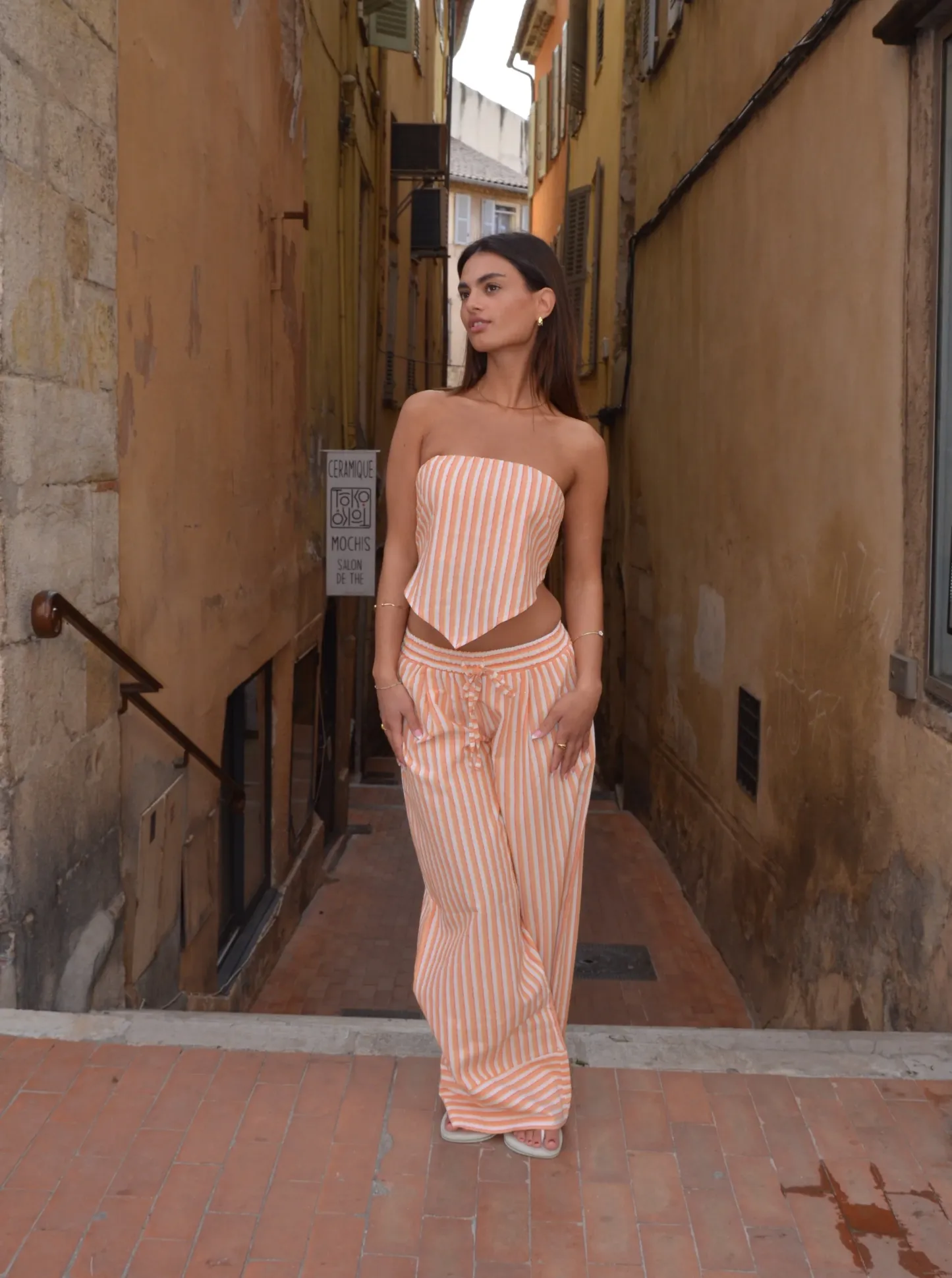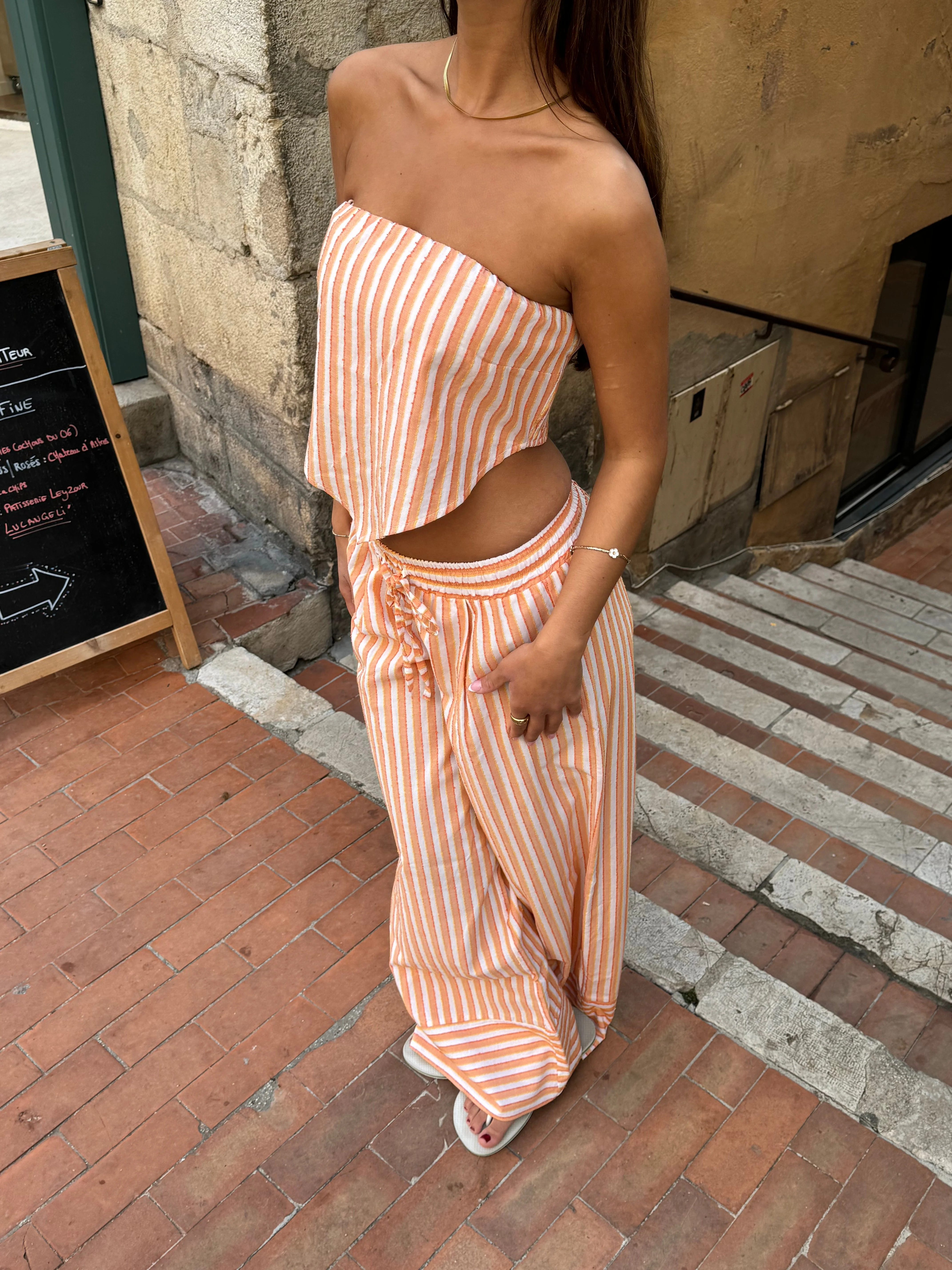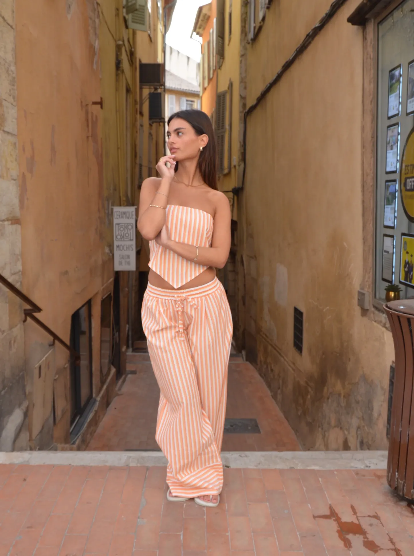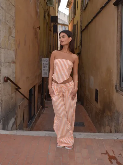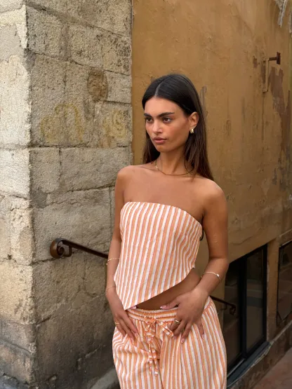 Our Aura top is in a nice and light material perfect for summer evenings! The top has white and orange stripes and is strapless. To complete the look, you can match this top with our Aura striped pants!