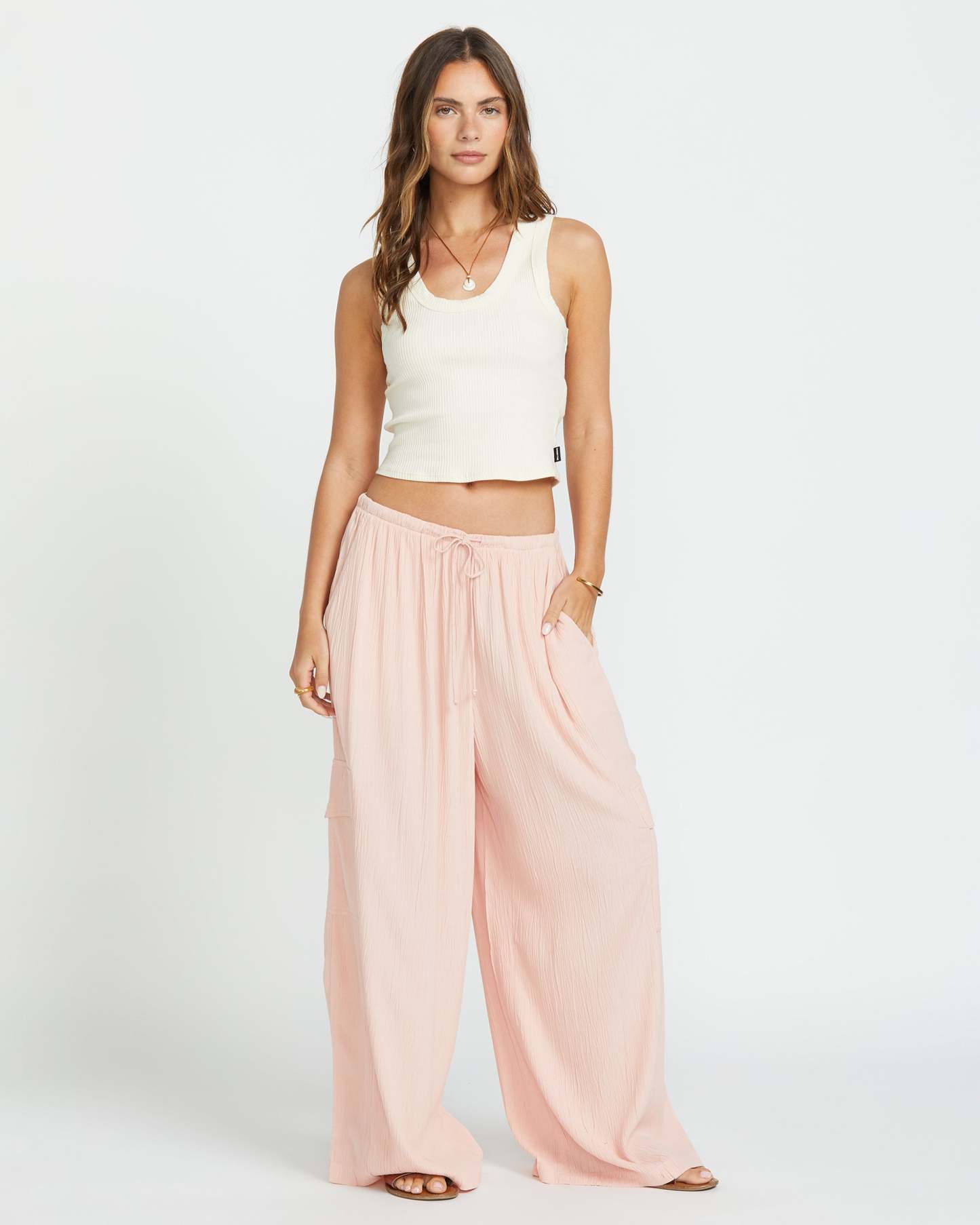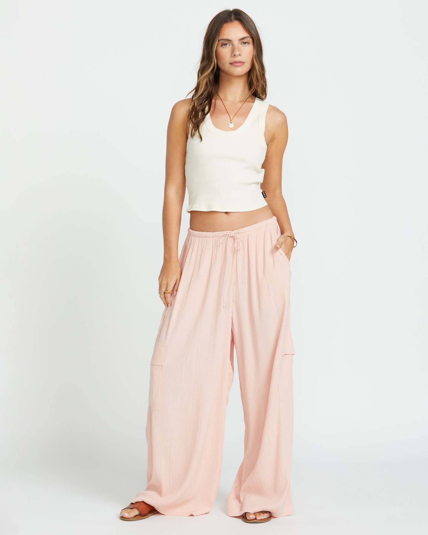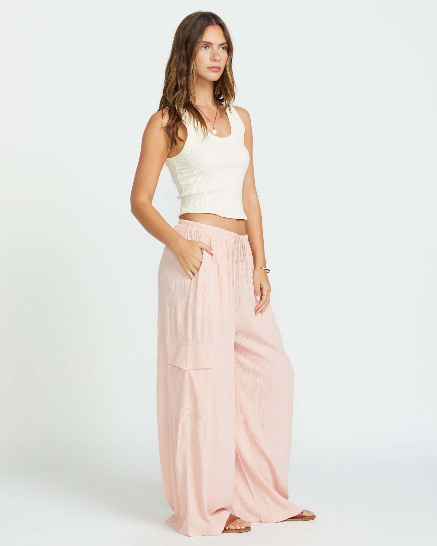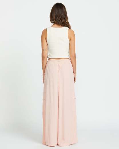 Transition from beachside to festival in our Billabong viscose Beach Babe pants-their relaxed fit and elastic waist keep you comfy while their cargo pockets stash all your essentials. A metal plate accent adds a feminine touch to this lightweight, crinkle-textured staple. Featured here in the Dusty Peach colorway.