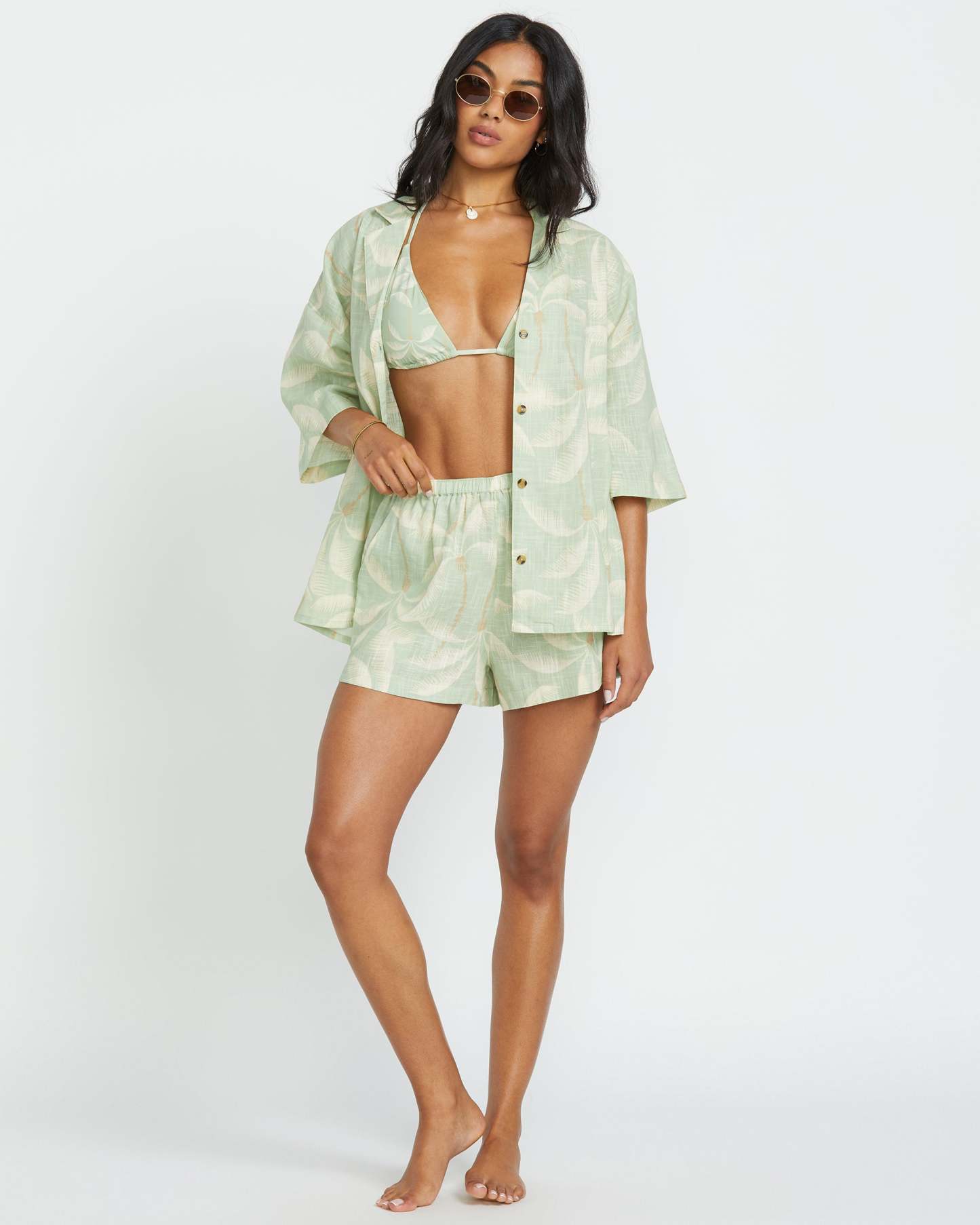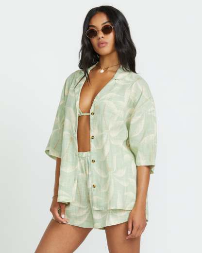 Kick back in our Billabong 100% cotton beach shirt. The oversized fit and short sleeves keep things breezy, while a button-down front and metal plate detail add a stylish touch. Perfect for relaxed days in the sun. Featured here in the Pistachio colorway.