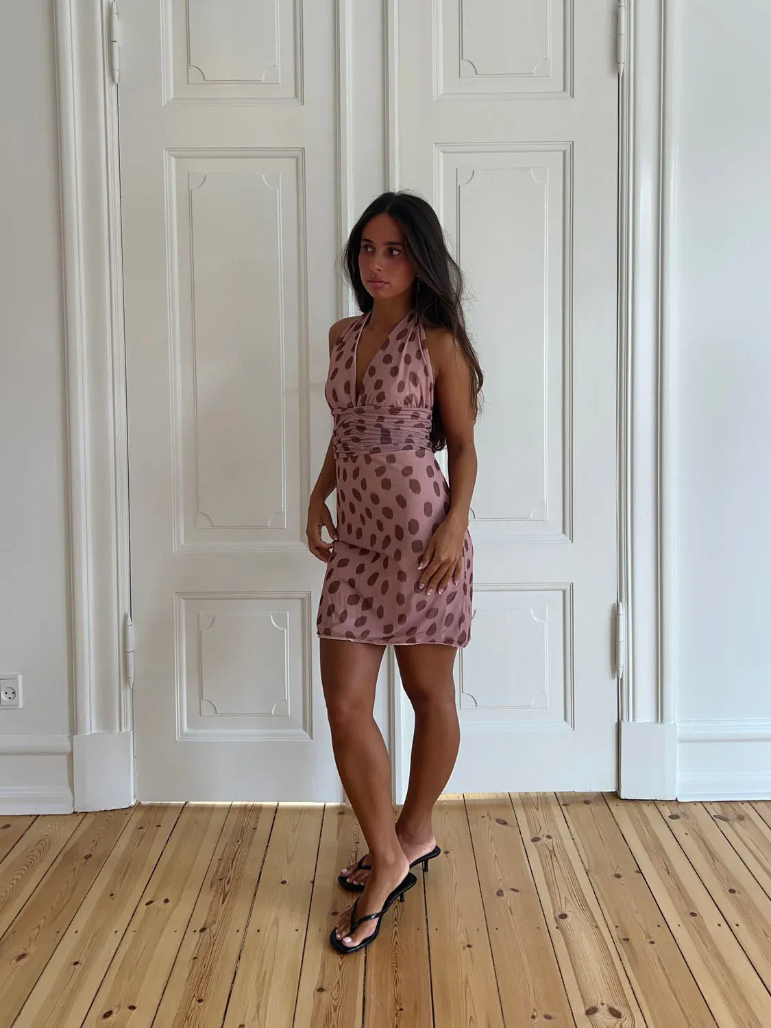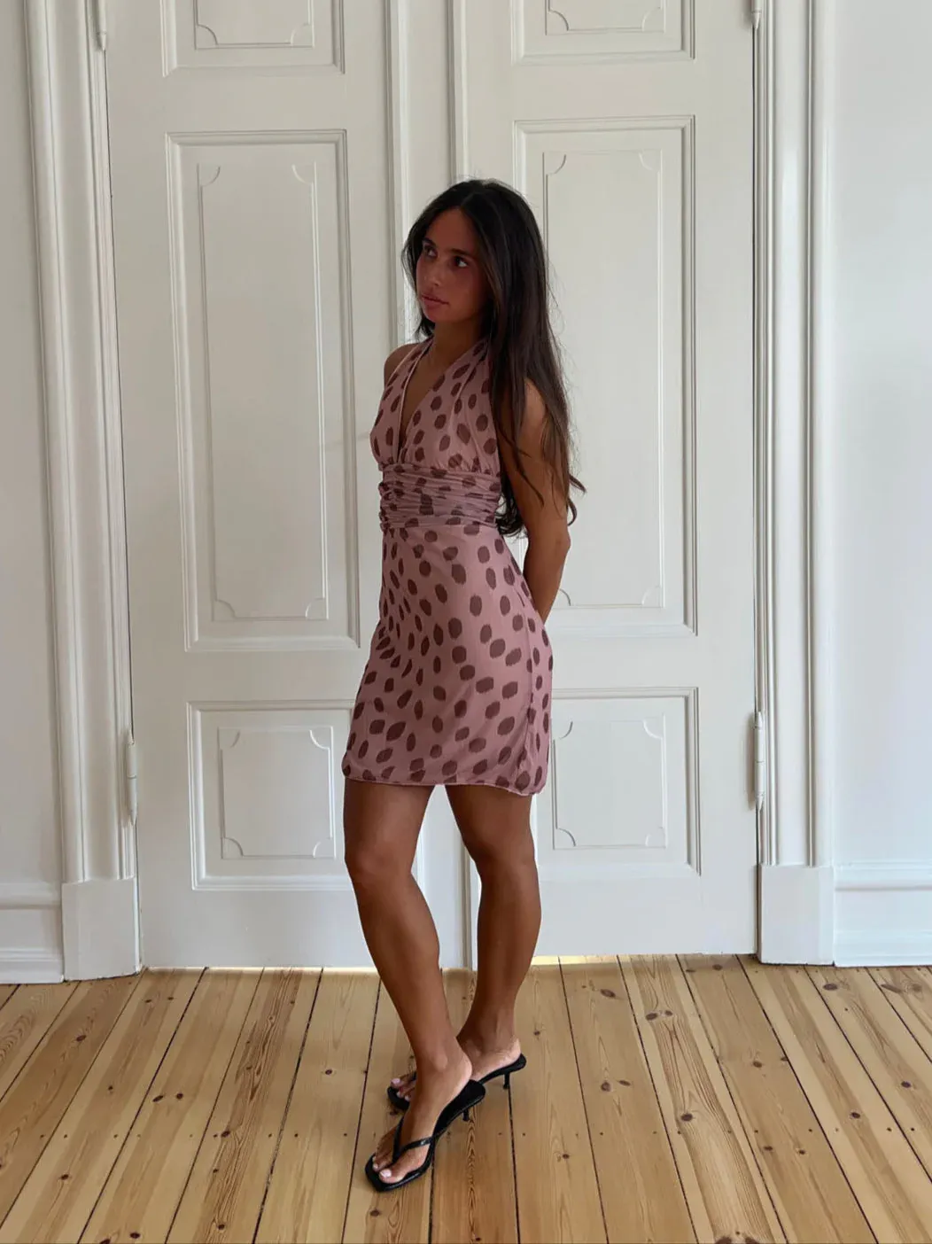 This short dress is a summer must-have with its playful print and feminine cut. Designed in a beautiful pink color with brown dots, the dress features a halterneck design that ties at the neck for an adjustable fit. The open back and elasticated waist create a flattering, body-hugging silhouette, while the soft material ensures maximum comfort. Perfect for beach days, city outings, and summer parties.