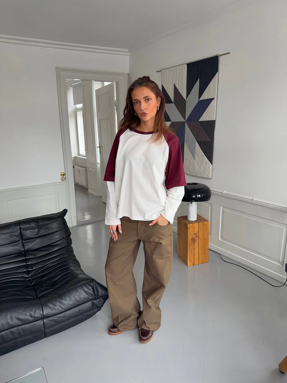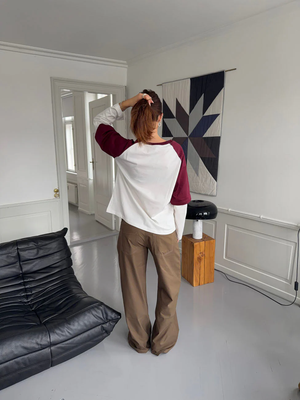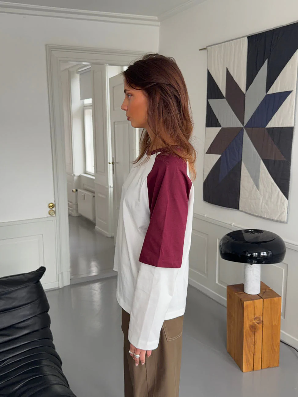 A classic tee with a sporty twist. The top features contrasting burgundy sleeves and a clean white base, giving it a retro yet fresh streetwear look. Made from soft cotton fabric, it’s comfortable to wear all day – perfect for both everyday use and laid-back days.