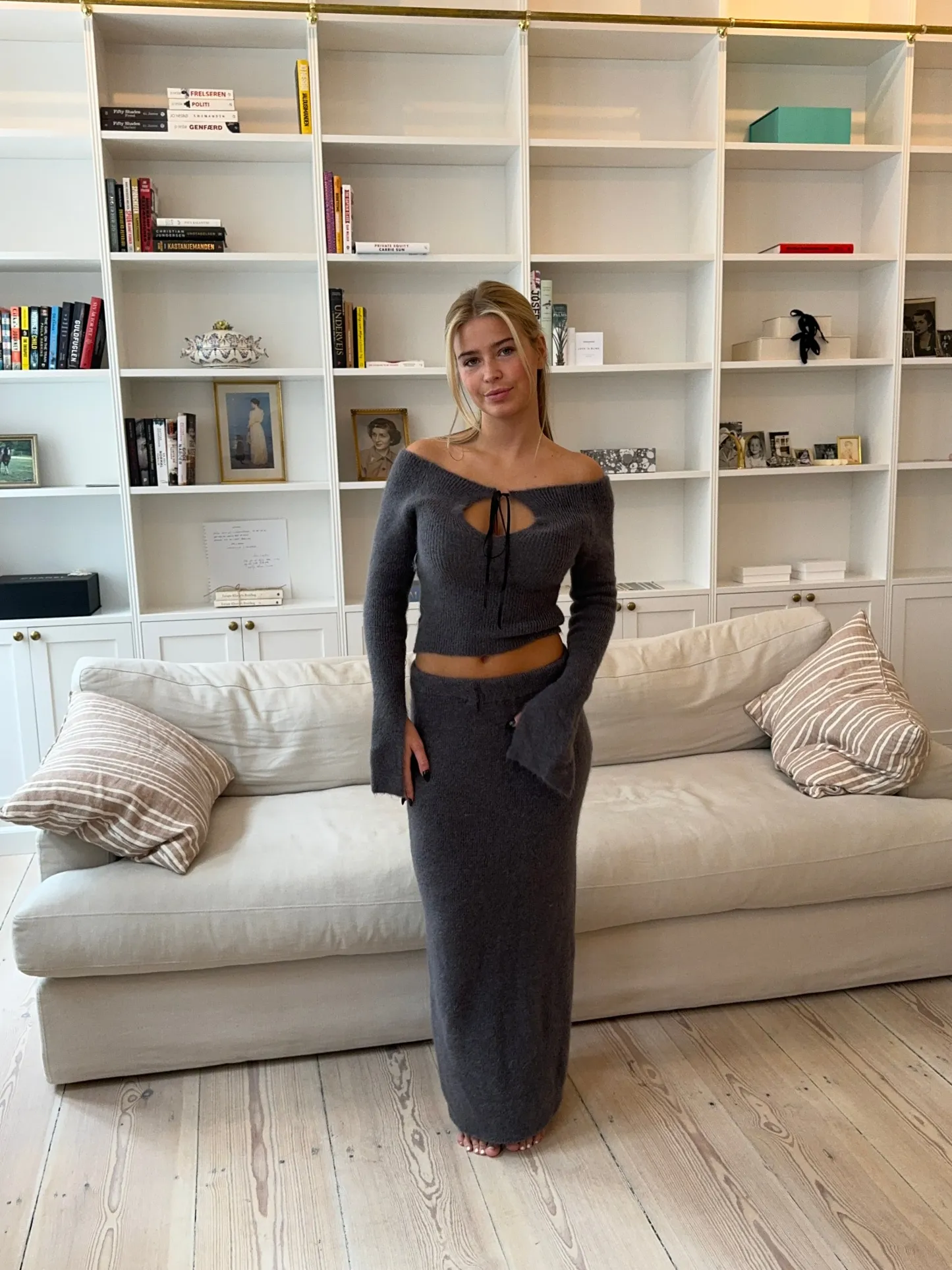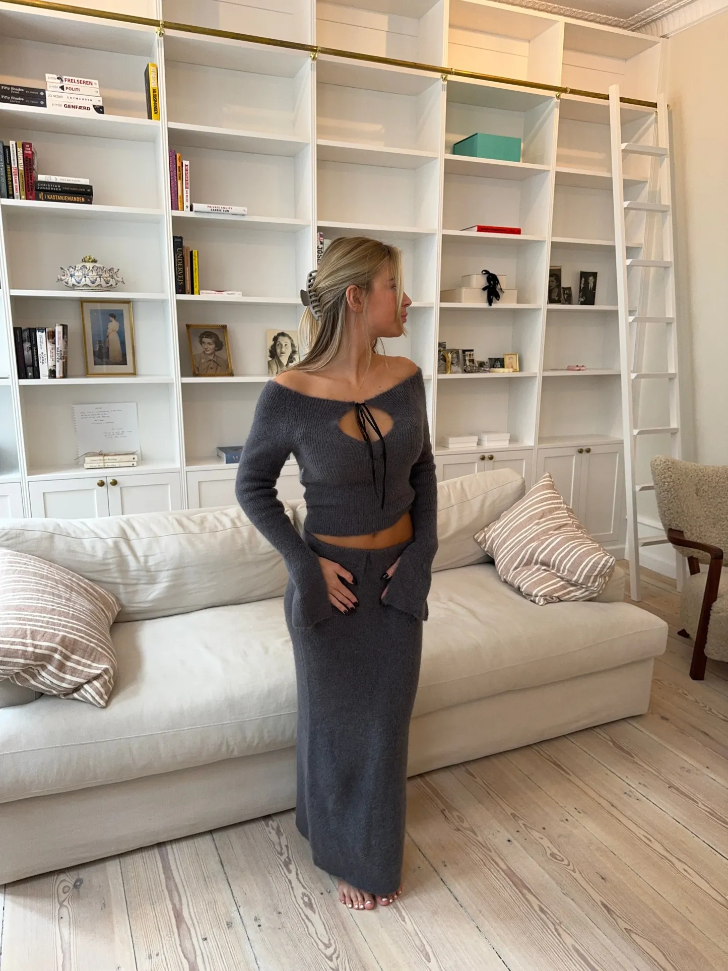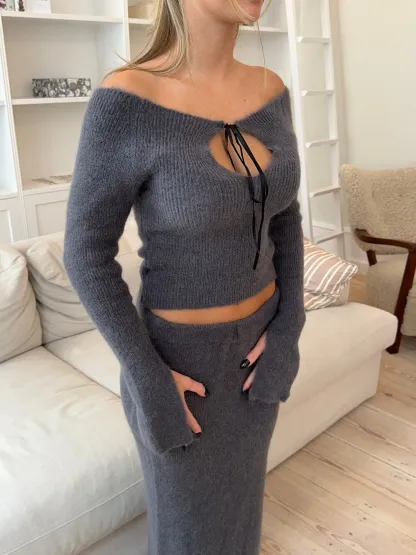This blouse features long, wide sleeves with elegant slits that add a modern touch. The black tie belt in the front creates a sophisticated opening and gives a stylish expression. This blouse is ideal to pair with the matching "Brooke knitted maxi skirt" for a cohesive and elegant look.