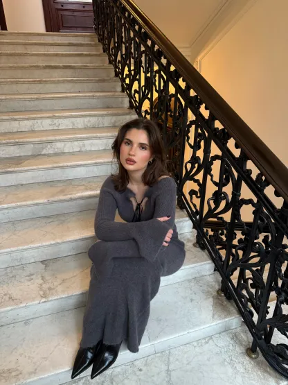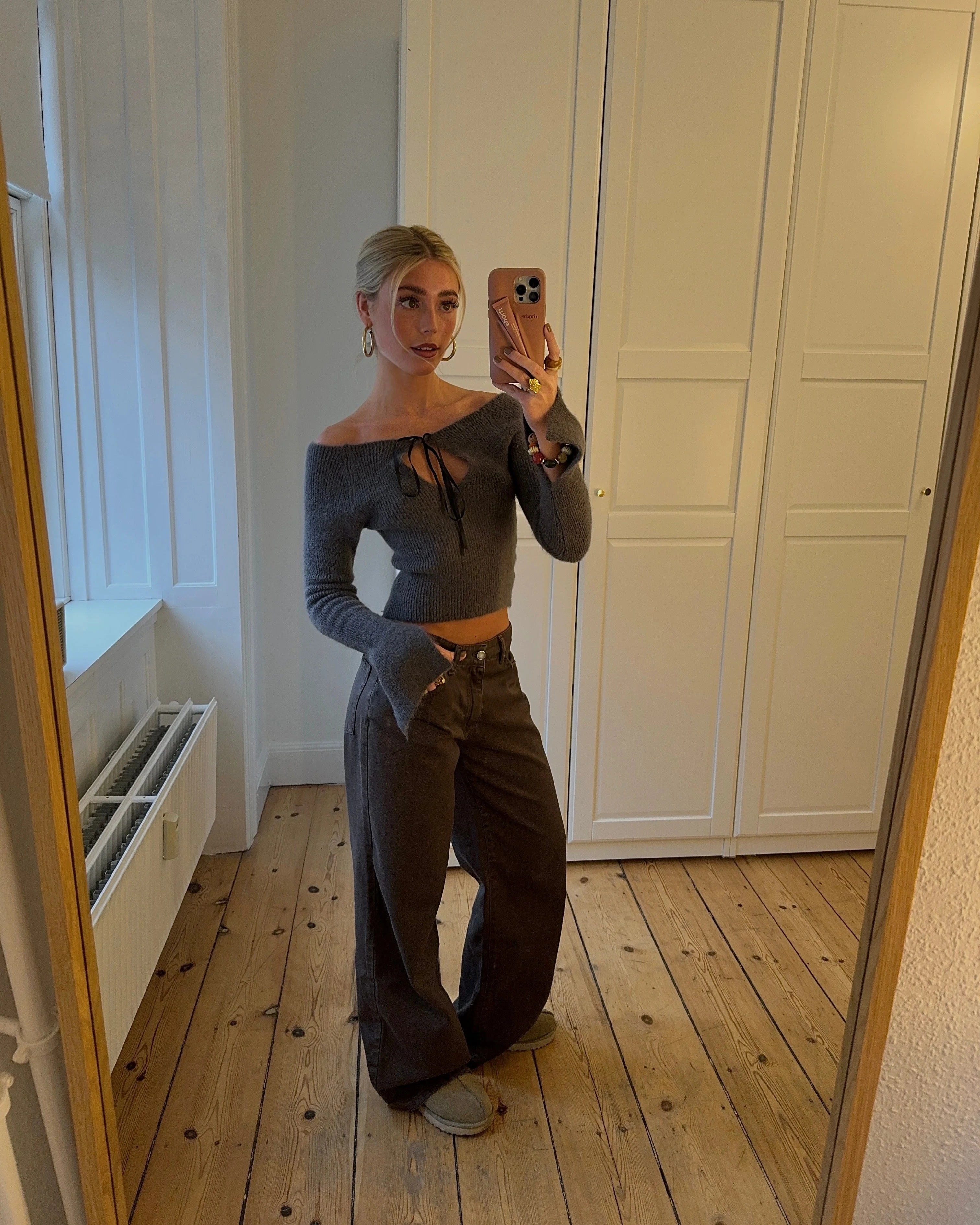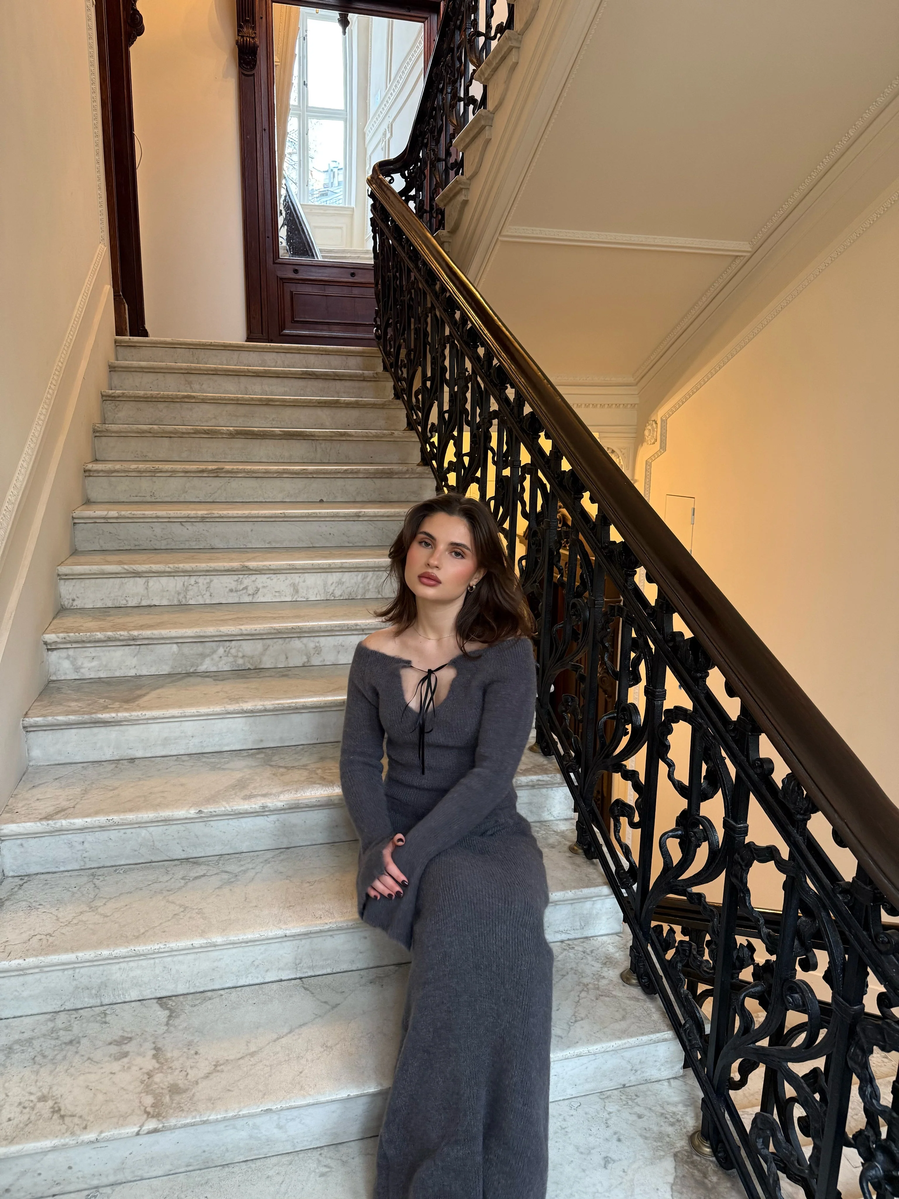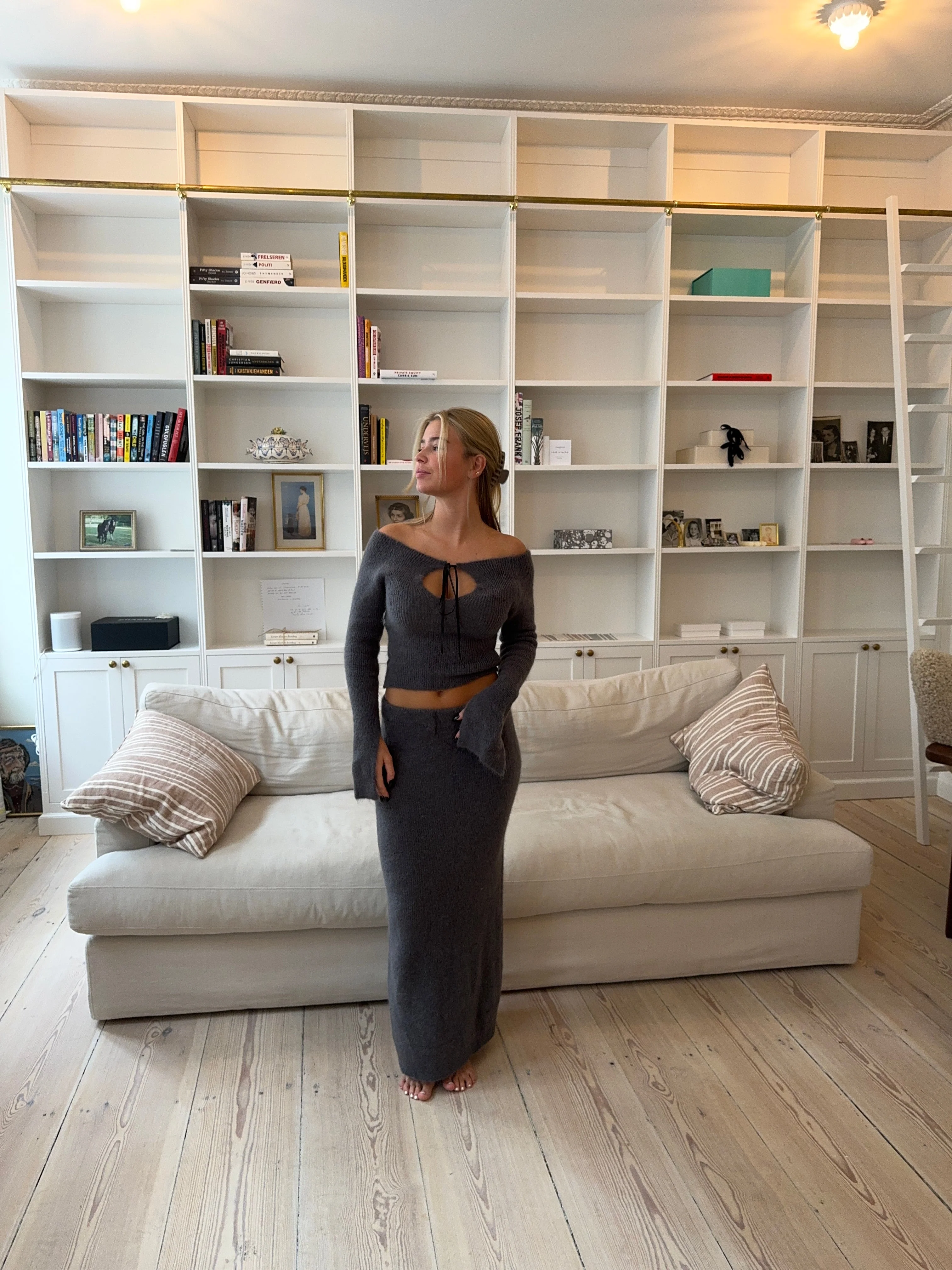 This blouse features long, wide sleeves with elegant slits that add a modern touch. The black tie belt in the front creates a sophisticated opening and gives a stylish expression. This blouse is ideal to pair with the matching "Brooke knitted maxi skirt" for a cohesive and elegant look.