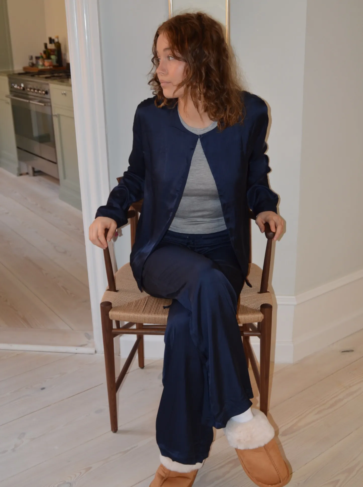 This cardigan is made in the softest satin material and has a loose fit. The cardigan has a button closure in the neckline. It has long sleeves and can be used both at home as a pajamas top or for everyday use. It fits perfectly with our Callie satin pants.