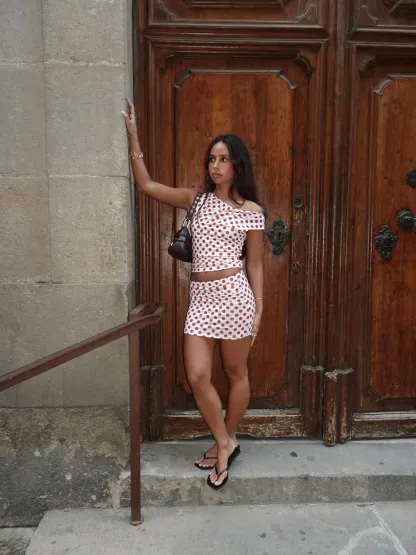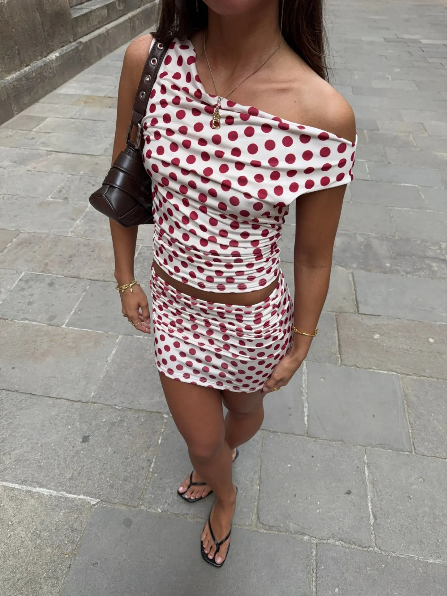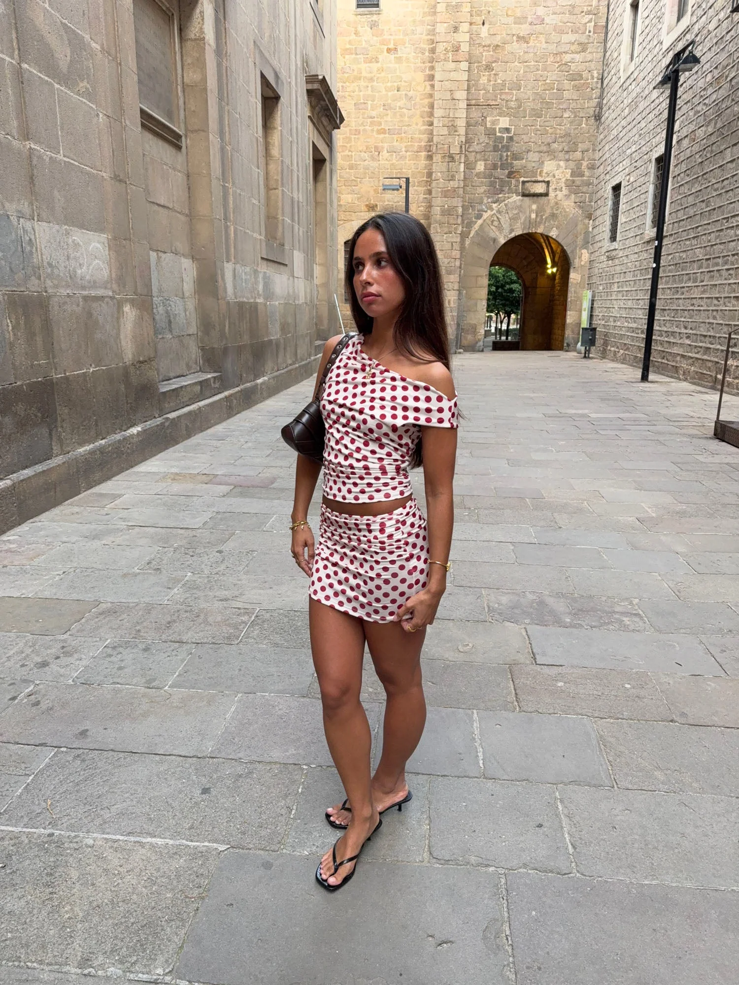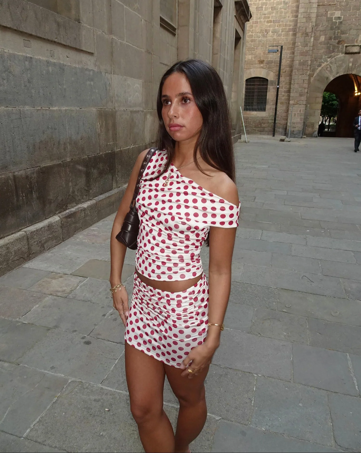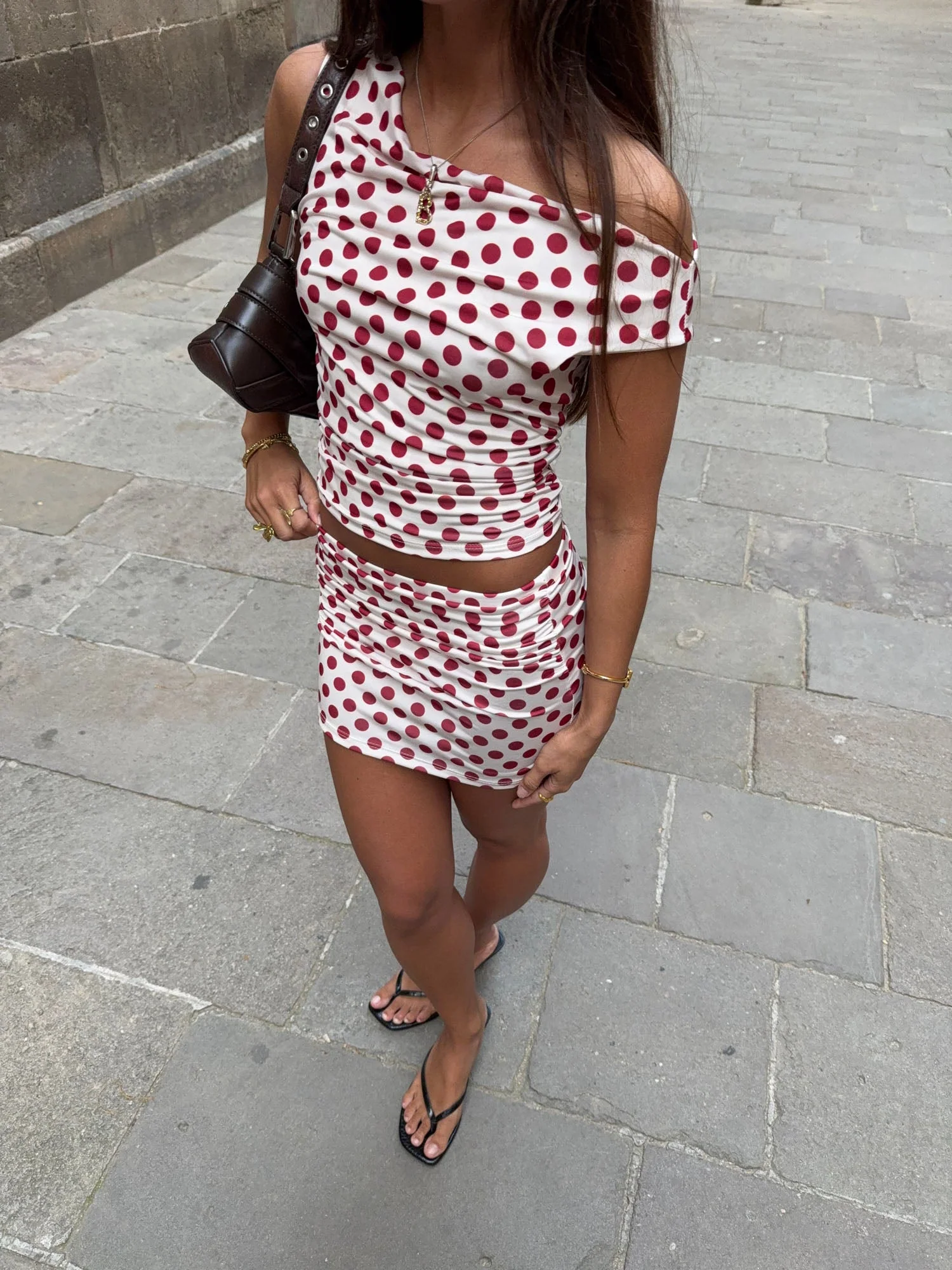 This polka dot one shoulder top brings charm and character to your wardrobe. Designed with a body-hugging fit and subtle ruching at the sides, it flatters the waist while offering comfort and freedom of movement thanks to its stretchy fabric. The top is a one shoulder top which ads a timeless polka print in a fresh, updated silhouette—perfect for both everyday wear and festive occasions. Style it on its own or pair it with the matching skirt for a complete look.