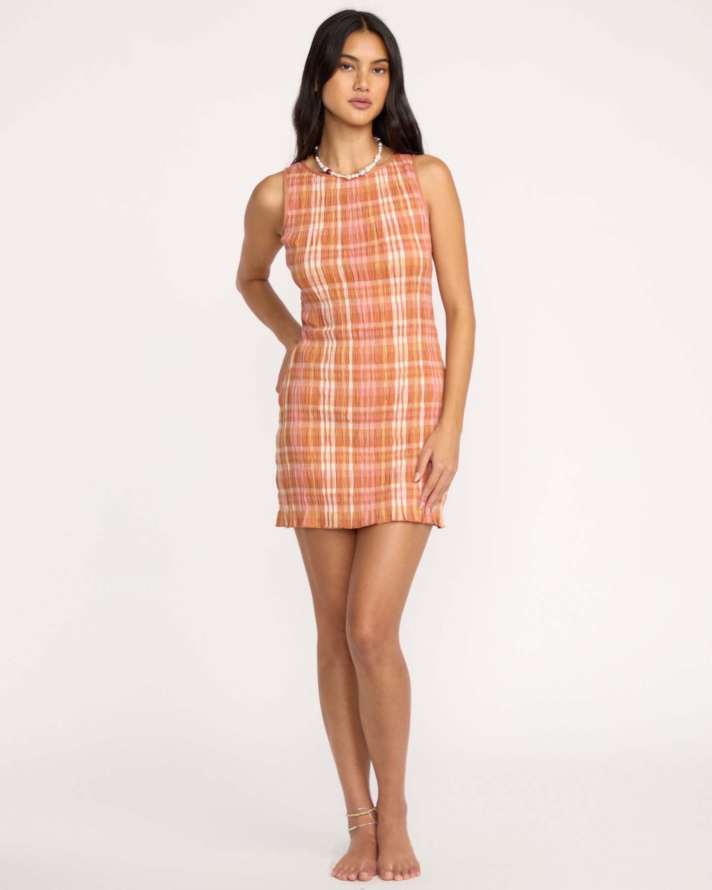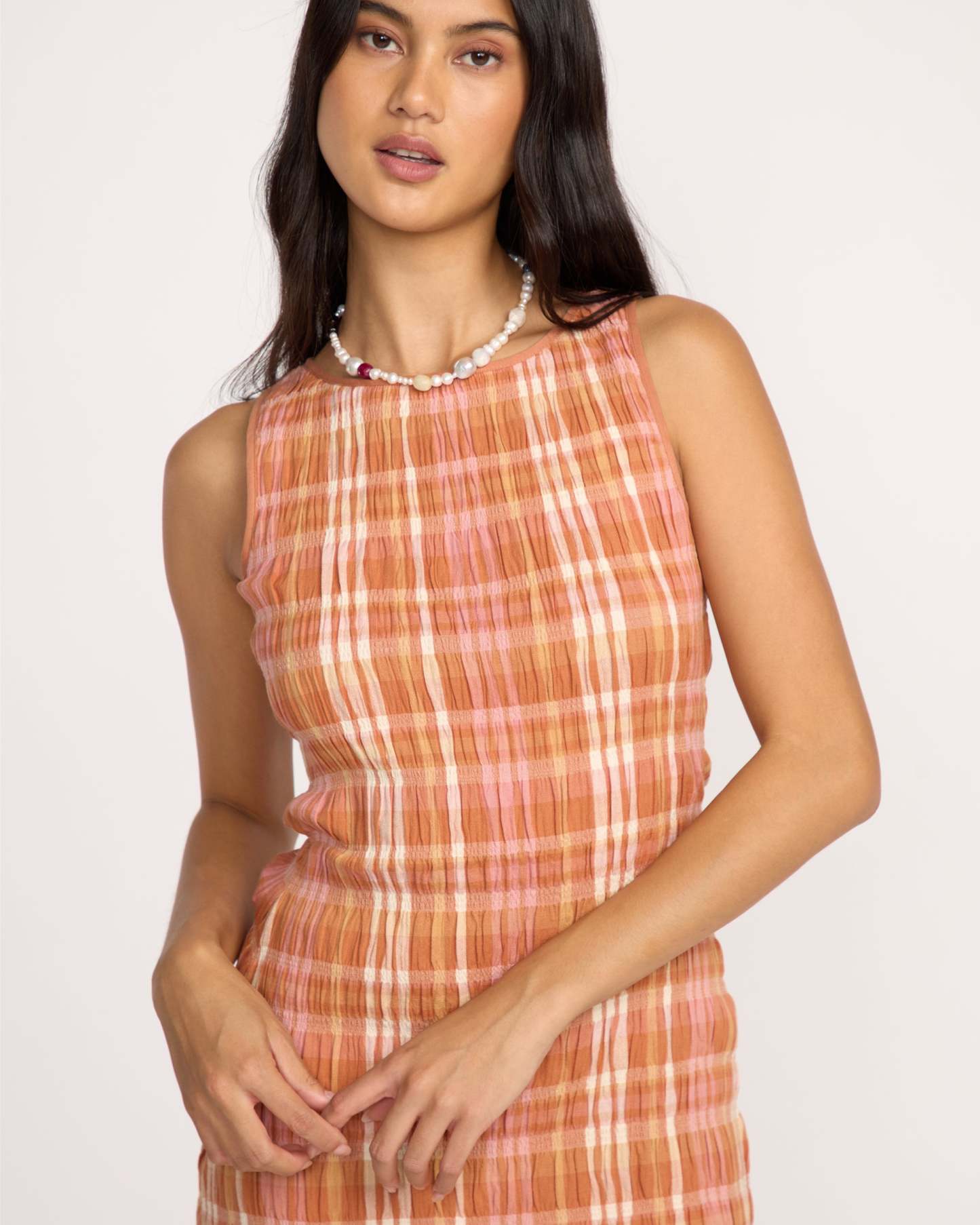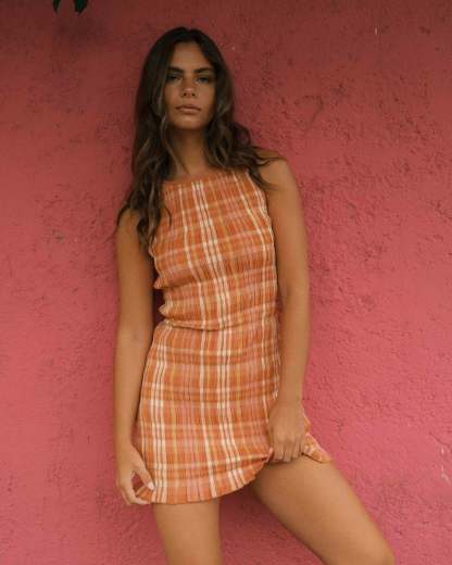 Our form-fitting mini dress hugs your curves with soft cotton-blend comfort. The all-over smocking adds sophisticated texture, while the boat neckline and metal plate detail create an effortlessly polished look. Featured here in the Orange colorway.