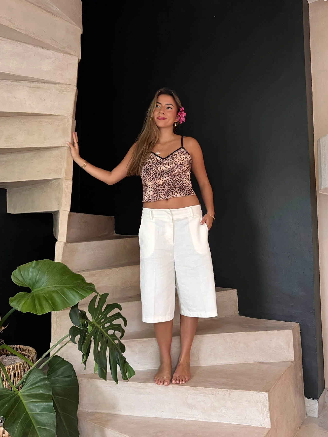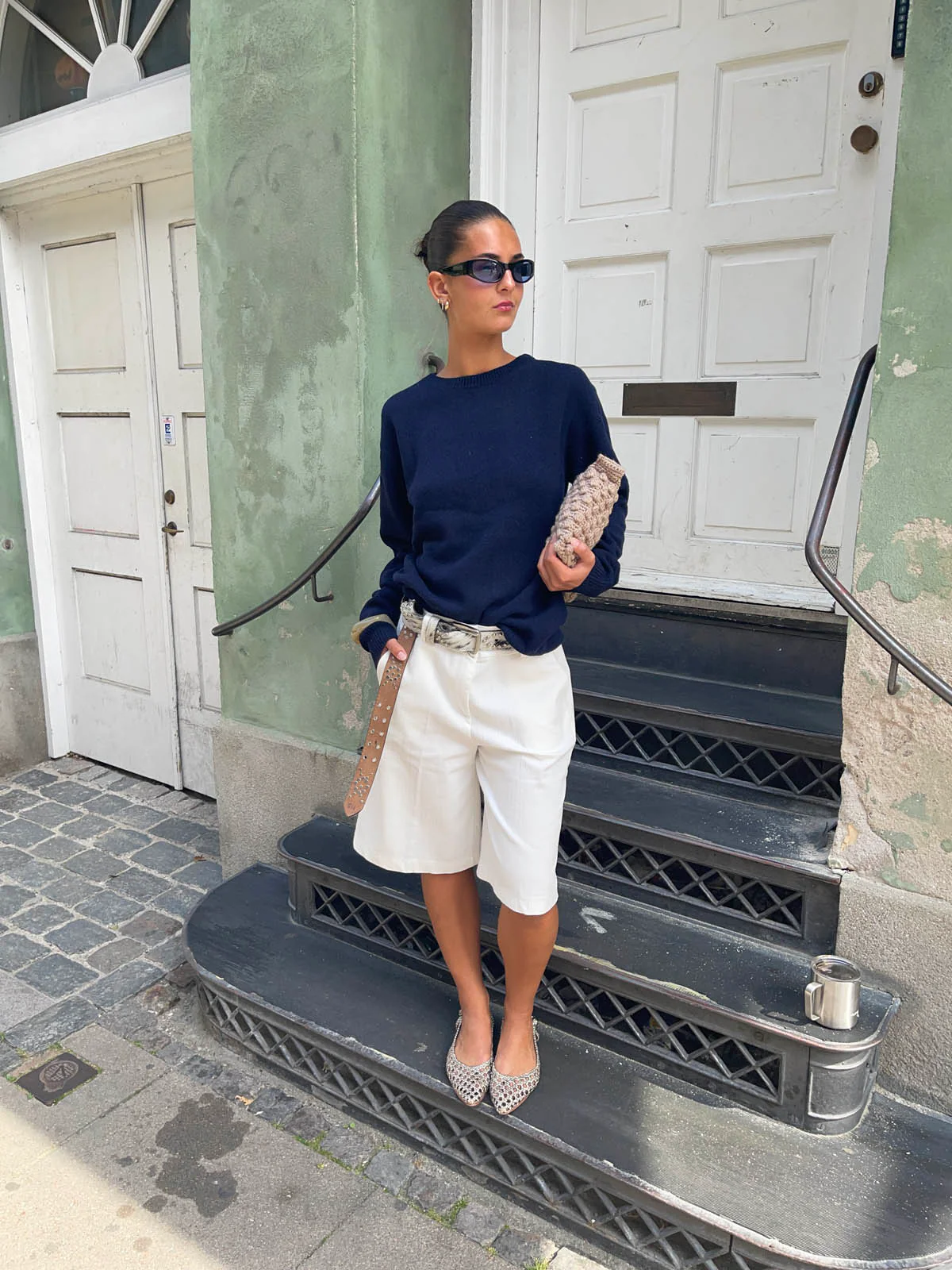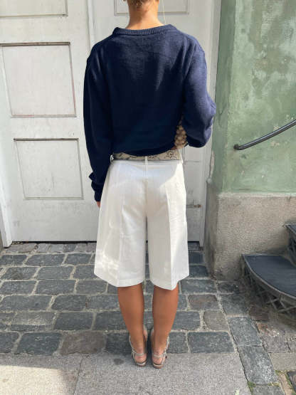 These white Bermuda shorts combine a classic denim look with a tailored fit. An item that can easily be dressed up or down – perfect for both everyday wear and summer outfits.