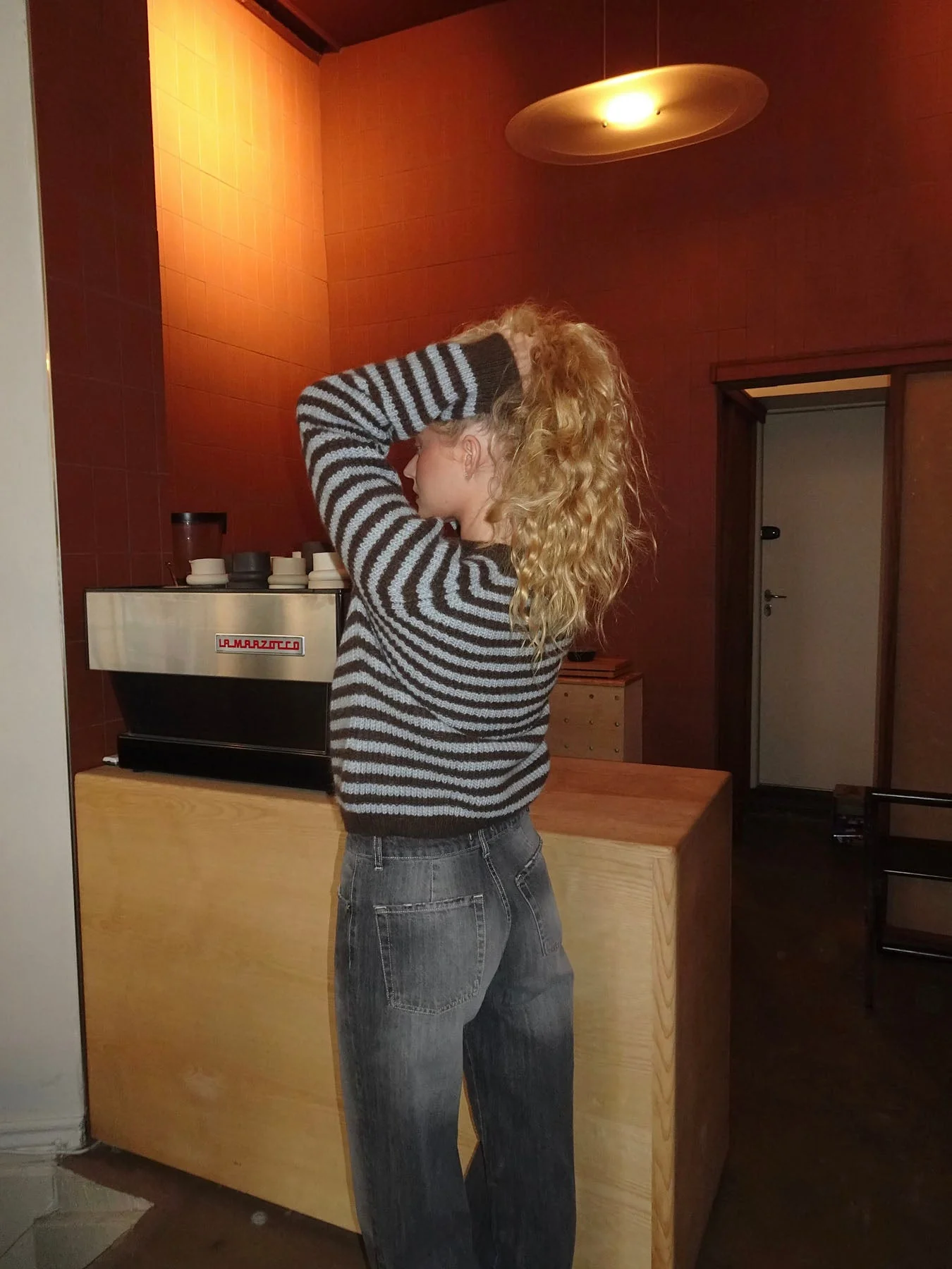 The Cornelie knit sweater in brown and blue is a timeless classic that combines comfort and style. The sweater features a simple, nautical-inspired stripe pattern and a soft, fluffy texture that makes it perfect for cooler days.