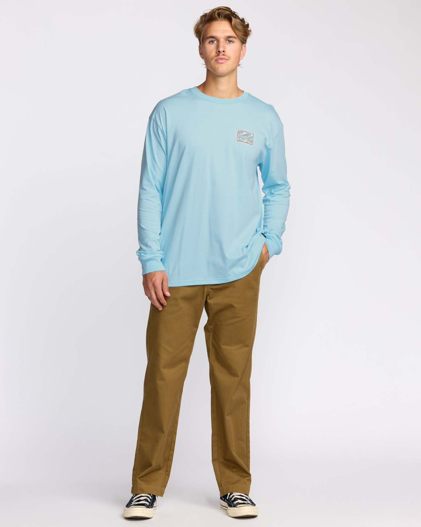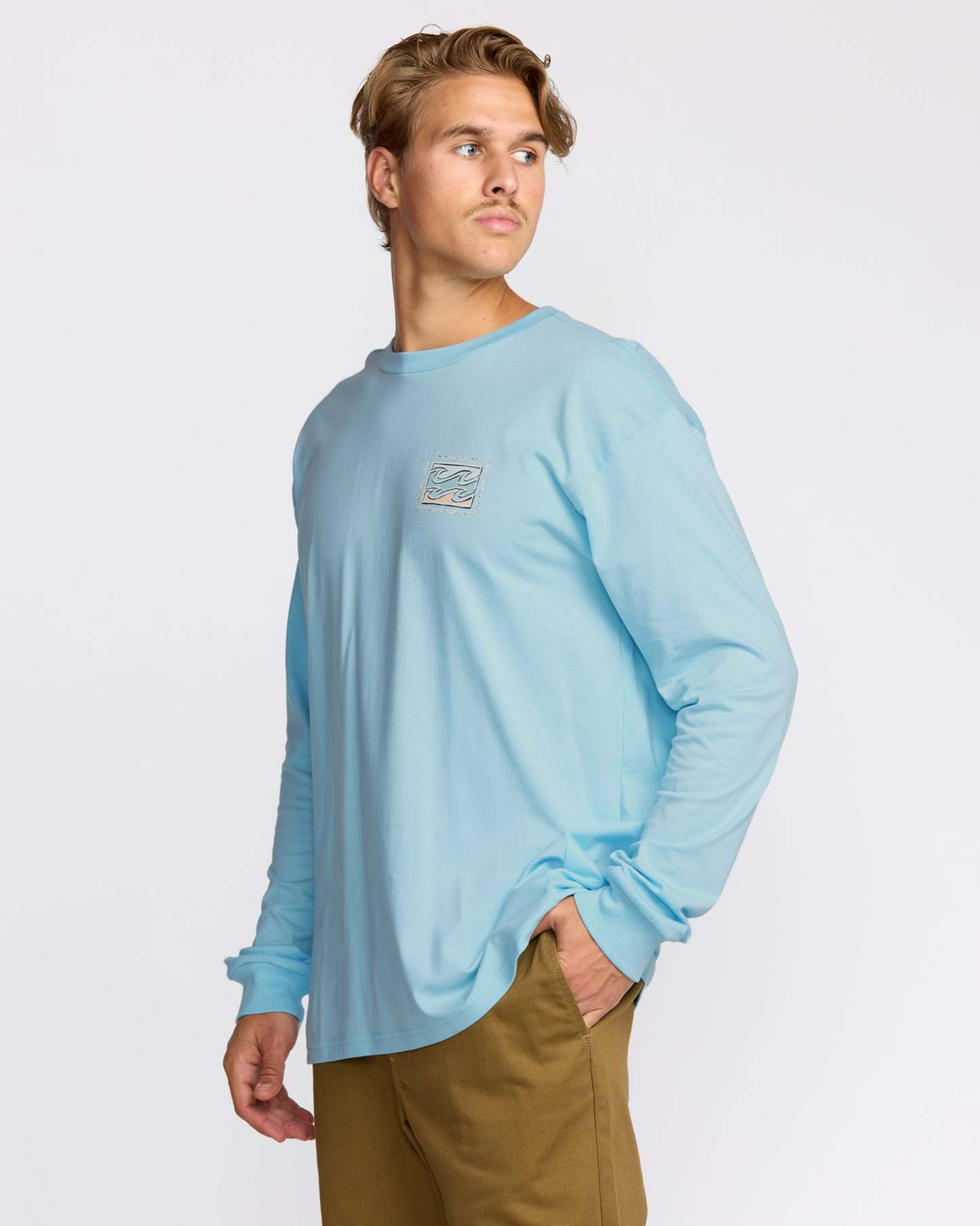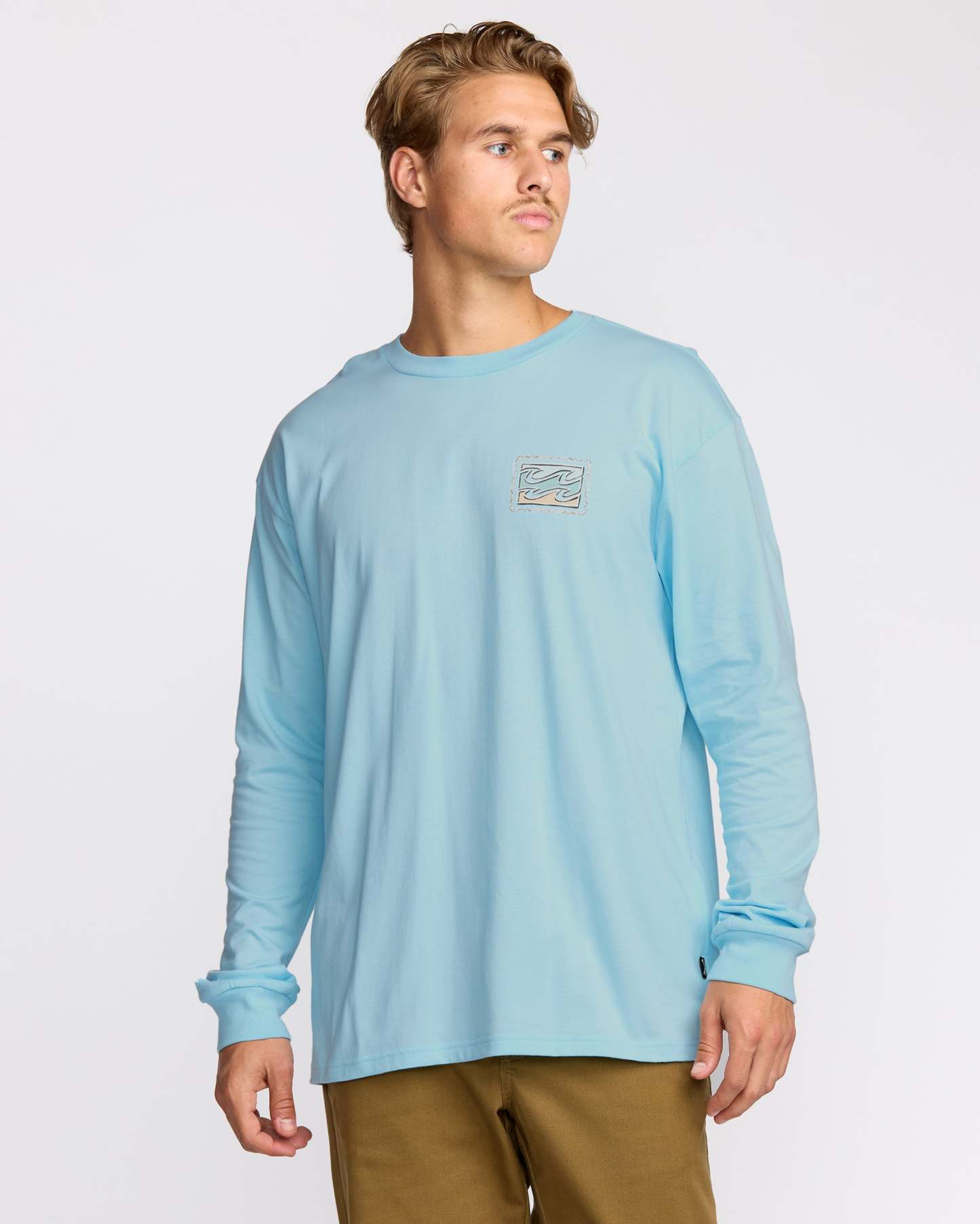 Our classic-fit long sleeve t-shirt brings double the style with front and back screen prints. Relaxed shoulders and garment-washed pure cotton create the laid-back comfort you're after. Featured here in the Blue colorway.