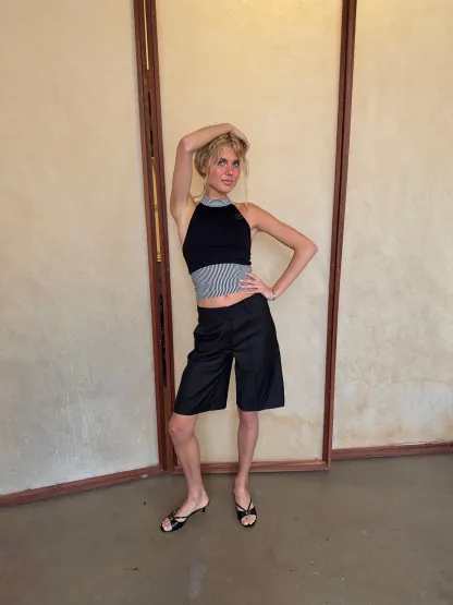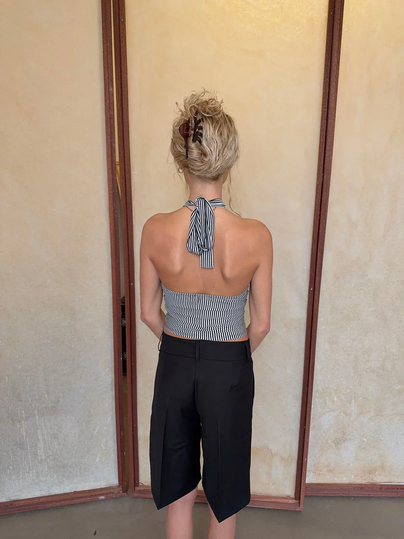 A cool and feminine halterneck top in black with contrasting striped details. Debby features a flattering cut with a tie closure at the neck, creating a light and elegant look with a graphic twist. The combination of the black top and the striped hem adds a modern and eye-catching touch.