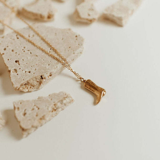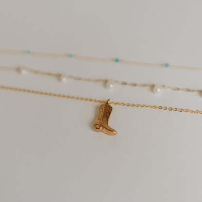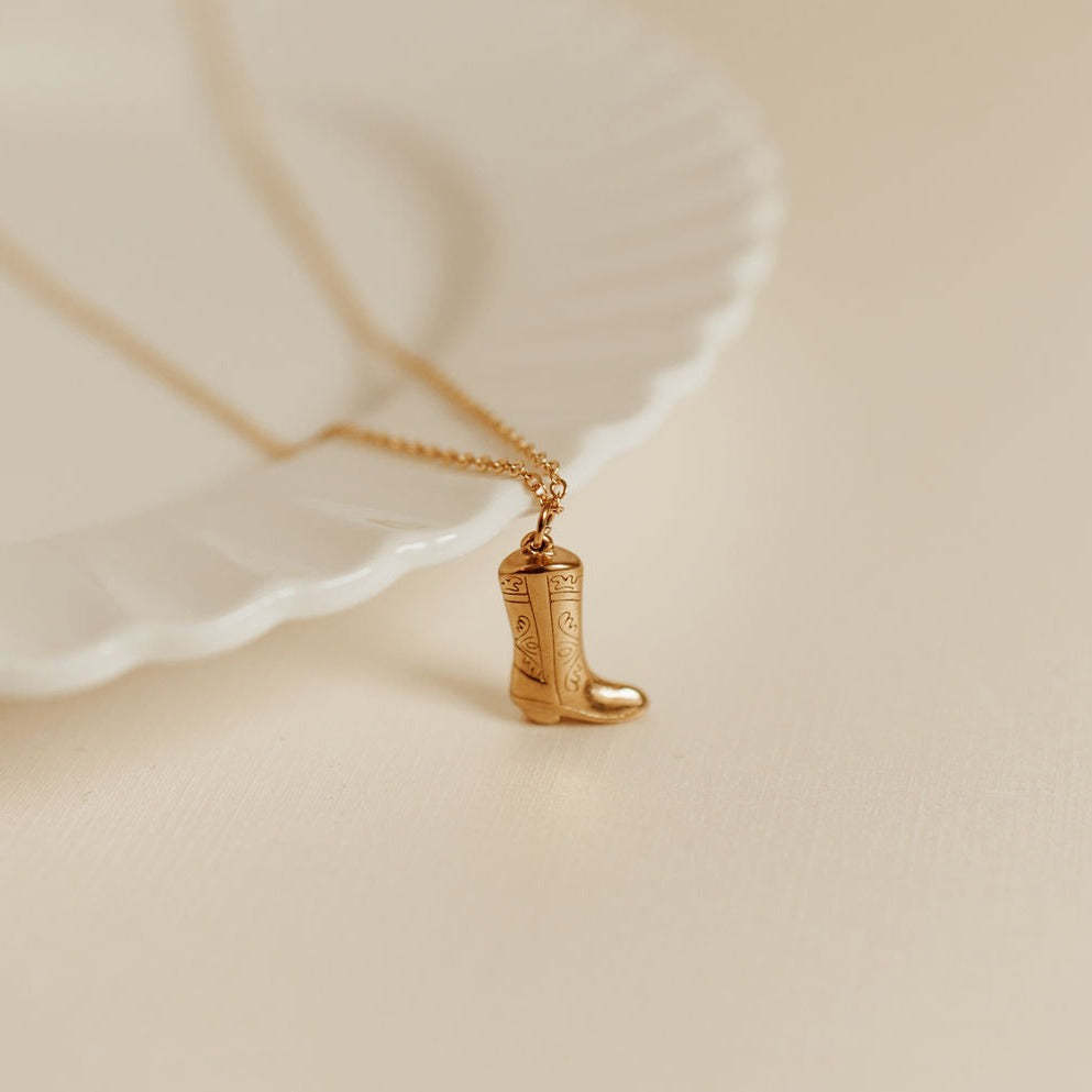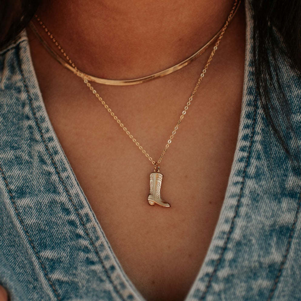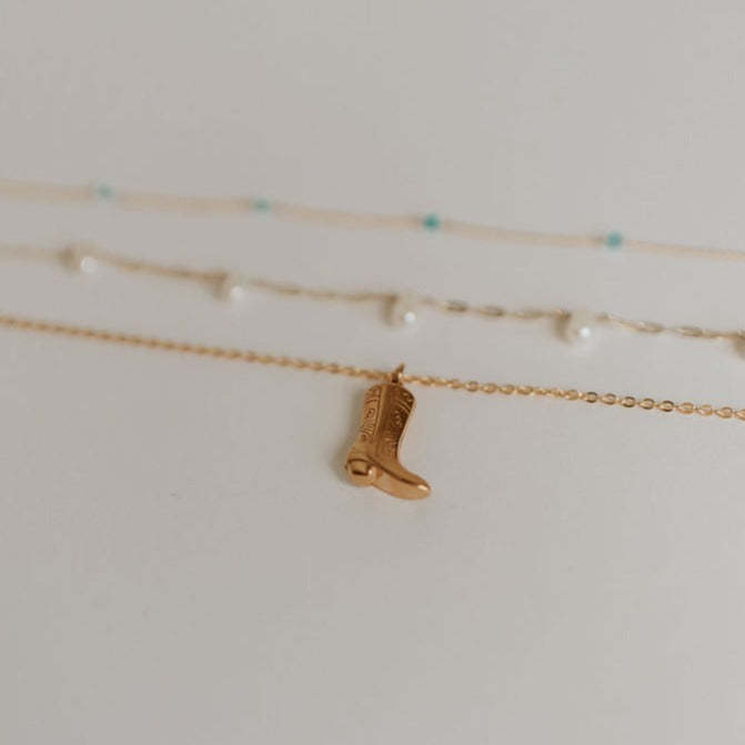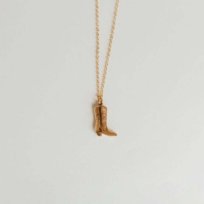 Calling all cowgirls! The Dolly Boot Necklace is the perfect accessory for all our rodeo sweethearts! Cute little boot charm attached to a dainty, high-quality gold covered chain. Stainless steel charm. Chain length is 16" with an extender to 18".