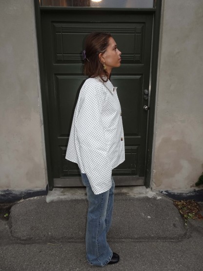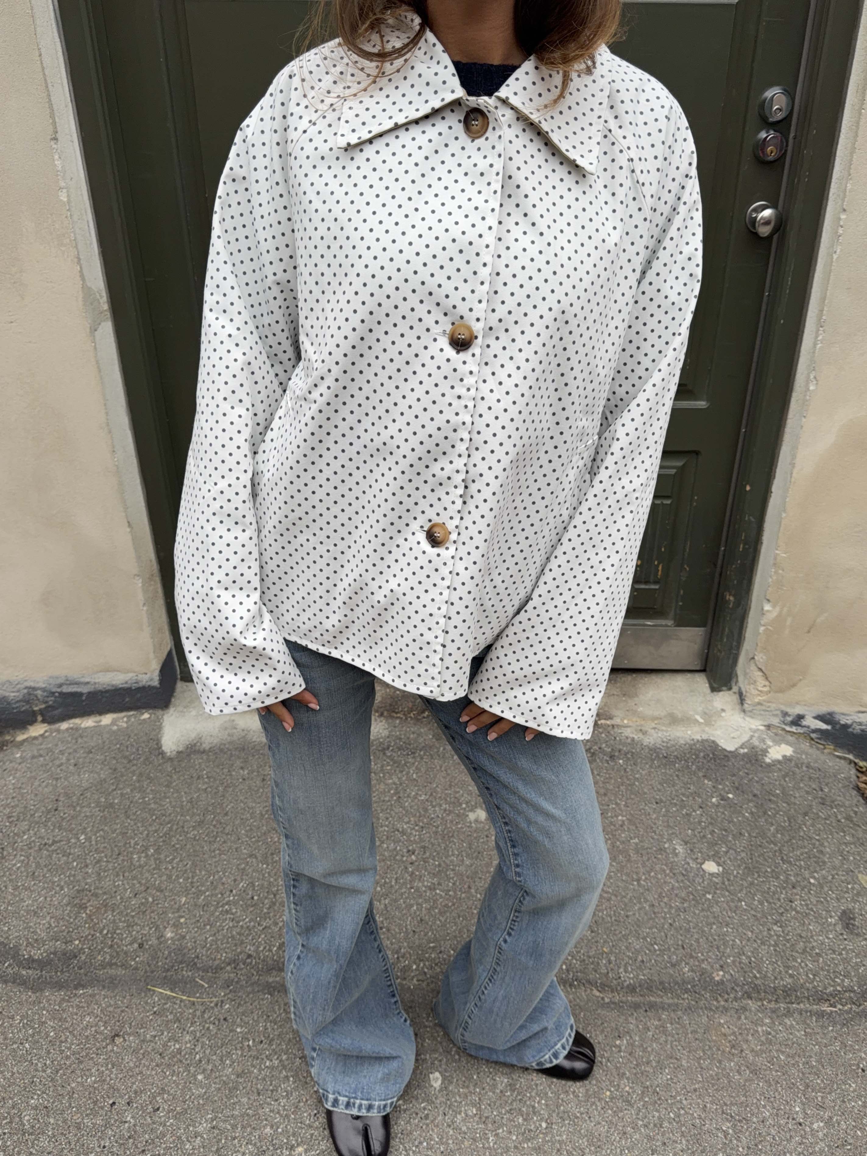 A short white jacket with small black dots in an even polka-dot pattern. The jacket features a classic collar, long sleeves, and a straight, boxy fit. It closes with three visible buttons at the front and has discreet side pockets that give it a simple and stylish look. The fabric appears light and smooth, perfect for a fresh and modern outfit.