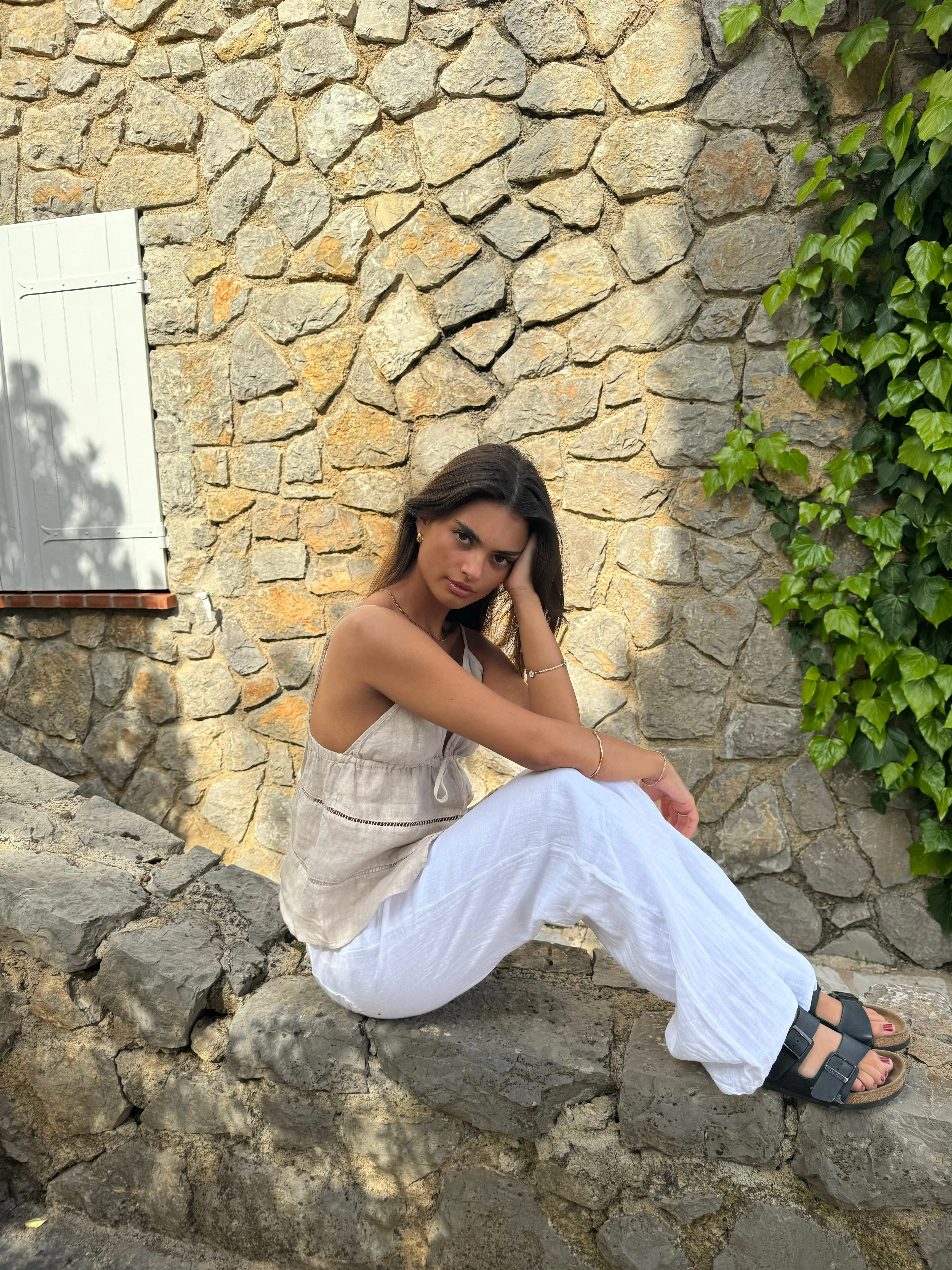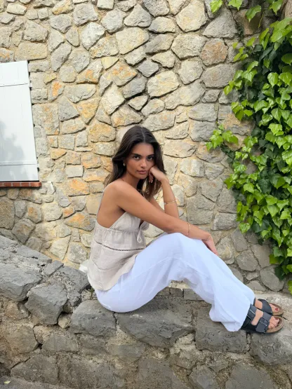 Our beige Ebba top is made of the most delicious linen material, which gives the perfect summer look! The top has thin straps and a fine tie detail, which makes it adjustable. Also available in white.