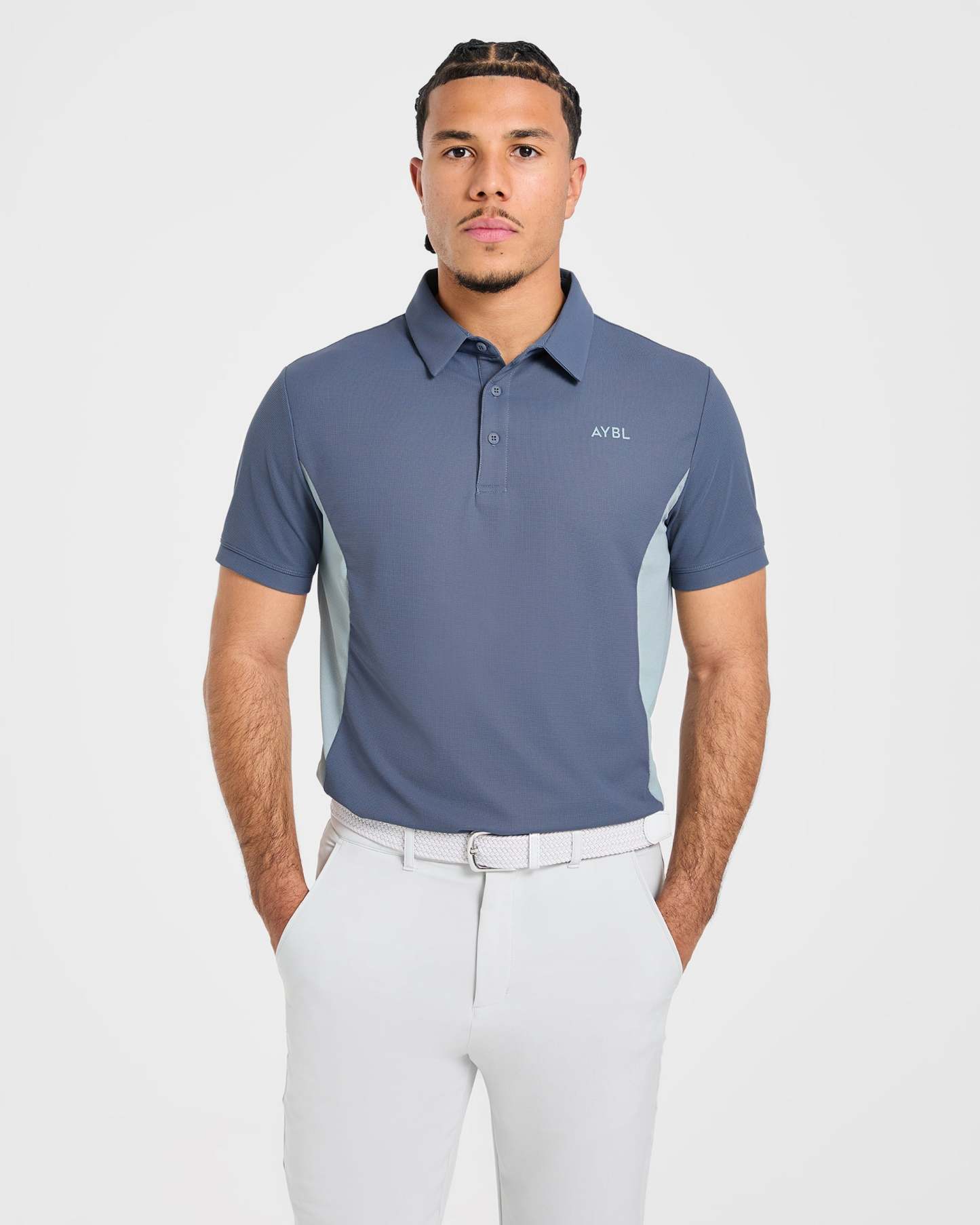 Our Edge Polo is the ultimate blend of style and functionality for the modern golfer. The soft, lightweight textured fabric with added stretch keeps you cool and moves effortlessly with every swing. It features a classic polo fit with short sleeves and a versatile length that can be tucked in or out. Finished with clean cut panelling detail, a classic collar and a button placket opening with AYBL branded buttons.
