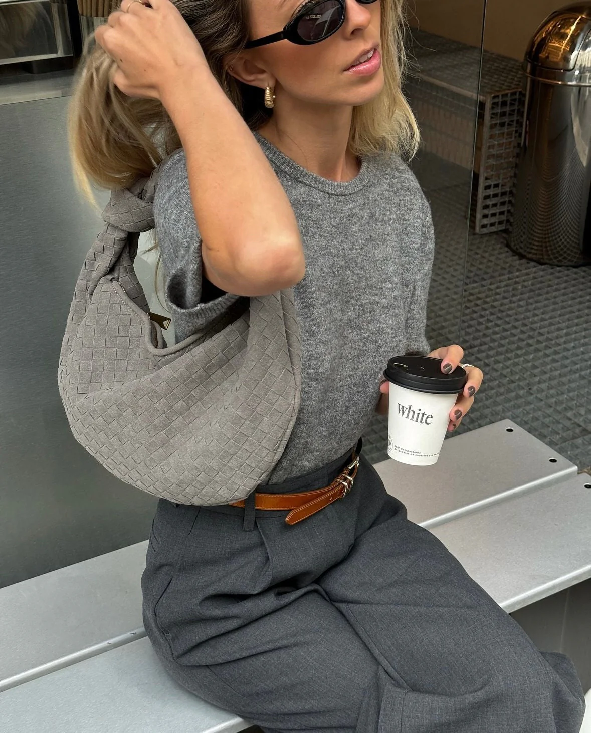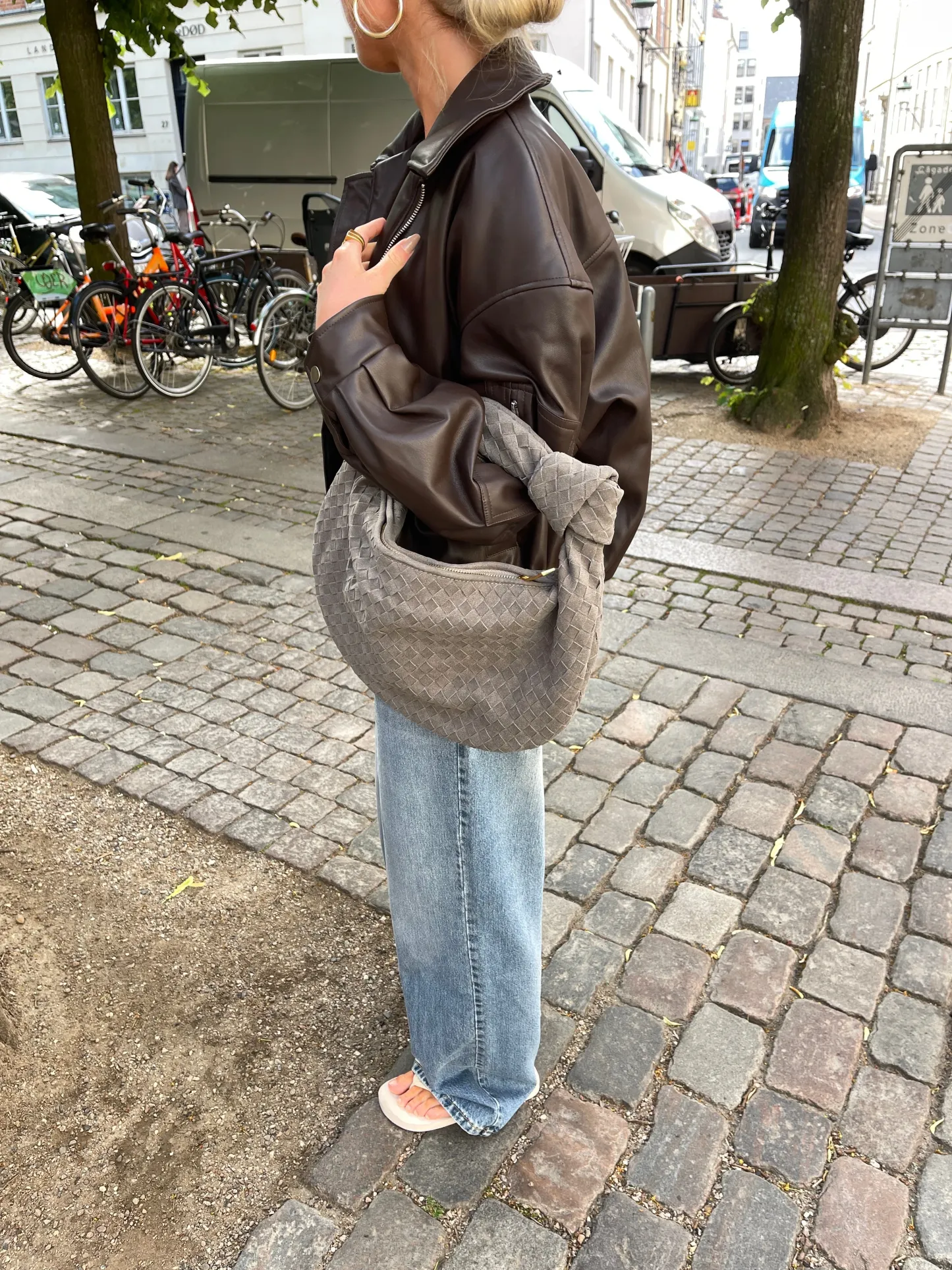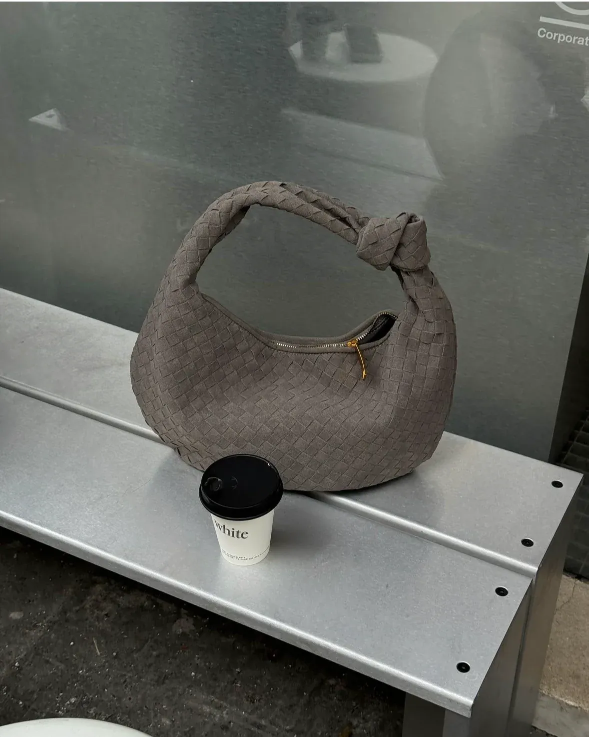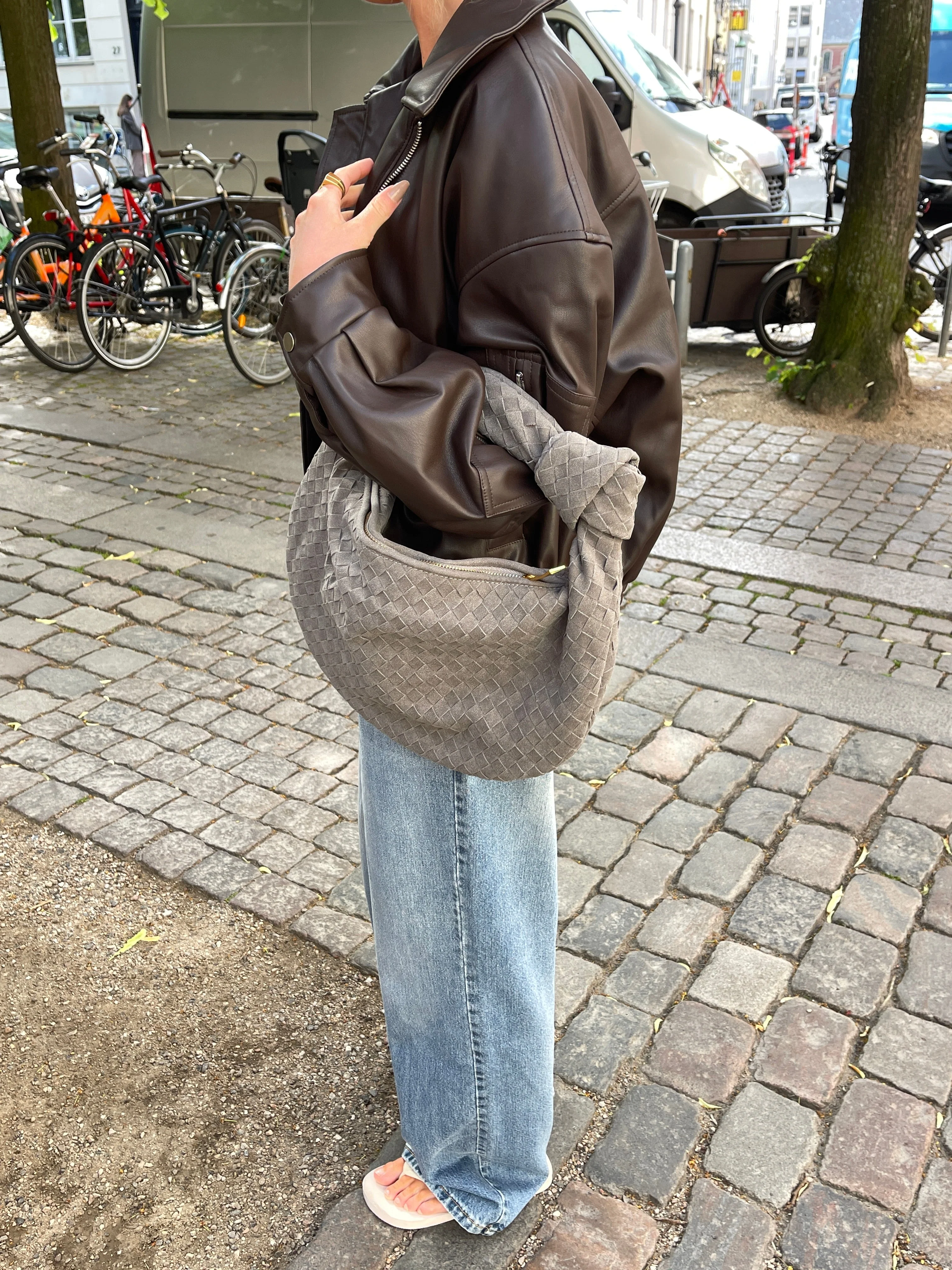 Our Florence shoulder bag in a new suede version. The bag features a round shape with a woven/plaited design and knot detail. It has a spacious main compartment with a zipper closure, and a smaller zippered pocket inside. Perfect for a day out in the city or for everyday use.