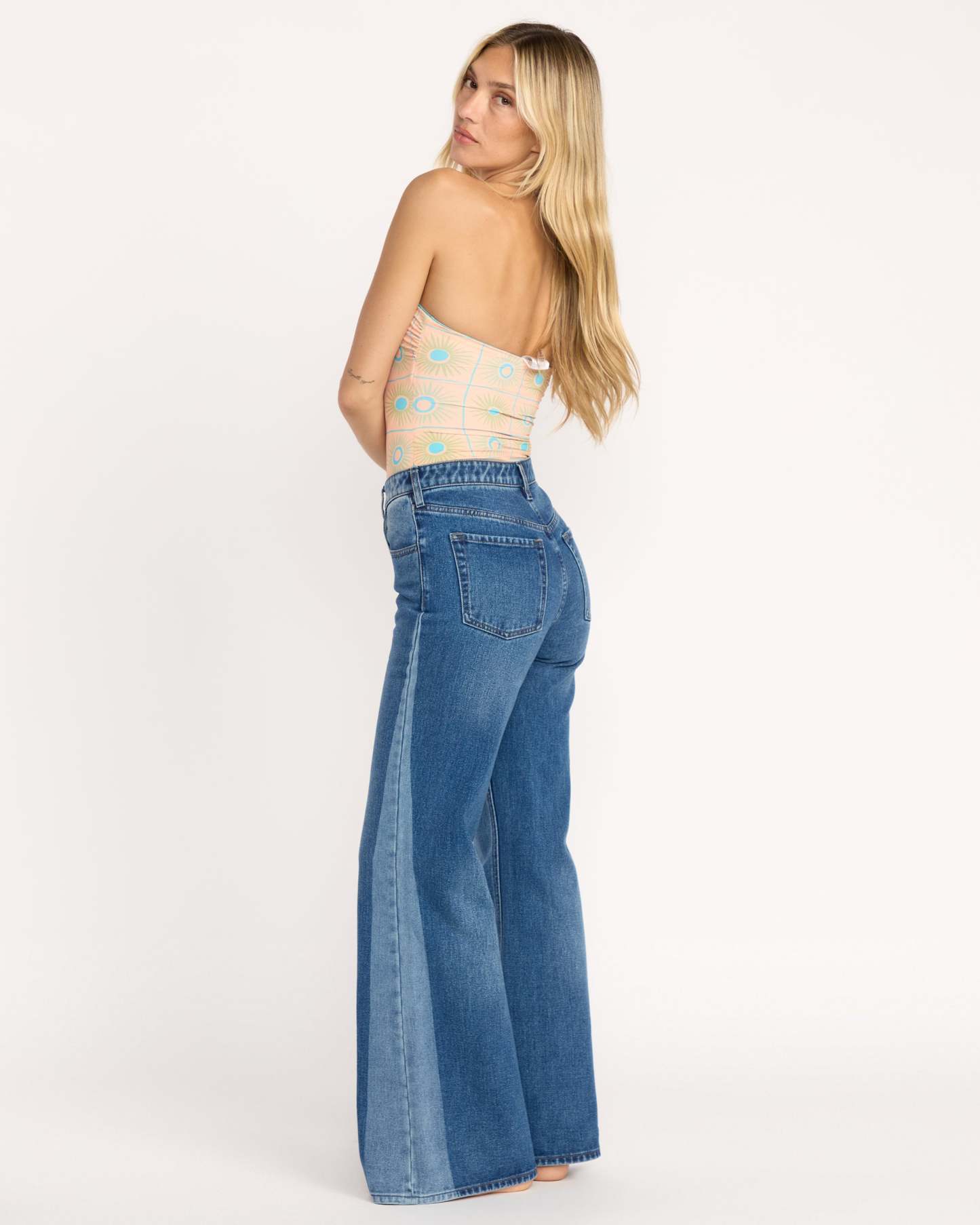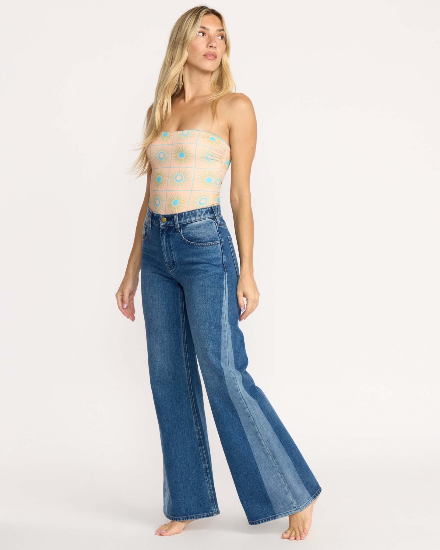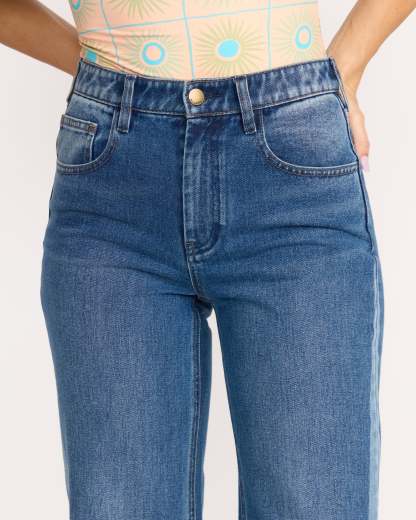 Our pure cotton denim pants show off your curves with a fitted hip and dramatic flare leg. The fixed high waist and five-pocket styling create a flattering silhouette in two-tone rigid denim. Featured here in the Blue colorway.
