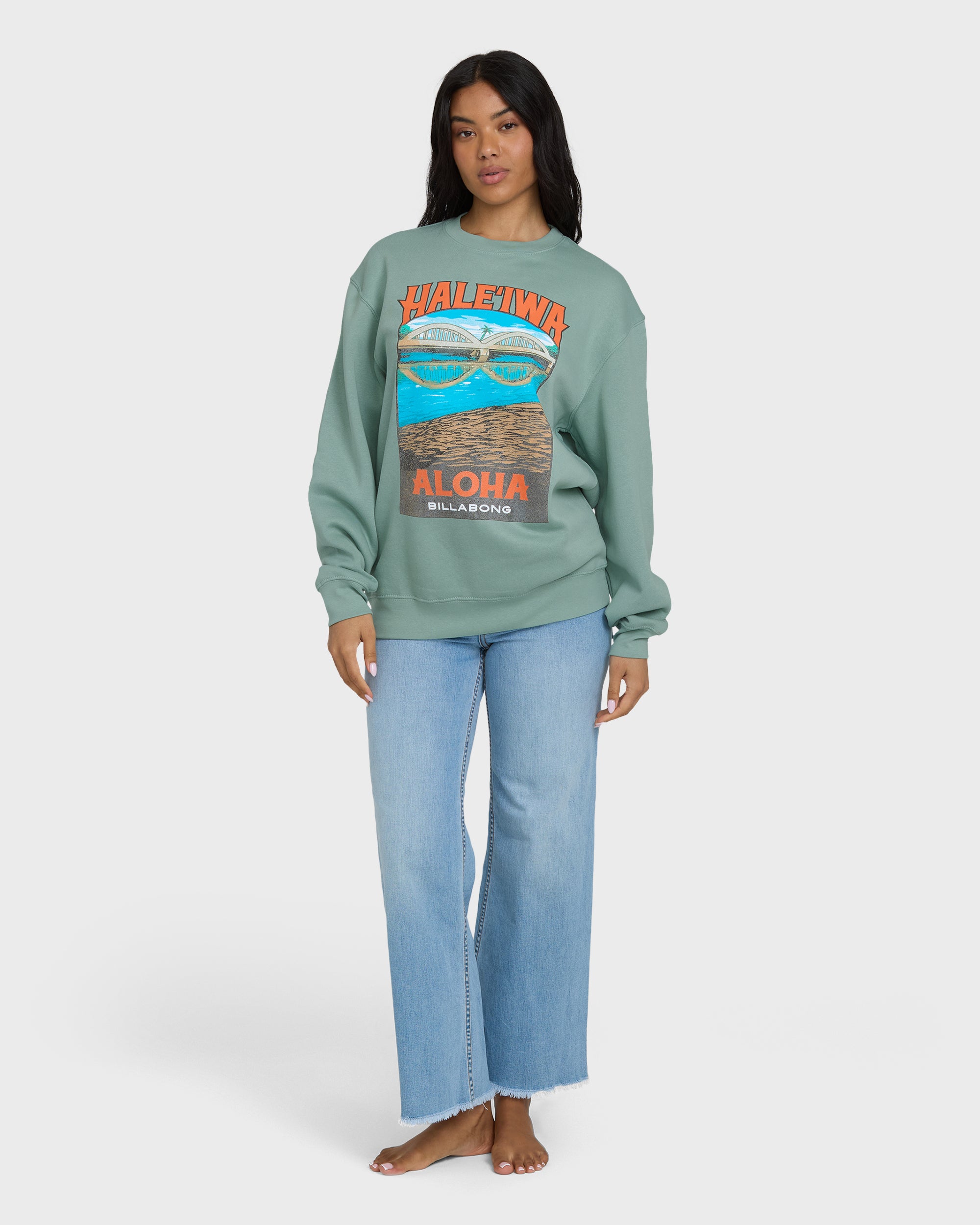 Bring the laid-back energy of the North Shore anywhere you go. This relaxed crew fleece features a soft, cozy interior and bold scenic artwork inspired by Haleiwa’s iconic coastline — an easy everyday piece with warm island vibes.
