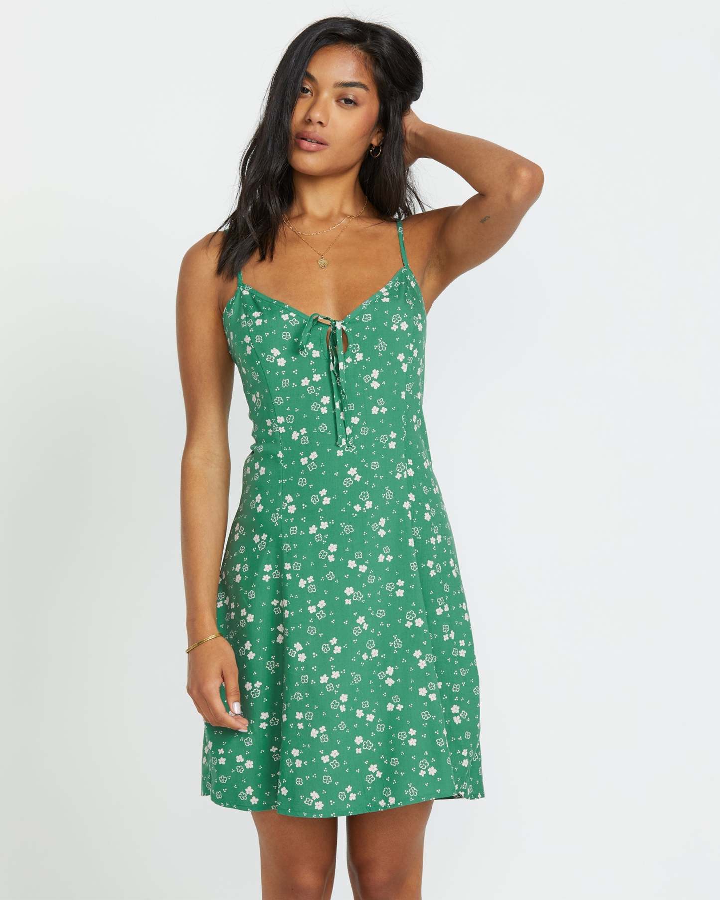 Steal a kiss from the tropics in this dreamy island mini slip dress. Our Billabong body-skimming viscose number flaunts a plunging v-neck with a flirty self-tie detail. Back zipper closure keeps it sweet-and breezy for warm destination nights. Featured here in the Island Green colorway.