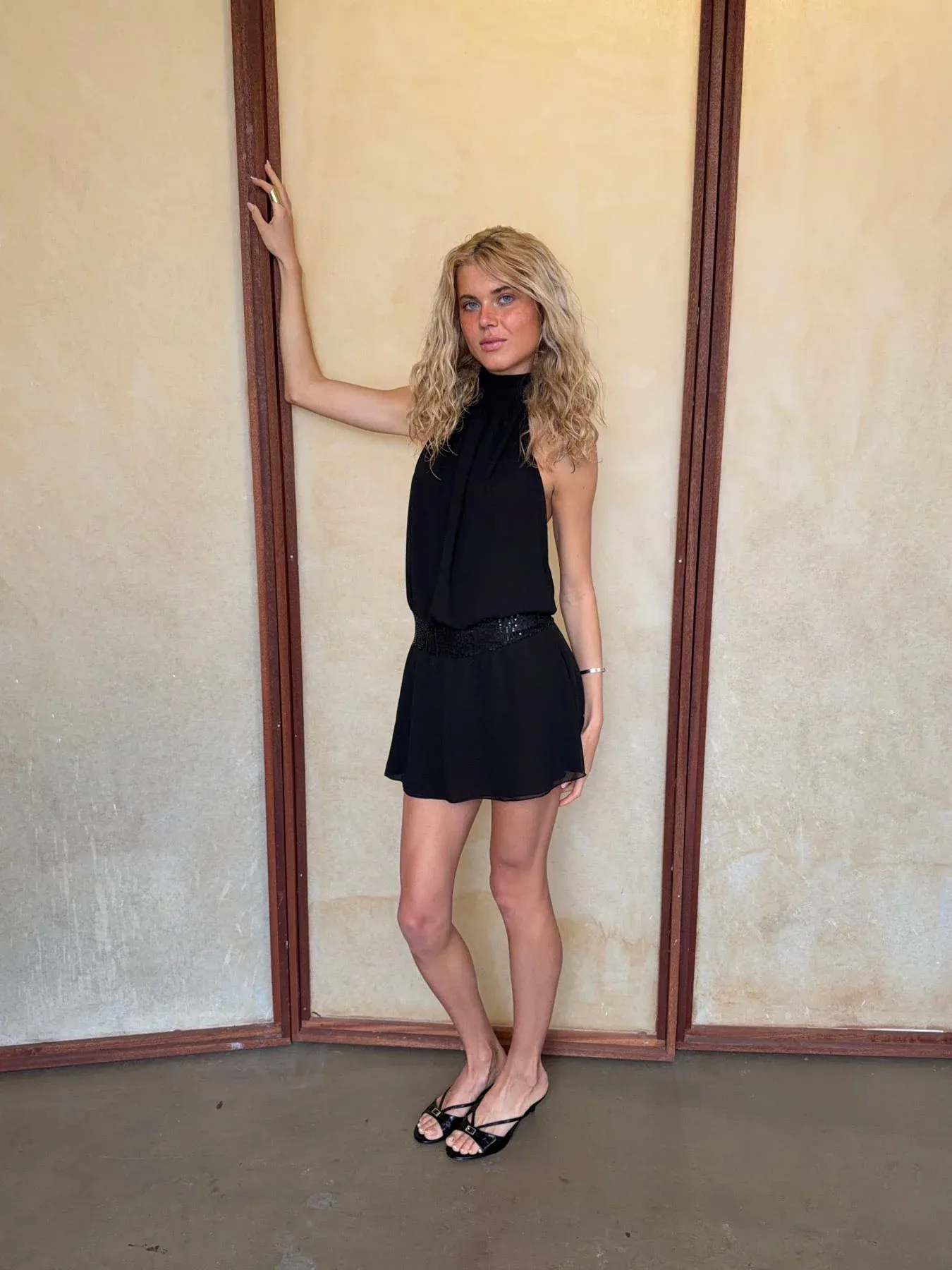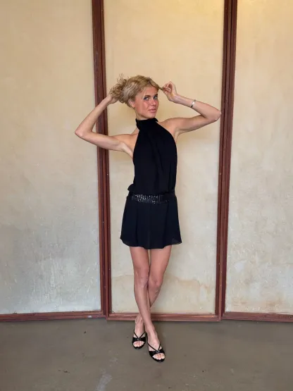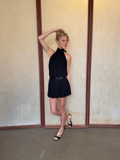 Elegant and feminine black halterneck dress that creates a sophisticated and timeless look. The dress features a beautiful open back with tie closure at the neck, highlighting the shoulders and back in a stylish way. The waist is accentuated with a subtle, shimmering belt that creates a flattering silhouette, while the light and airy skirt adds a feminine drape and graceful movement.