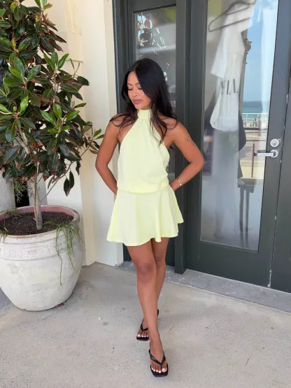 Our Kaiana dress is the perfect combination of cool and feminine. It’s designed with an elasticated waist that creates a flattering silhouette, and a wide tie belt that can be styled creatively around the neck or back. The open back and short, flowing skirt make it ideal for warm summer days or evenings when you want to feel both relaxed and stylish.