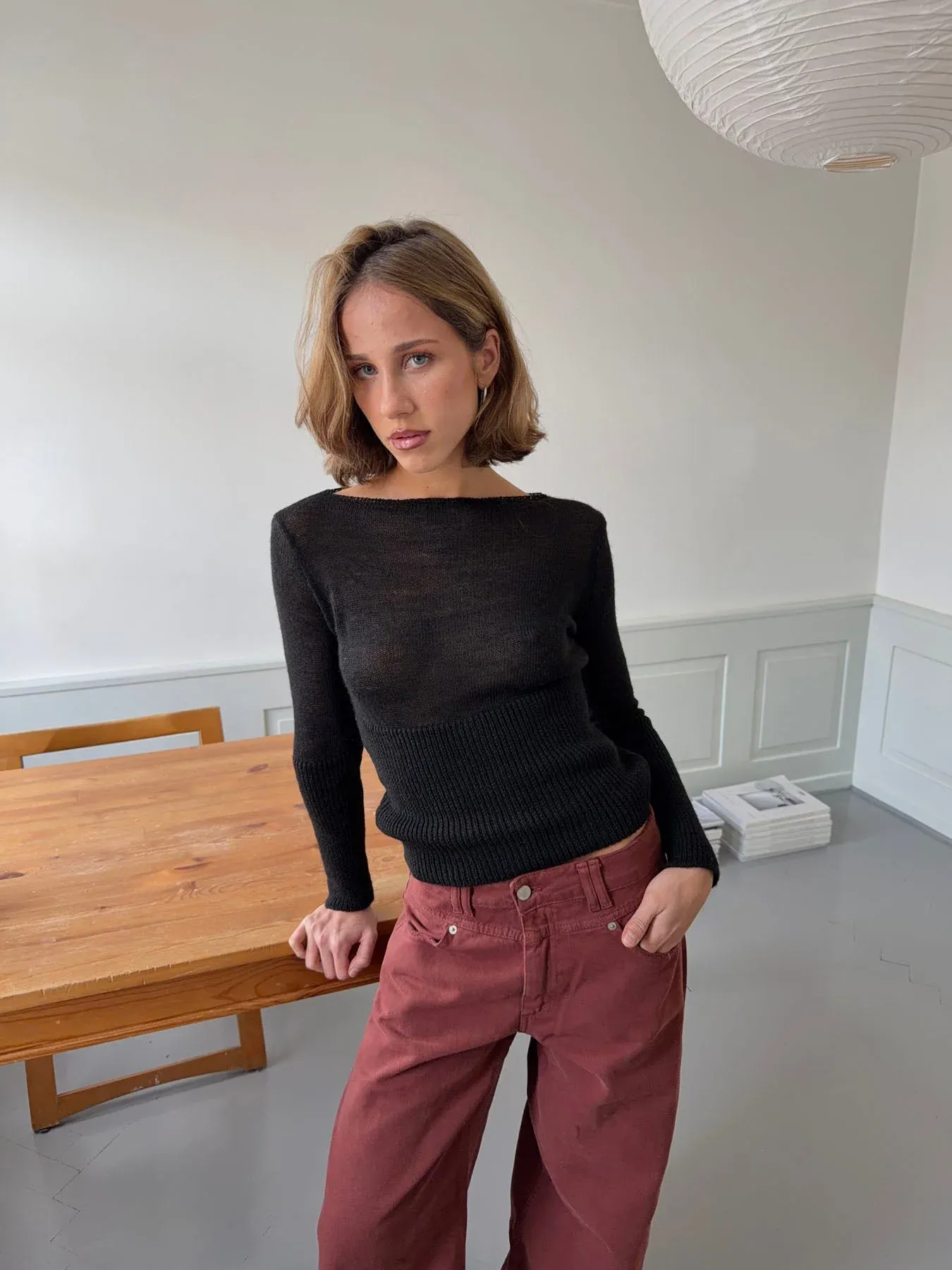 This elegant knit blouse in a black shade combines comfort and style with a modern cut. The soft knit drapes beautifully over the body and highlights the waist with its wide ribbed hem. The blouse features a boat neckline that adds a sophisticated touch, along with long, slim sleeves for a timeless and feminine look.
