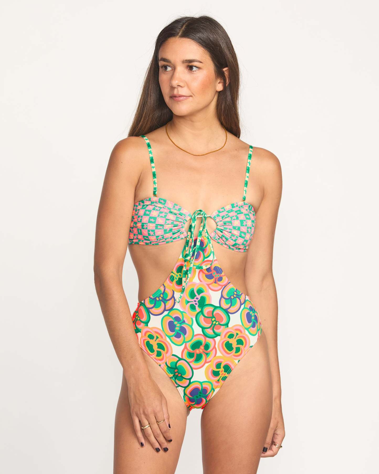 Our Billabong x Mami Wata Penny one-piece swimsuit—in a monokini cut—blends partially recycled nylon with stretchy elastane for a fabulous form-fitting look. Adjustable straps and a center tie allow you to find that perfect fit. Featuring collection prints and graphics that celebrate African surf culture.