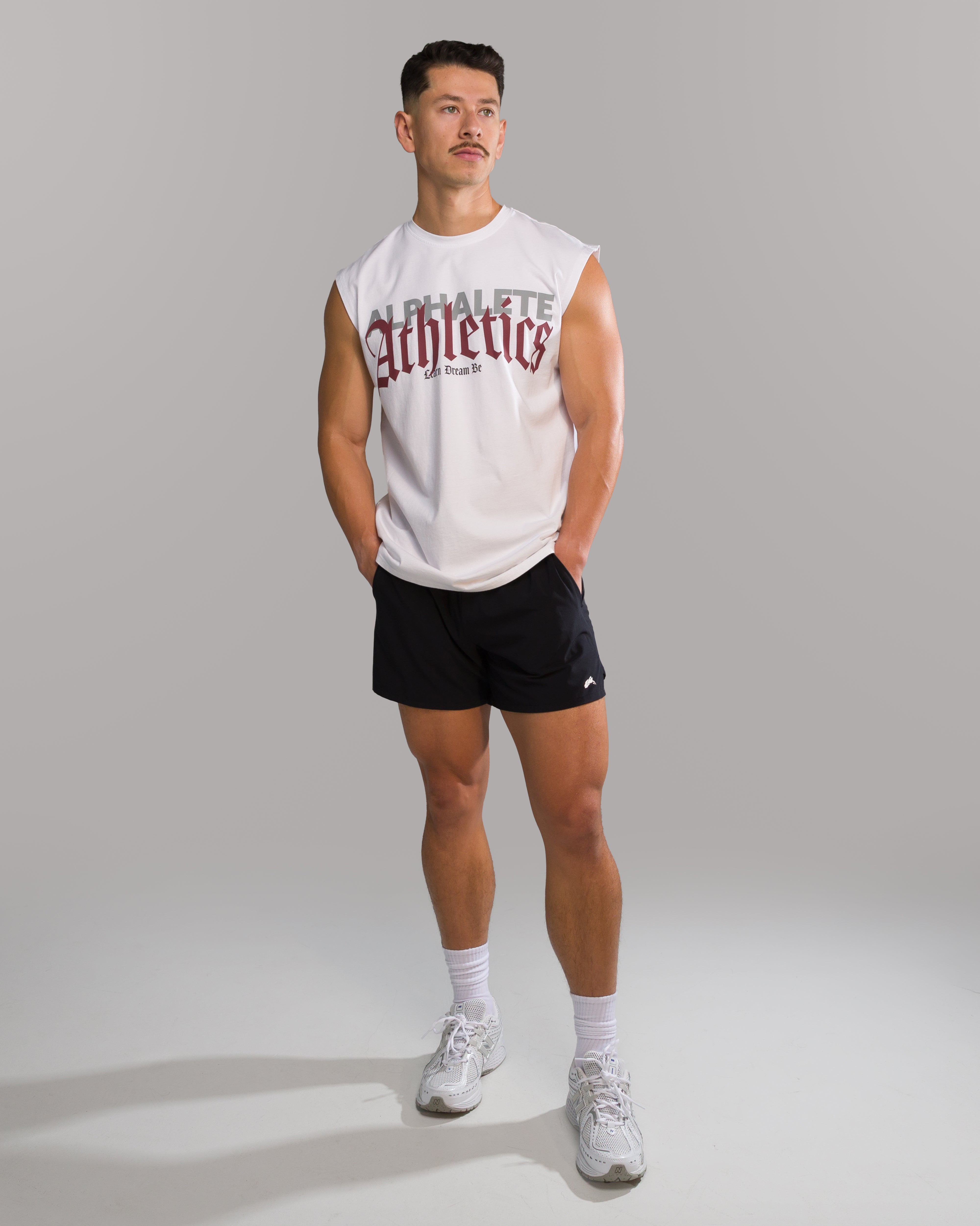 We’ve re-imagined a cut off through new fabric, proportions and garment dyeing. Our tank top offers sublimated branding on the front chest and features a low shoulder seam to enhance the traps. The wash treatment offers a nostalgic bodybuilding feeling while maintaining the original intention of the design which is to serve you on your fitness journey.