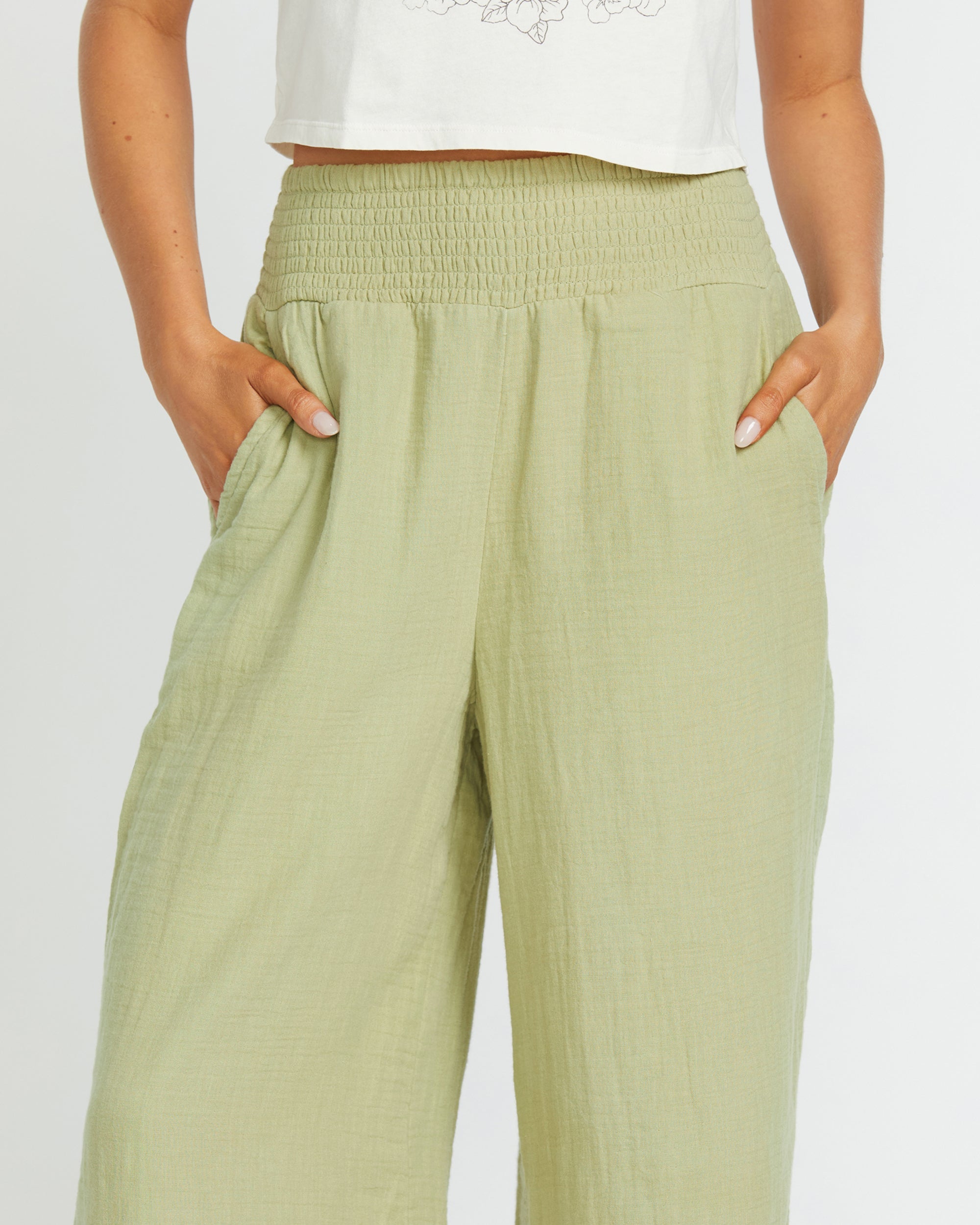 New Waves Gauze Elastic Waist Pants - Avocado