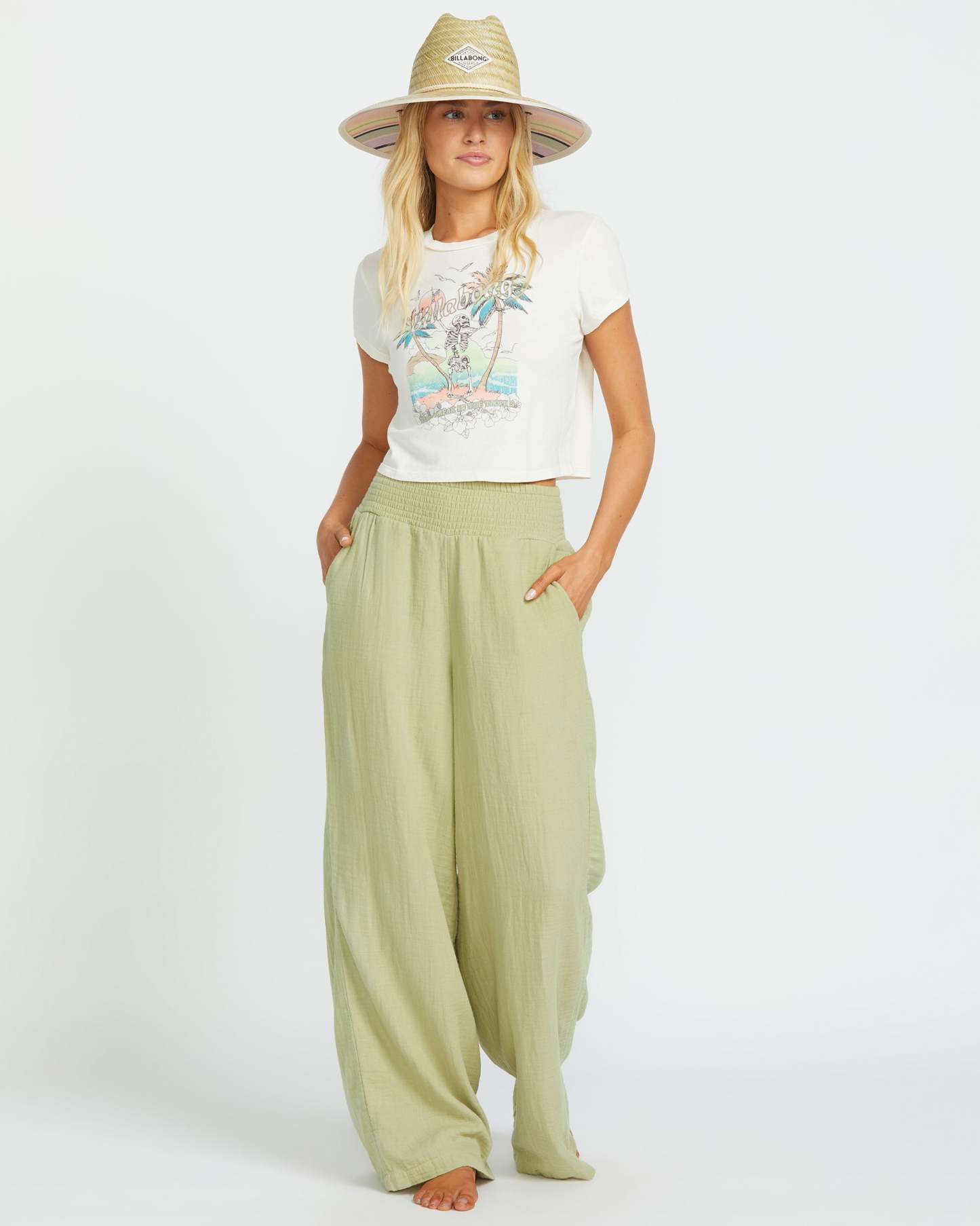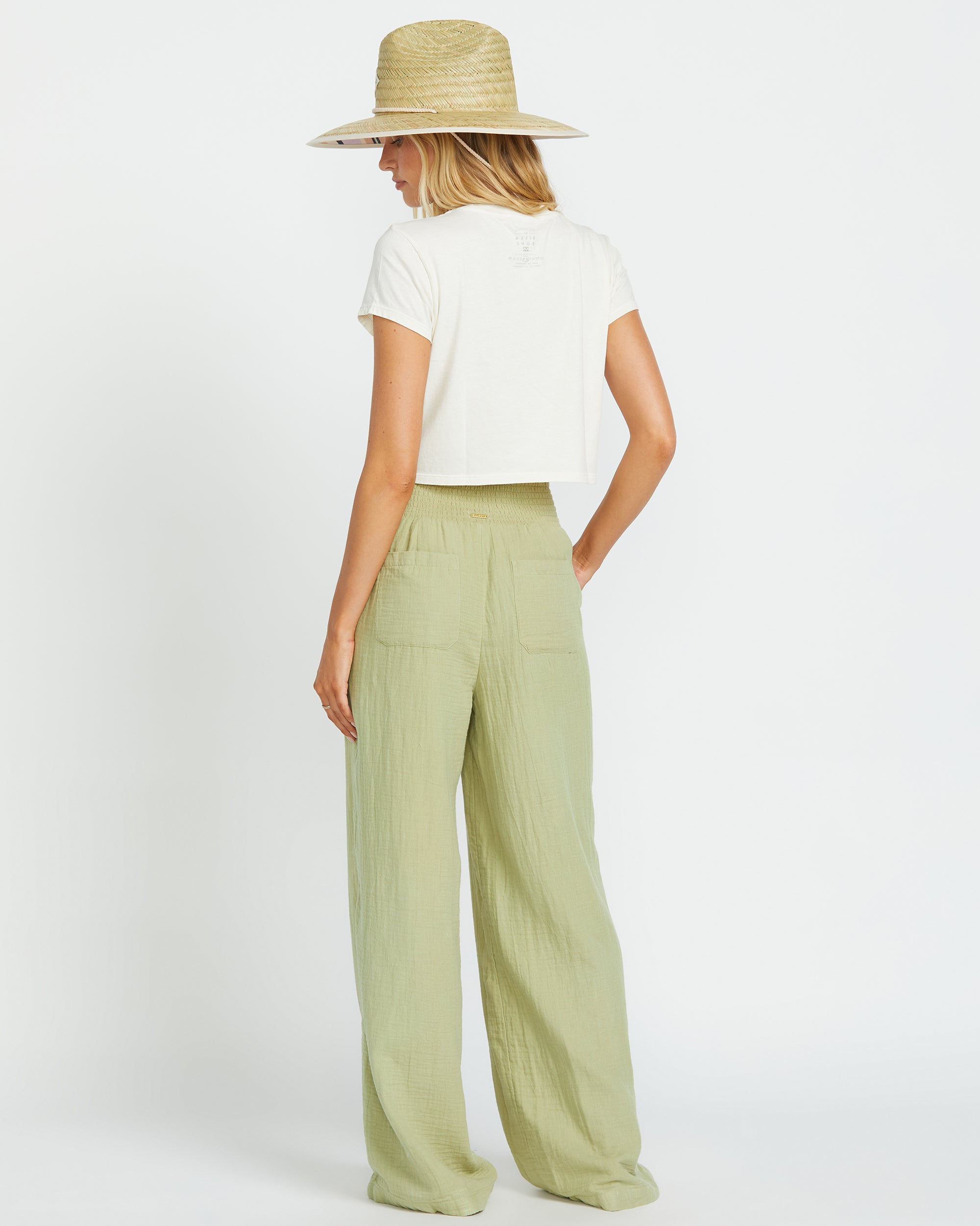Breathe easy in these soft, relaxed-fit gauze pants from Billabong Women. The 100% cotton double gauze fabric and smocked elastic waist keep you comfy while front slash pockets and back patch pockets stash your essentials. Wear them everywhere. 32" full length. Featured here in the Avocado colorway.