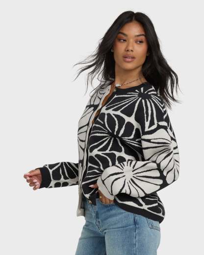 Cozy up in our relaxed-fit cardigan, crafted from soft jacquard fabric. The classic crew neckline and front button placket create a timeless look, while a sleek metal plate adds modern edge. Featured here in the Black colorway.