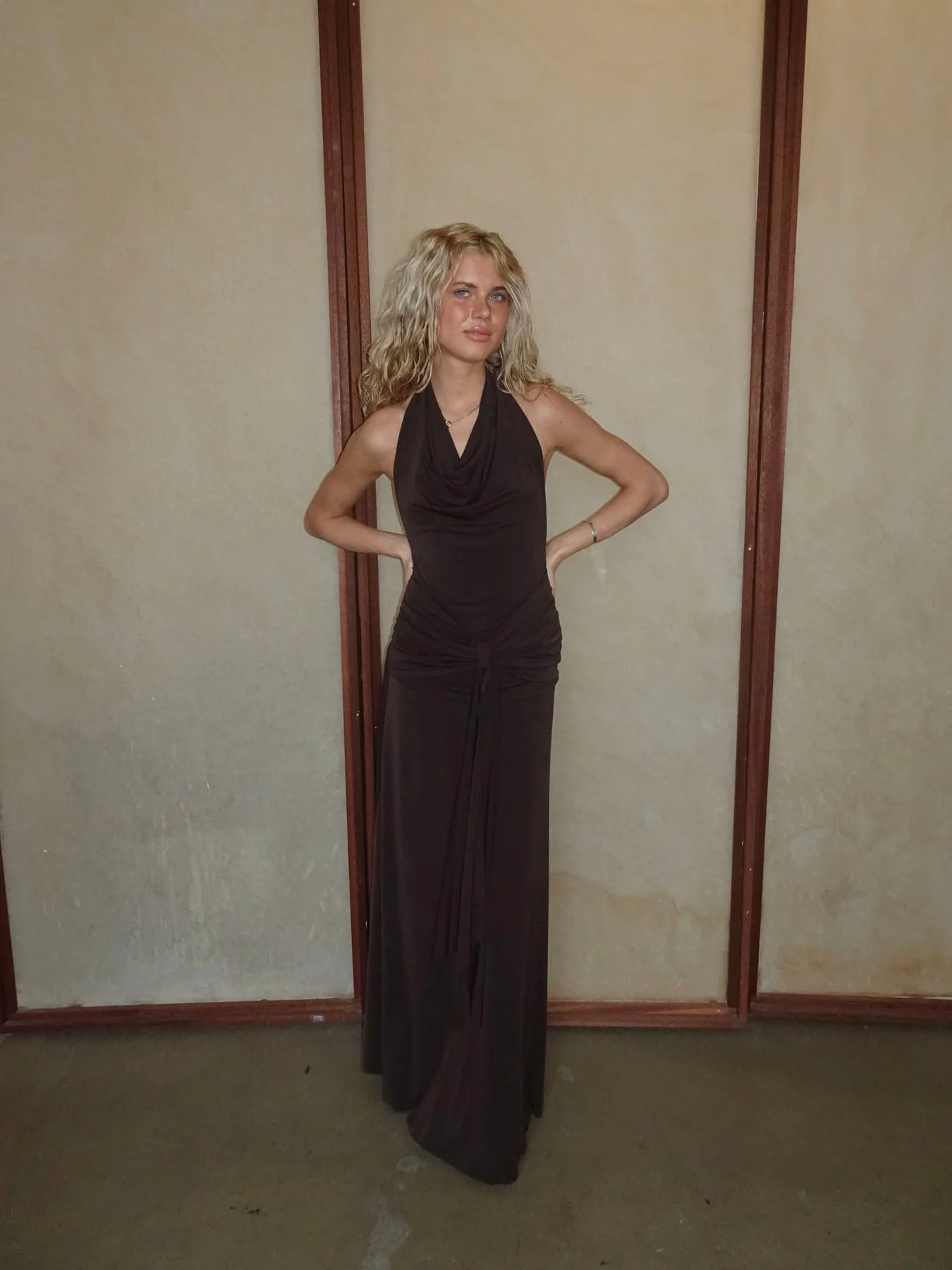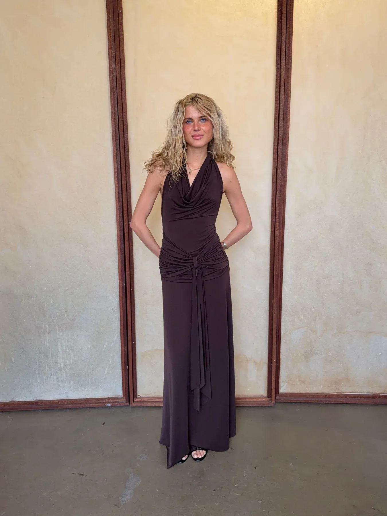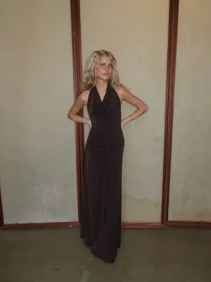 This beautiful maxi dress in a brown shade is the perfect combination of elegance and comfort. The dress is made from a soft, glossy, and lightly stretchable material that drapes beautifully along the body, creating a sophisticated look. The striking draping at the waist flatters the figure, while the wide tie belt allows you to adjust the fit and create a feminine silhouette.