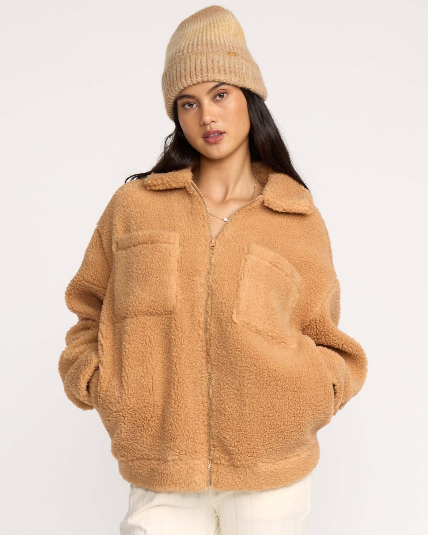 Our cozy sherpa shacket brings oversized comfort to chilly days. Zip up and stuff your essentials in the chest and on-seam pockets, then adjust the cuffs for that perfect fit. Featured here in the Beige colorway.