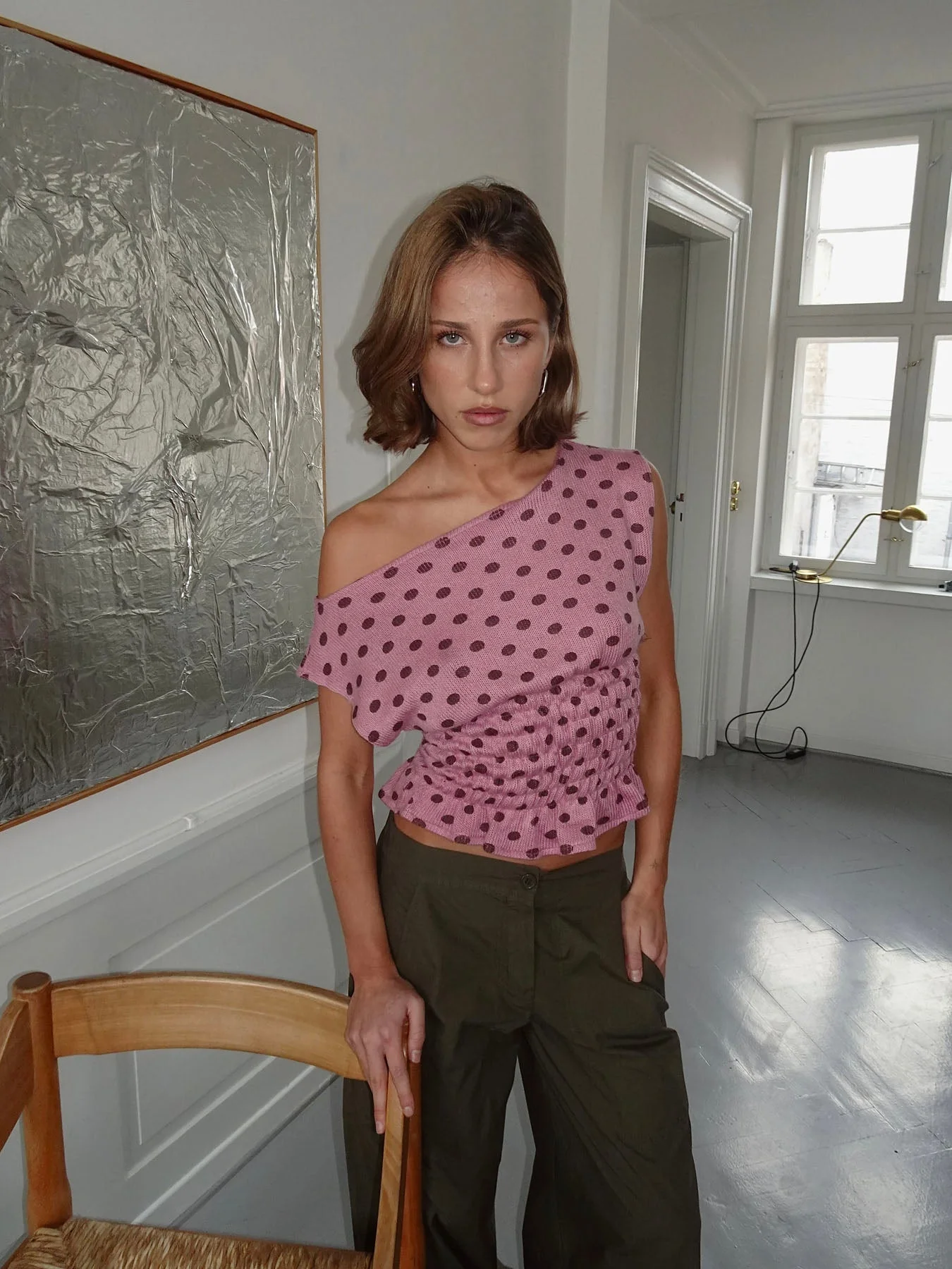 A feminine top with a playful dotted pattern. The top is knitted in a soft, lightweight quality and features elastic ruching details that create a flattering fit and a modern look. The white base with brown dots makes it easy to style with jeans, skirts, or shorts. Perfect for both everyday wear and more festive occasions.