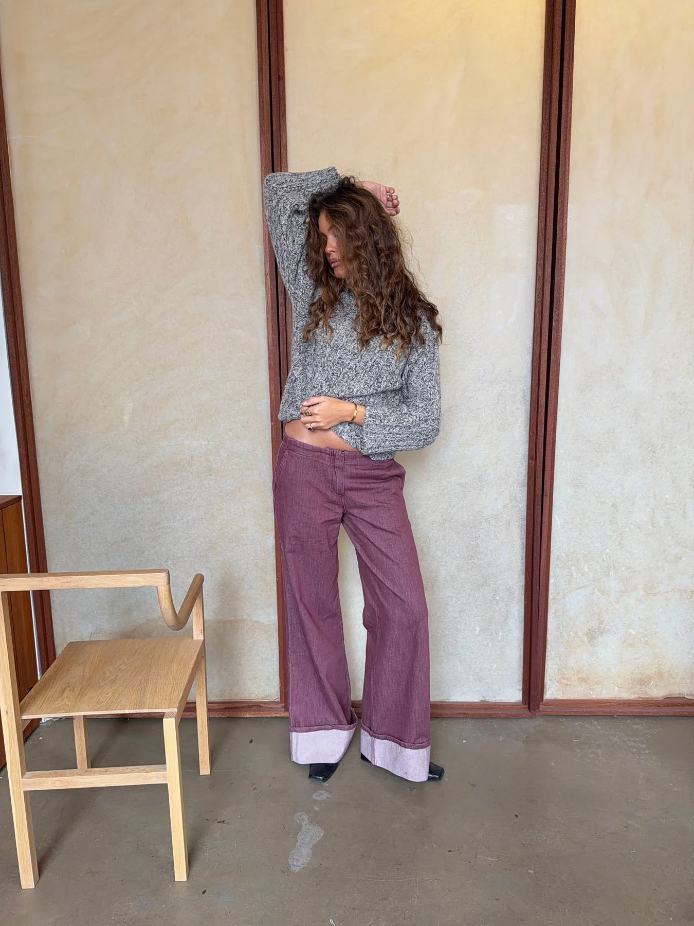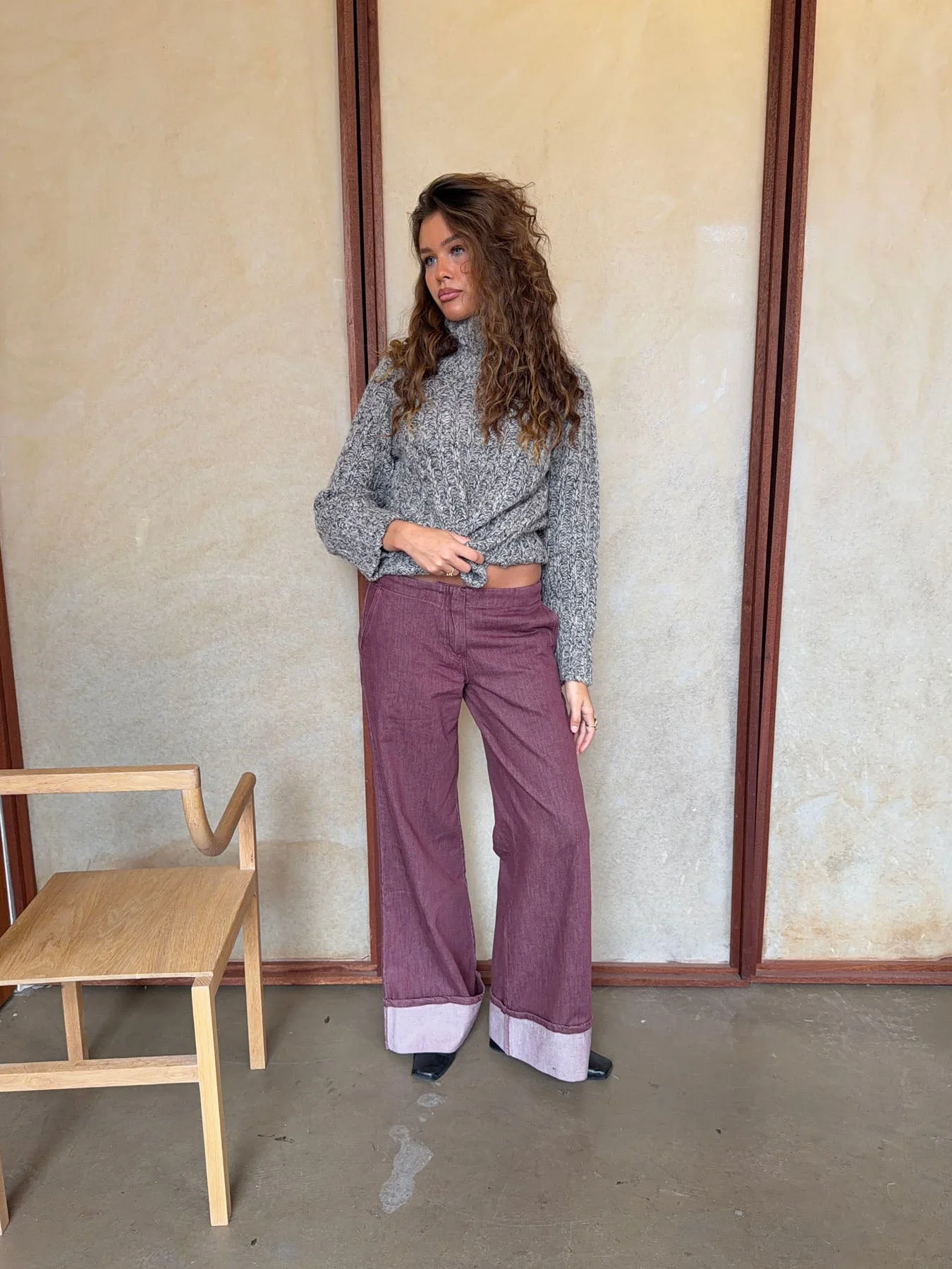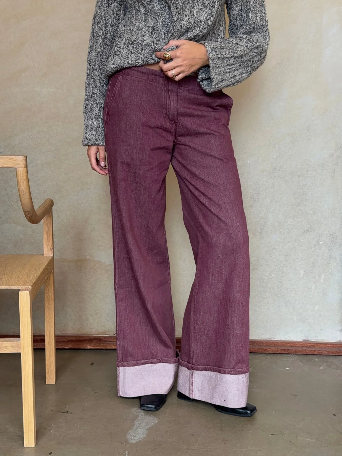These jeans in a beautiful burgundy shade combine relaxed comfort with a clean, stylish look. Made from a soft, slightly stretchy material, they ensure a comfortable fit and full freedom of movement. The loose-fitting legs create a modern and laid-back silhouette, while the defined waist provides a flattering shape. A subtle fold at the hem adds a discreet, sophisticated touch. Perfect for both everyday wear and more polished outfits.