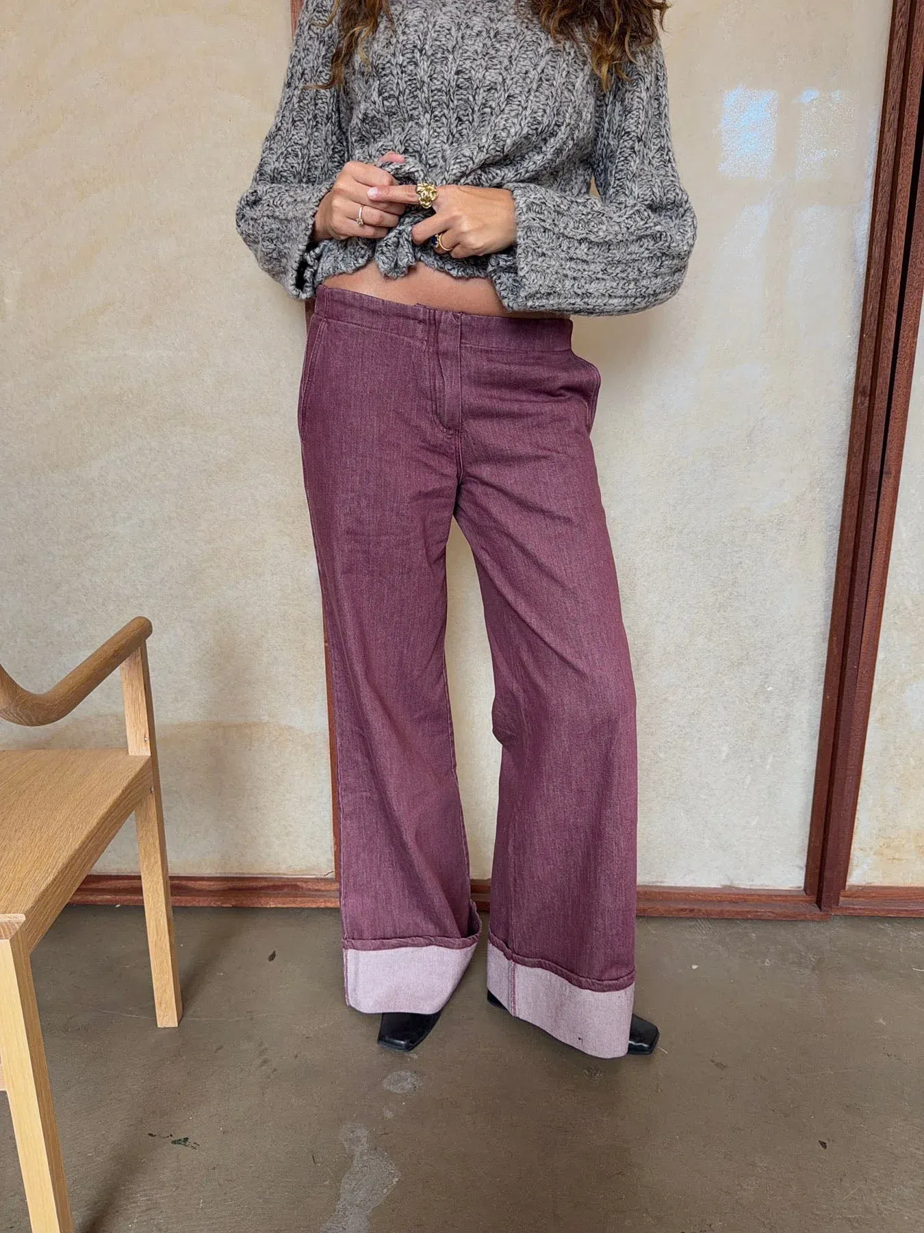 These jeans in a beautiful burgundy shade combine relaxed comfort with a clean, stylish look. Made from a soft, slightly stretchy material, they ensure a comfortable fit and full freedom of movement. The loose-fitting legs create a modern and laid-back silhouette, while the defined waist provides a flattering shape. A subtle fold at the hem adds a discreet, sophisticated touch. Perfect for both everyday wear and more polished outfits.