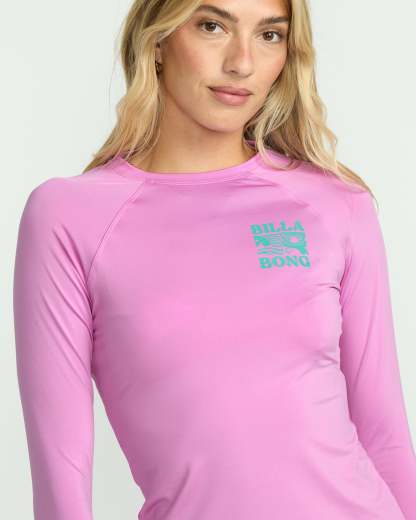 Our women's rashguard sports a brilliant bright rose hue, lightweight stretch fabric and UPF 50 sun protection for beach days. This long sleeve rashguard's fitted style and logo detailing elevate ocean style.